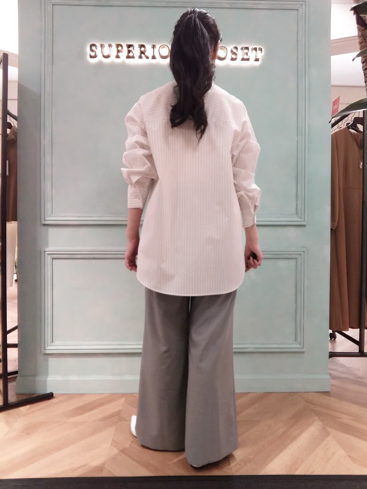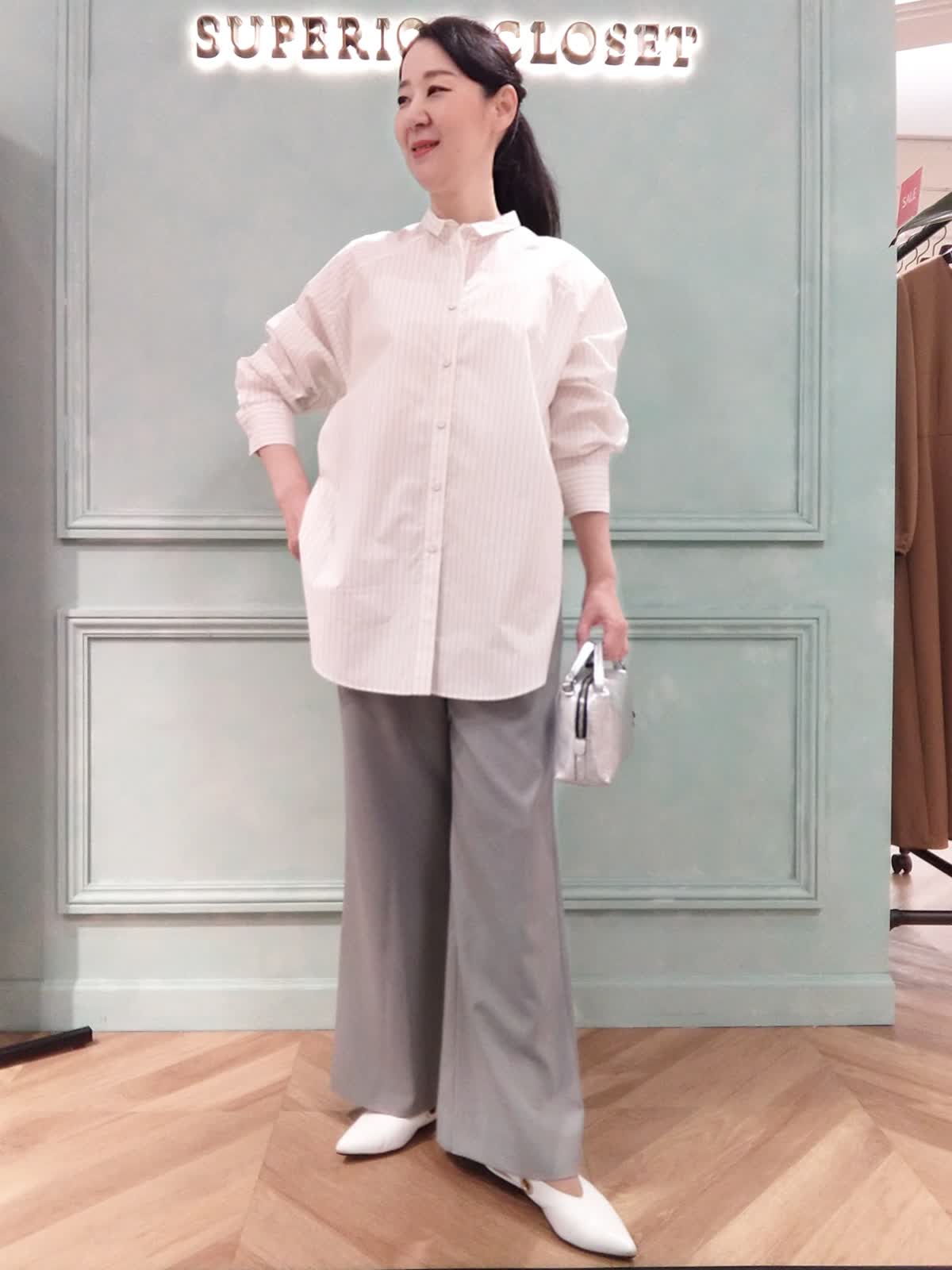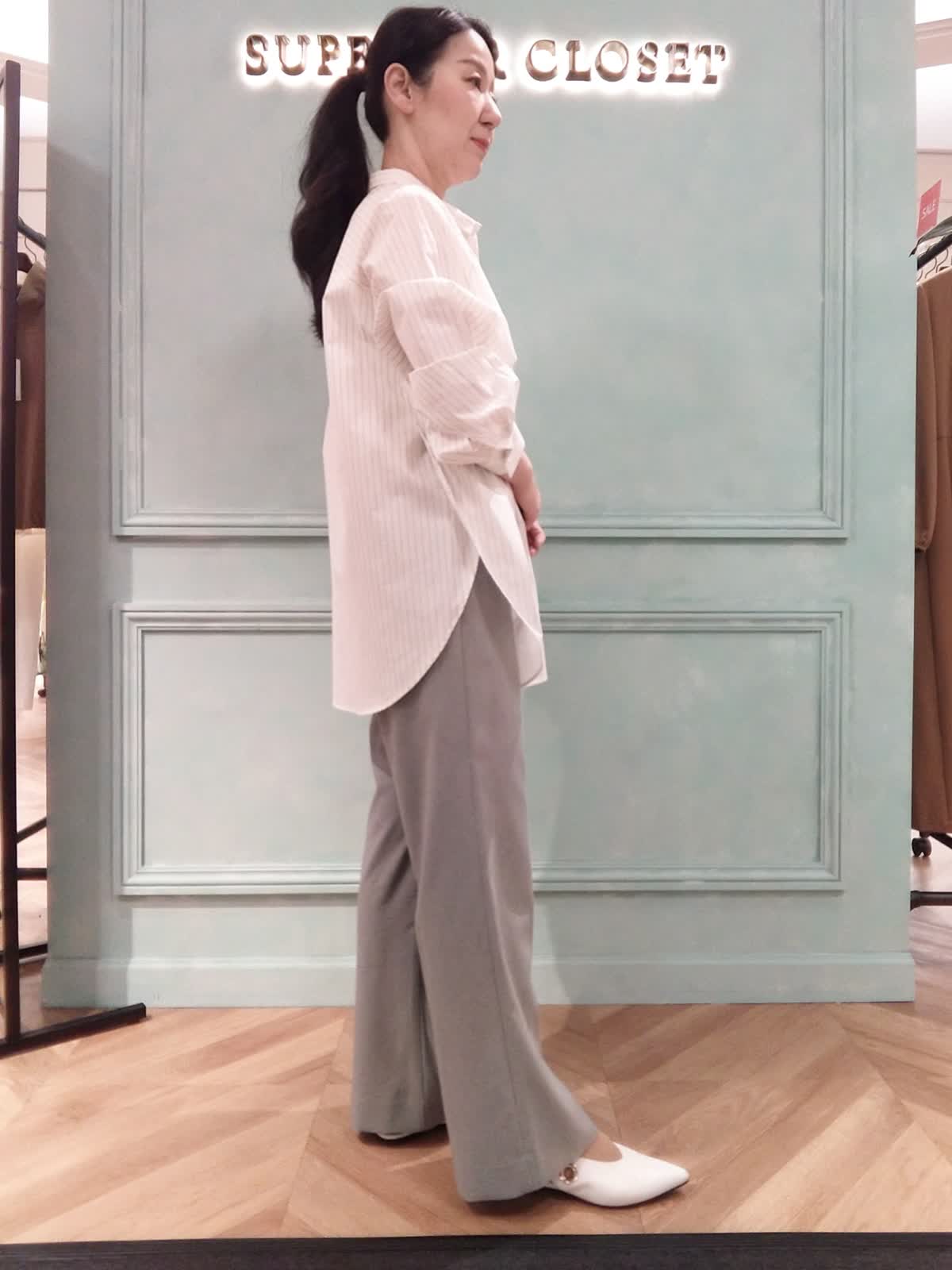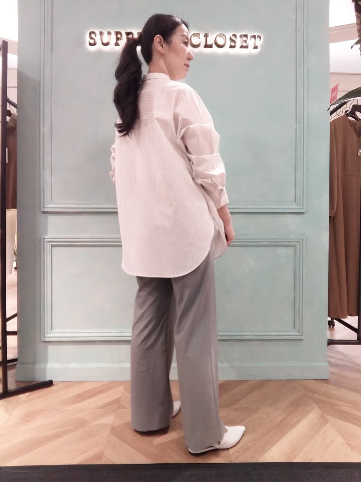 【着用サイズ】ブラウス:フリー、パンツ:9号 【着用カラー】ブラウス:オフホワイト、パンツ:グレー きれいに見えてラクな着心地、リラックススタイル。きちんと見えする、ストライプのロングシャツとラクな履き心地のイージーパンツのコーディネート。シャツの小さめ衿元はスタンドカラーにもなります。サイドか深めのスリットでデザイン性があり、暑い時期に風通りがよく快適に着られます。パンツは裏地なしで肌離れがよく、脚のラインを拾わずにストンと落ちるシルエットです。