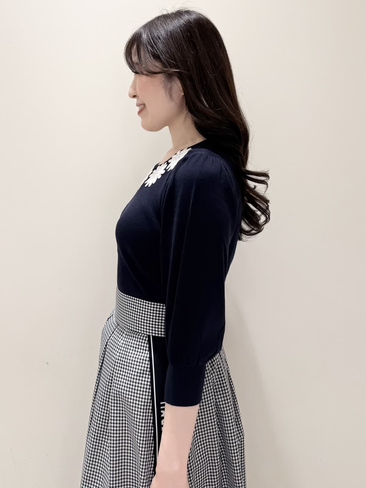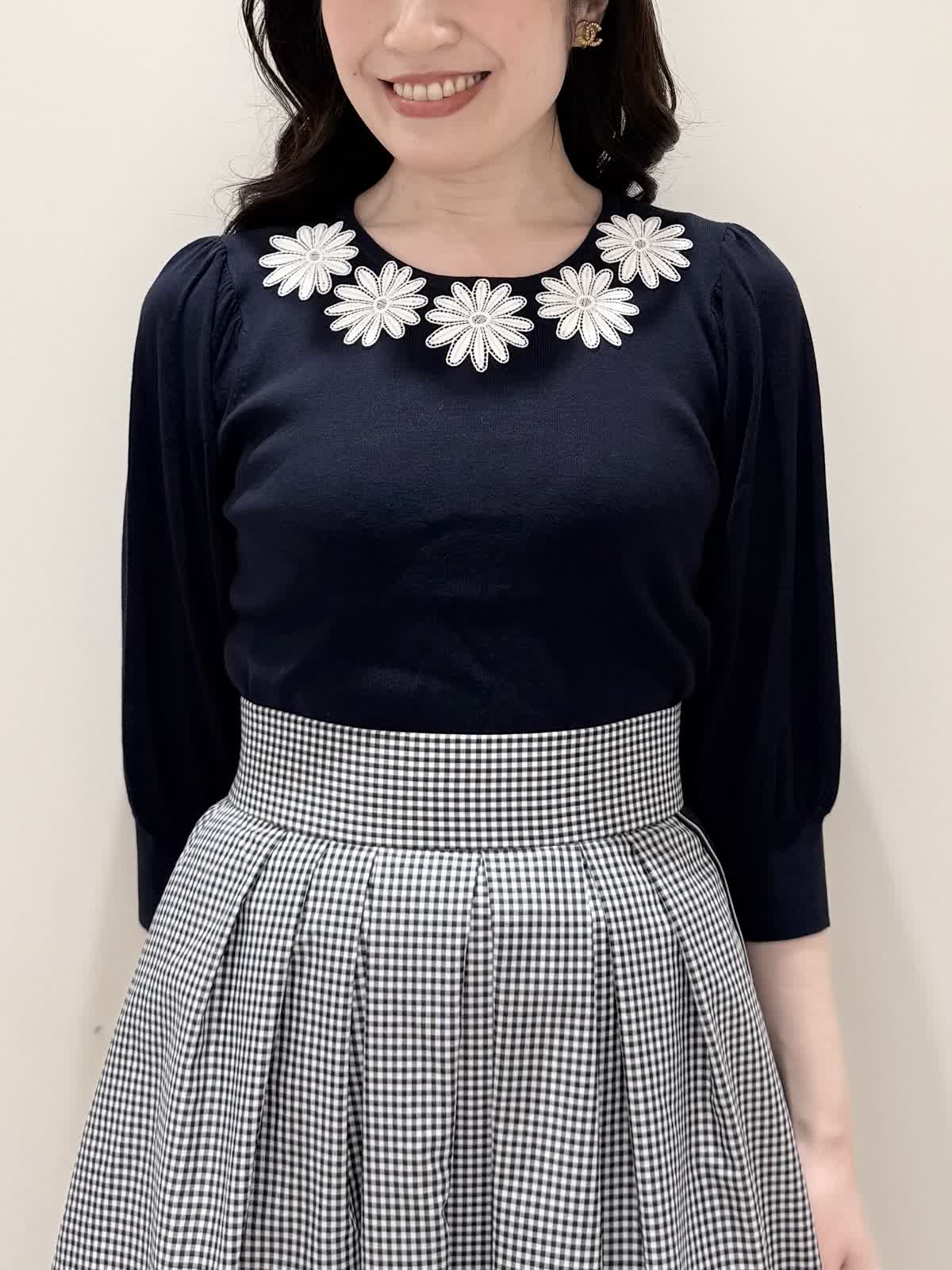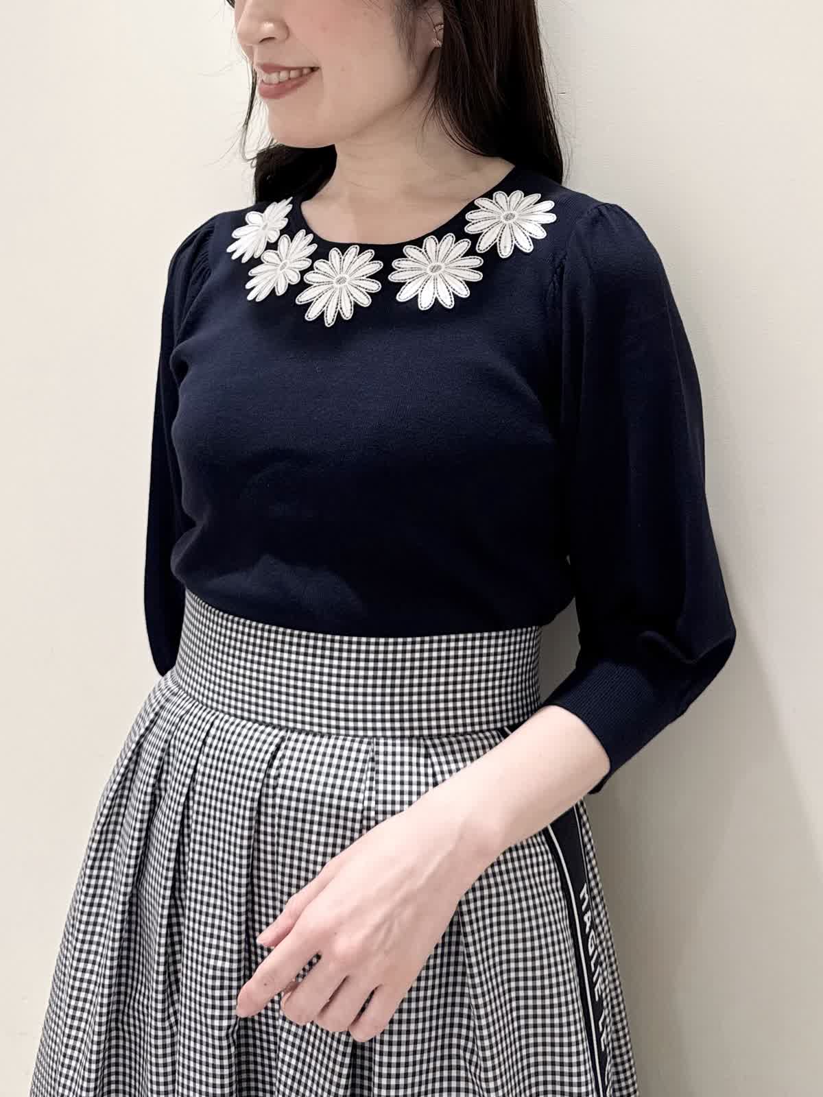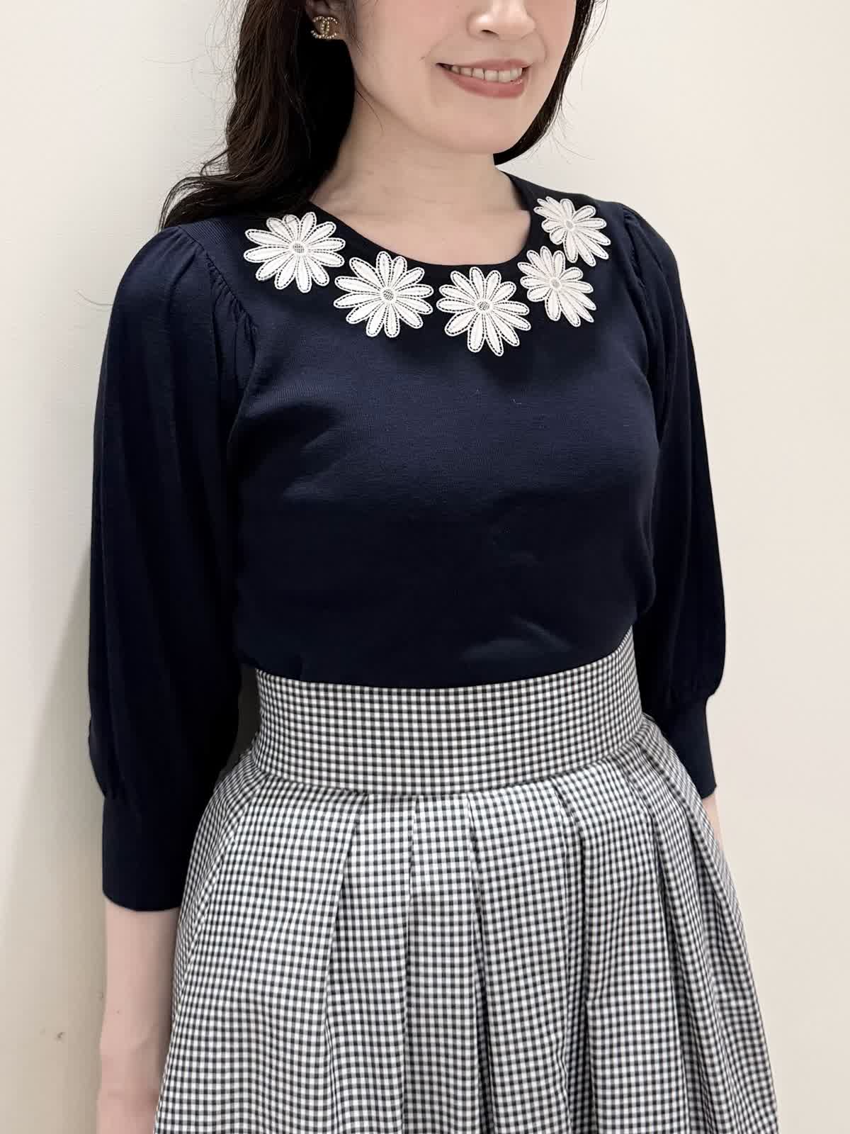 【着用サイズ/カラー】ニット:7号/ネイビー スカート:7号/格子 着映えするフラワーモチーフが可愛いニット。羽織いらずで1枚で着やすい7分袖でインナー使いにもおすすめ。薄手のサラモチ生地が袖通り良く着心地◎ スカートは左側に『MAGLIE LE CASSETTO』ロゴテープがポイント。後ろギャザー仕様のゴムで履き心地◎ ハイウエストになるので程よいゆとりが欲しい方はいつもより1サイズ大きめでも◯シワになりにくく、サラサラとした生地でふわっと軽い着心地。裏地が少し短めなので、裾の抜け感が綺麗です。
