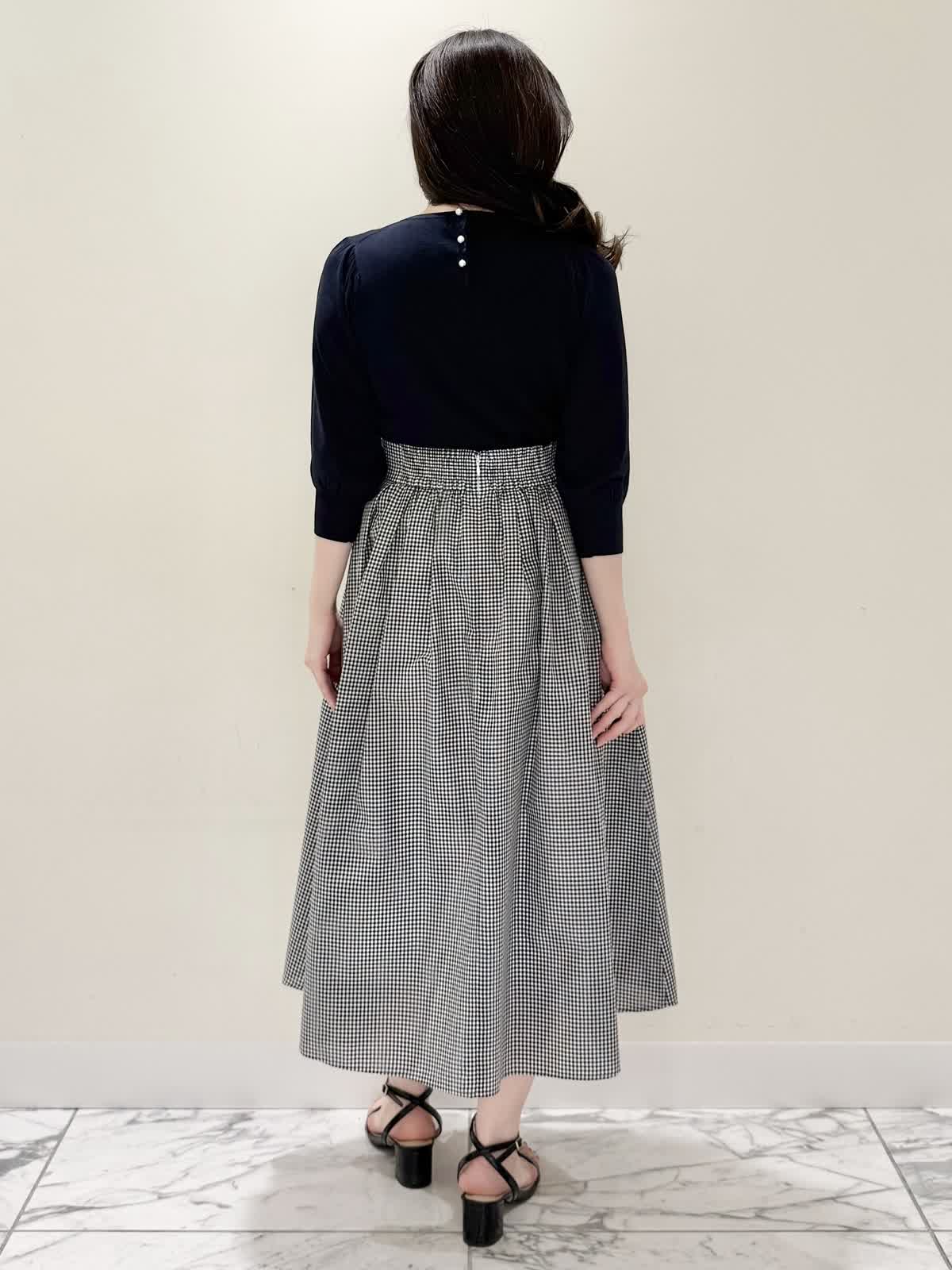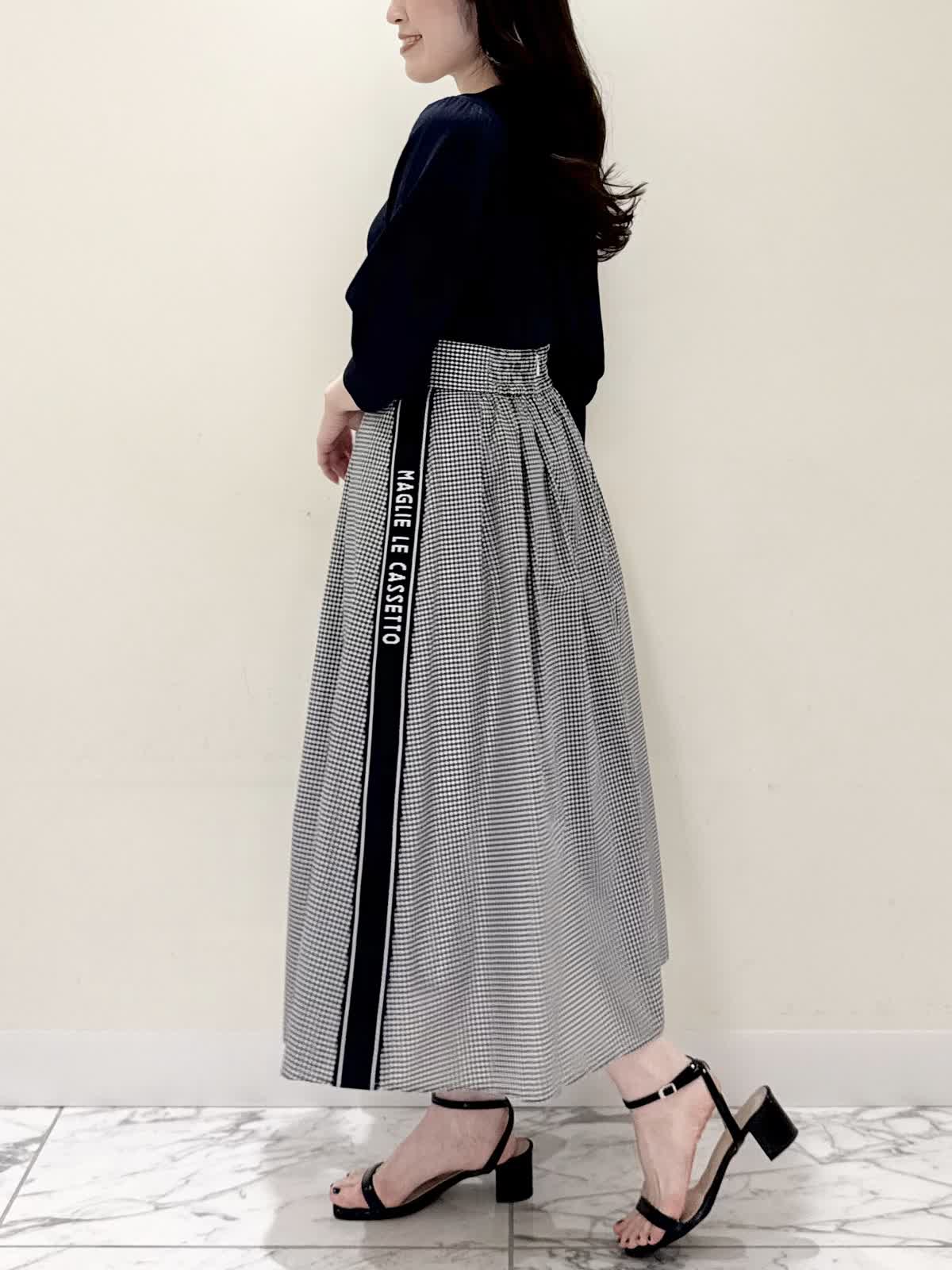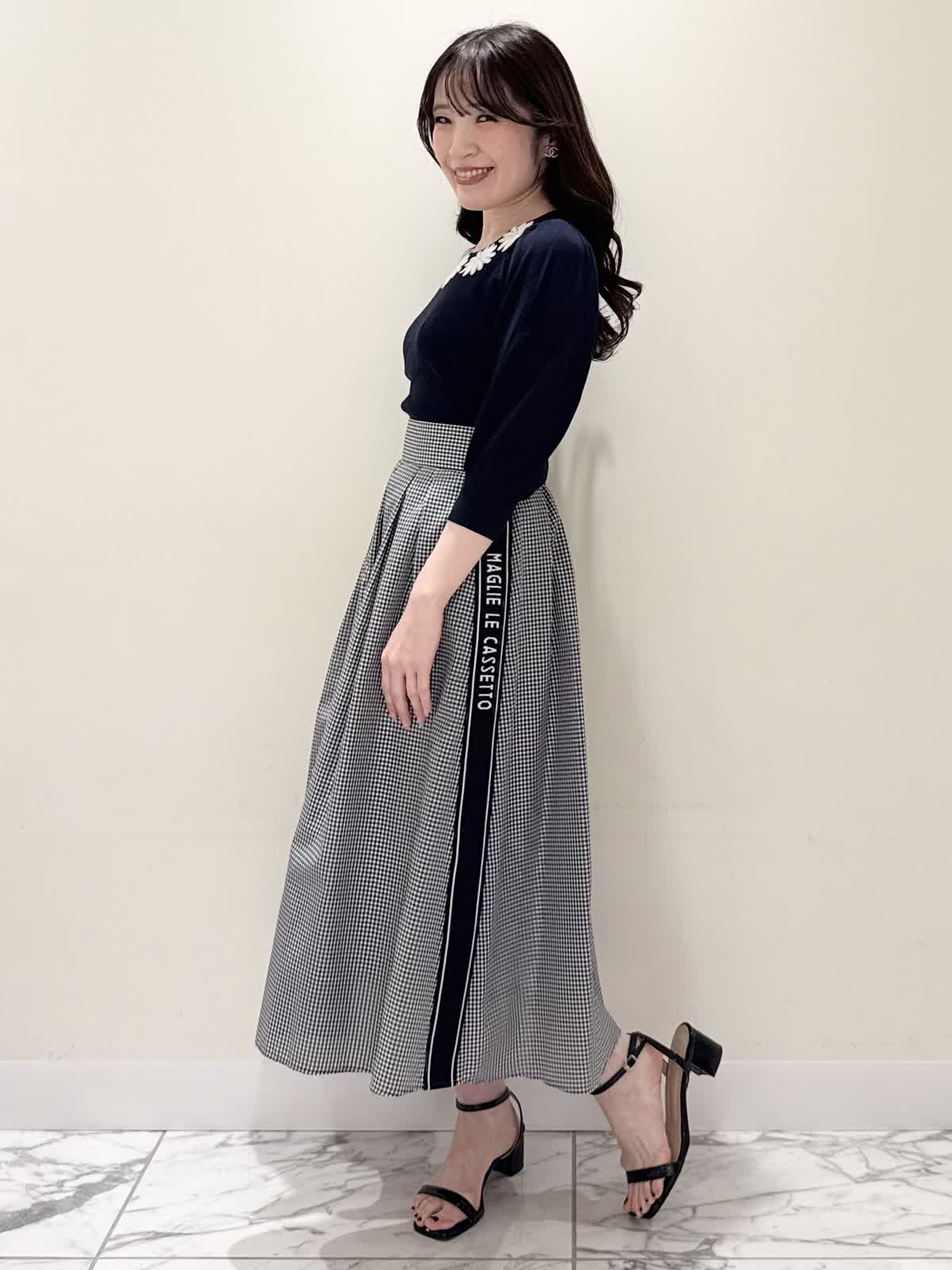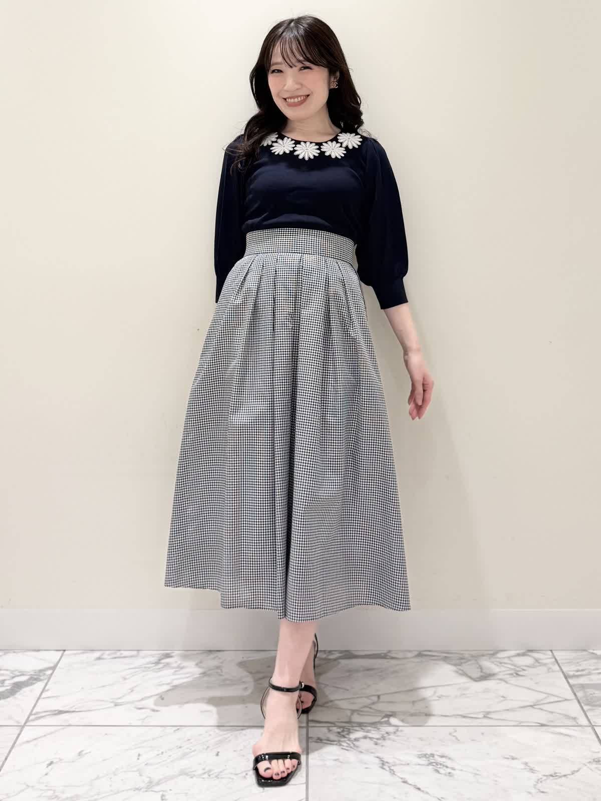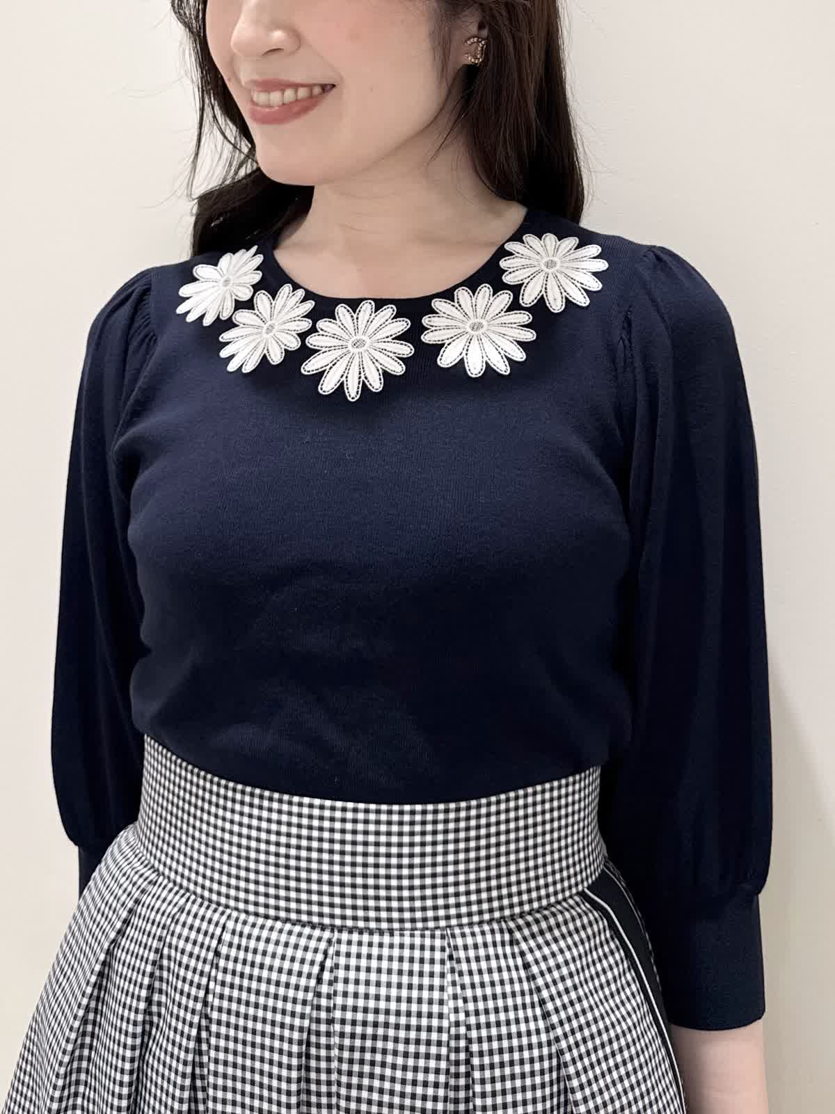 【着用サイズ/カラー】ニット:7号/ネイビー スカート:7号/格子 着映えするフラワーモチーフが可愛いニット。羽織いらずで1枚で着やすい7分袖でインナー使いにもおすすめ。薄手のサラモチ生地が袖通り良く着心地◎ スカートは左側に『MAGLIE LE CASSETTO』ロゴテープがポイント。後ろギャザー仕様のゴムで履き心地◎ ハイウエストになるので程よいゆとりが欲しい方はいつもより1サイズ大きめでも◯シワになりにくく、サラサラとした生地でふわっと軽い着心地。裏地が少し短めなので、裾の抜け感が綺麗です。