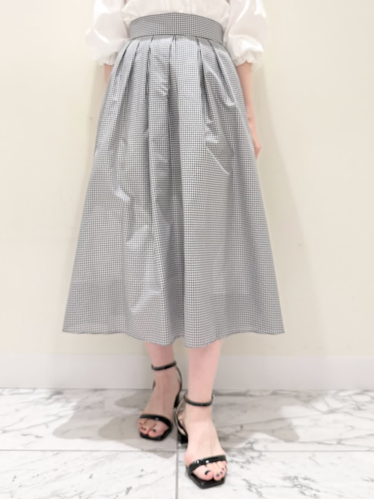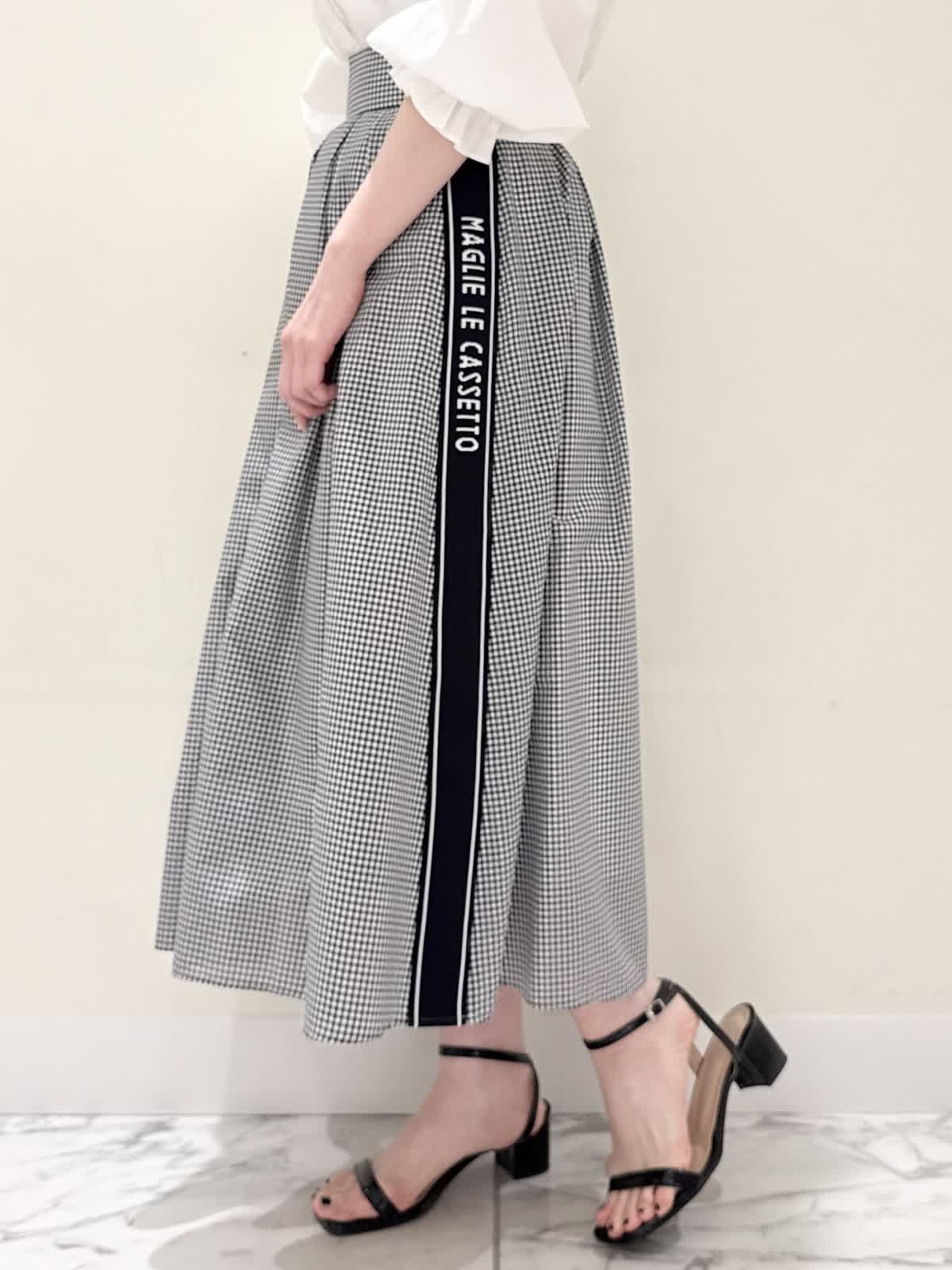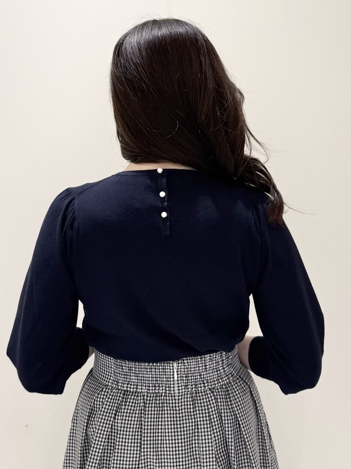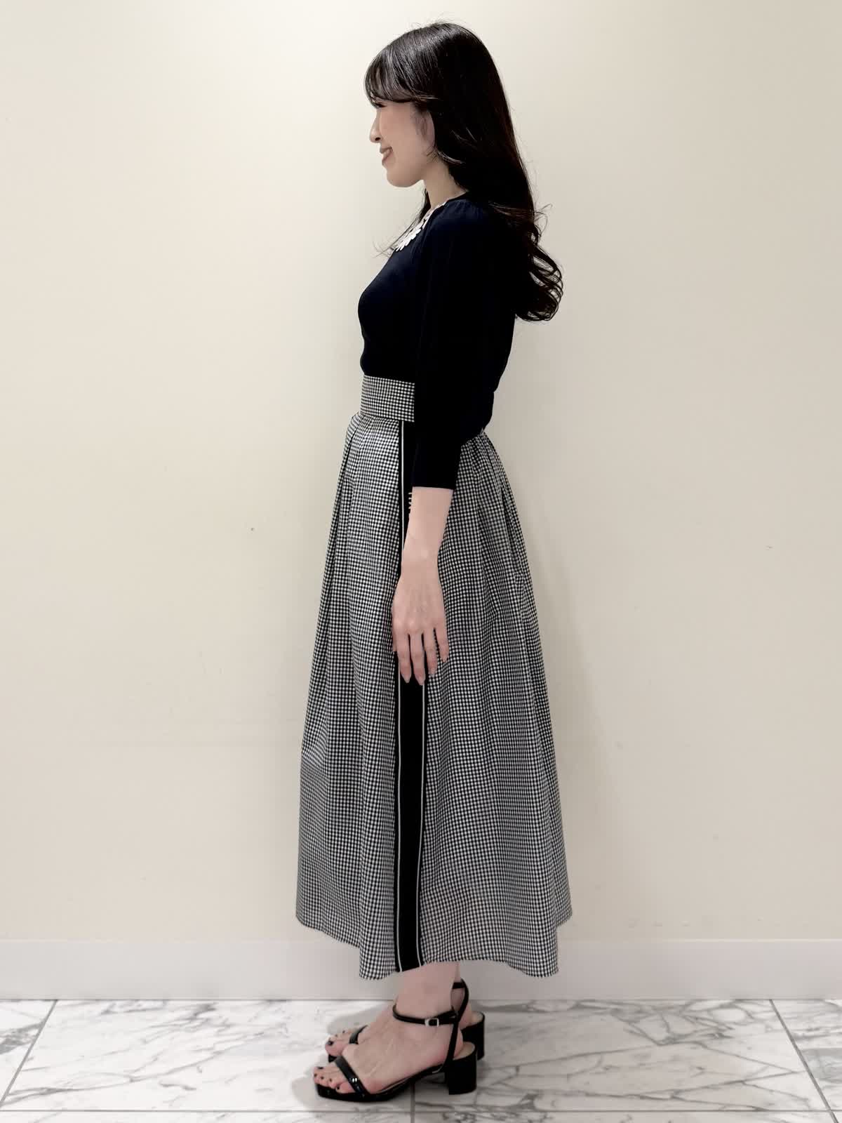 【着用サイズ/カラー】ニット:7号/ネイビー スカート:7号/格子 着映えするフラワーモチーフが可愛いニット。羽織いらずで1枚で着やすい7分袖でインナー使いにもおすすめ。薄手のサラモチ生地が袖通り良く着心地◎ スカートは左側に『MAGLIE LE CASSETTO』ロゴテープがポイント。後ろギャザー仕様のゴムで履き心地◎ ハイウエストになるので程よいゆとりが欲しい方はいつもより1サイズ大きめでも◯シワになりにくく、サラサラとした生地でふわっと軽い着心地。裏地が少し短めなので、裾の抜け感が綺麗です。