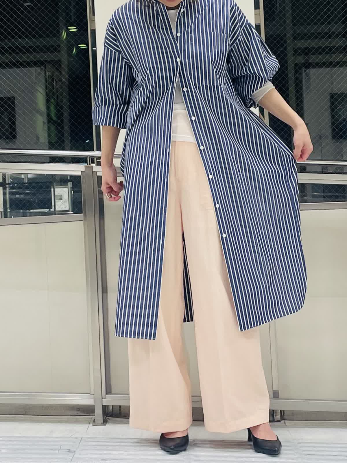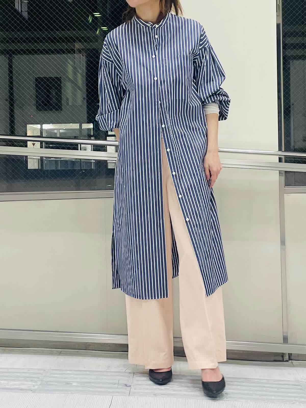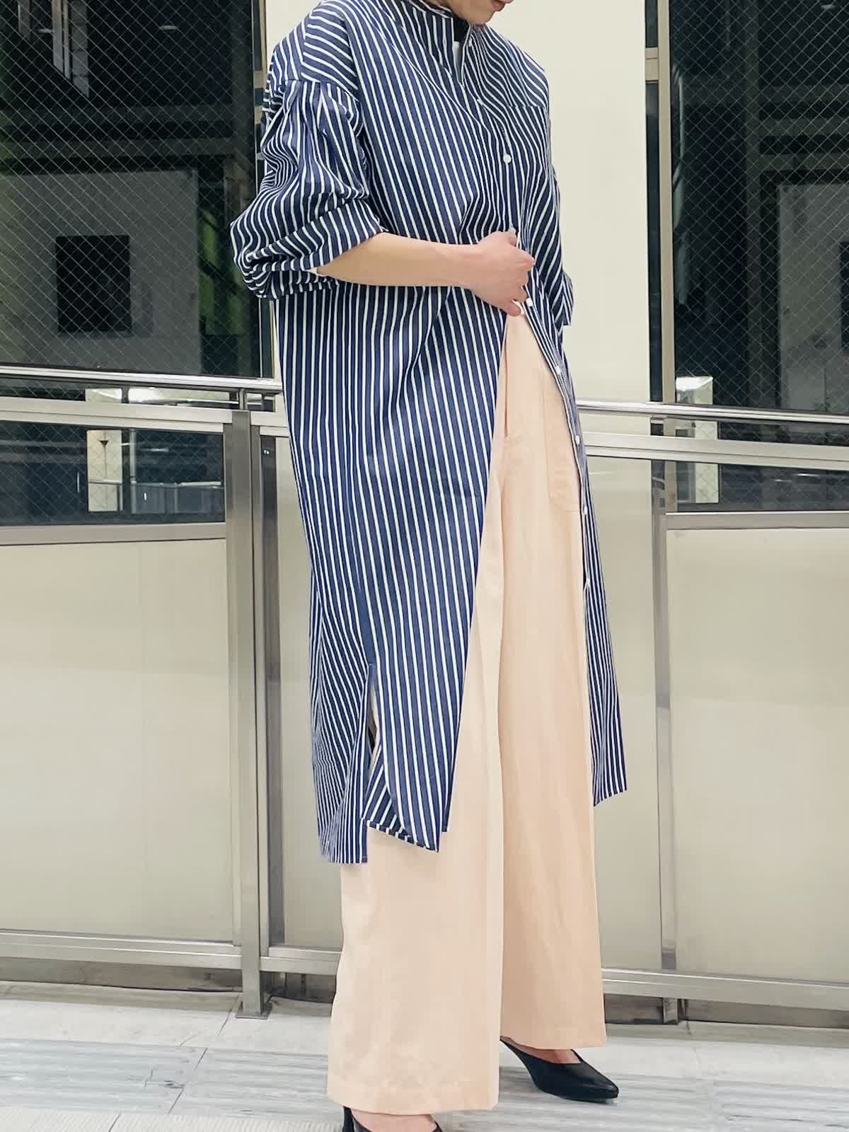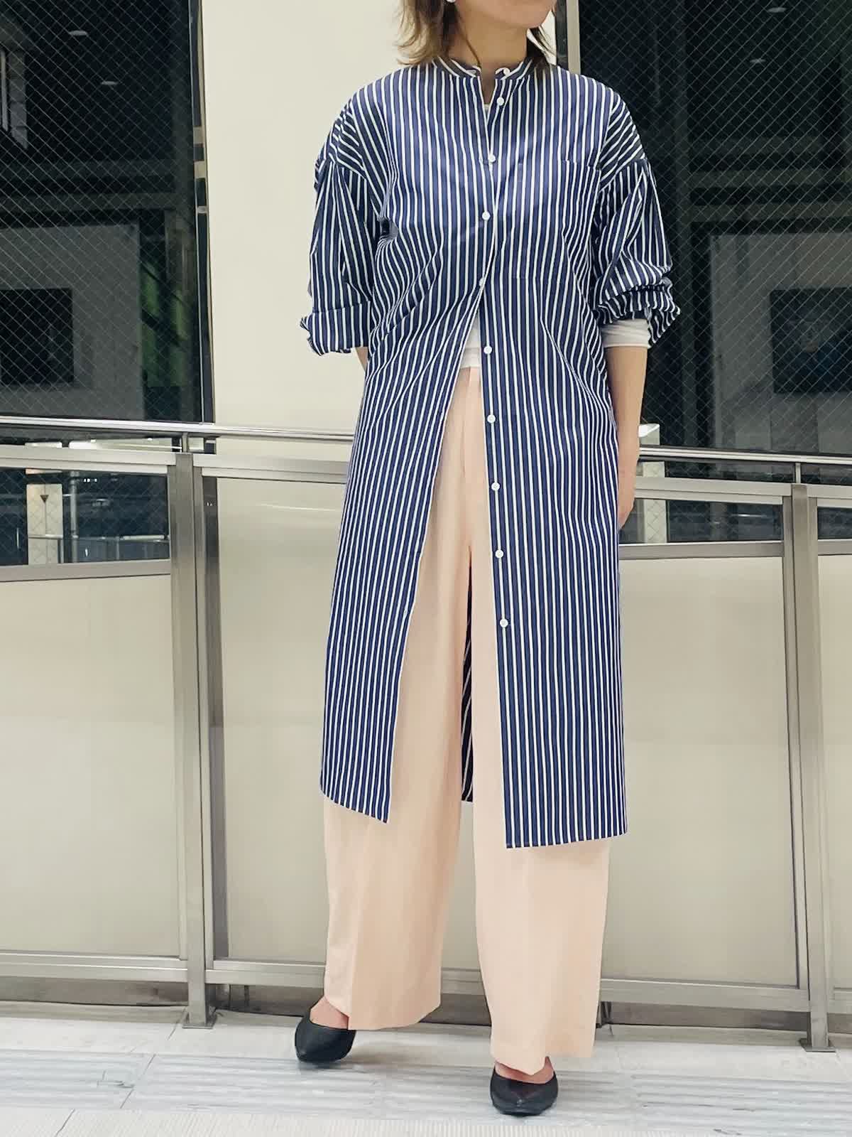 【着用サイズ/カラー】ストライプブラウスネイビー:フリーサイズ インナーホワイト:9号サイズ パンツピンク 袖ゴムが嬉しいストライプロングブラウス。 羽織りとしても活用しやすいハリ感。スリット入りで足捌きがよく、 スカートやワンピース合わせも◎。 ストライプはきちんと感があるのでボトムスはカジュアルも合わせやすくておすすめです。