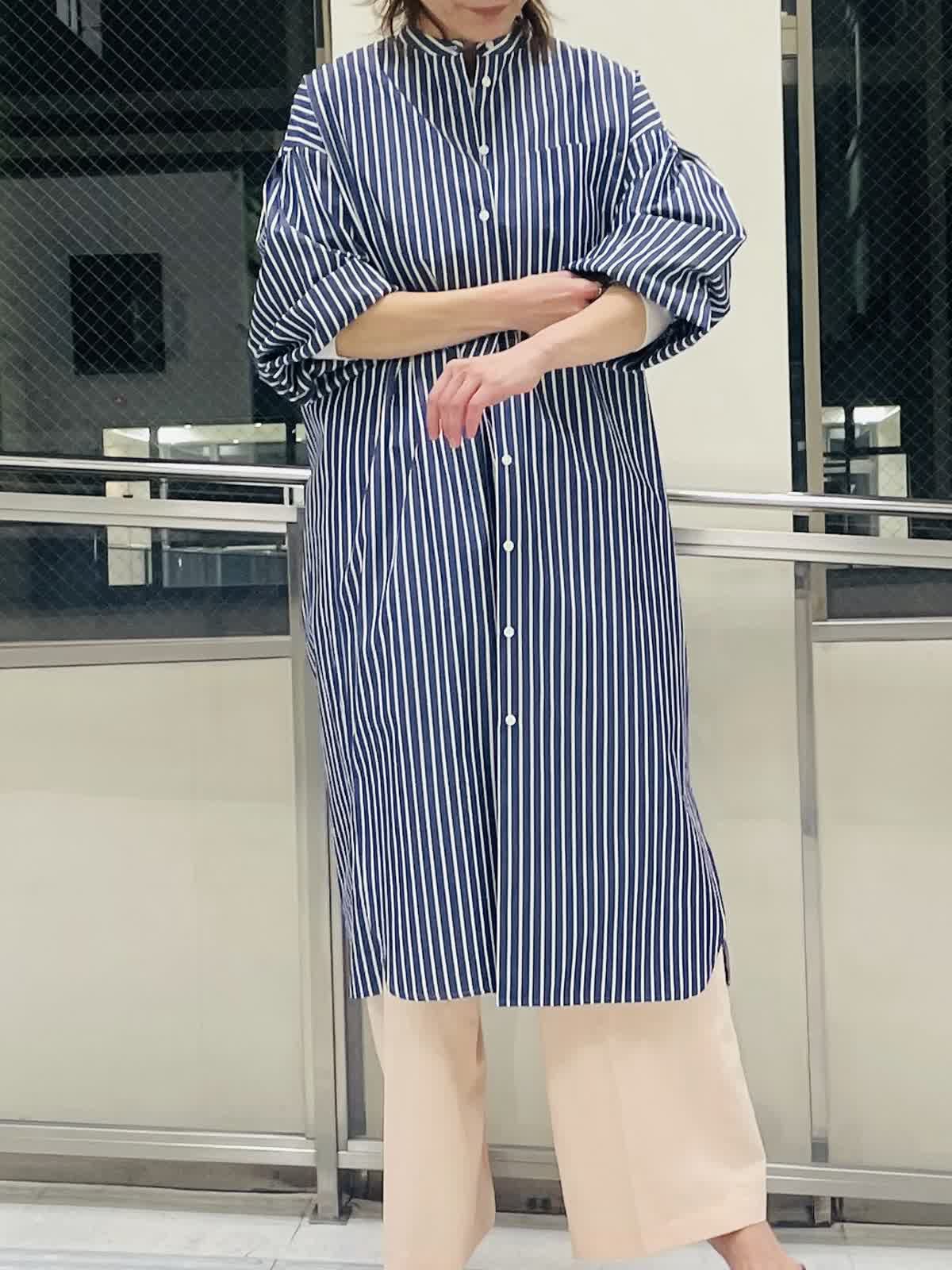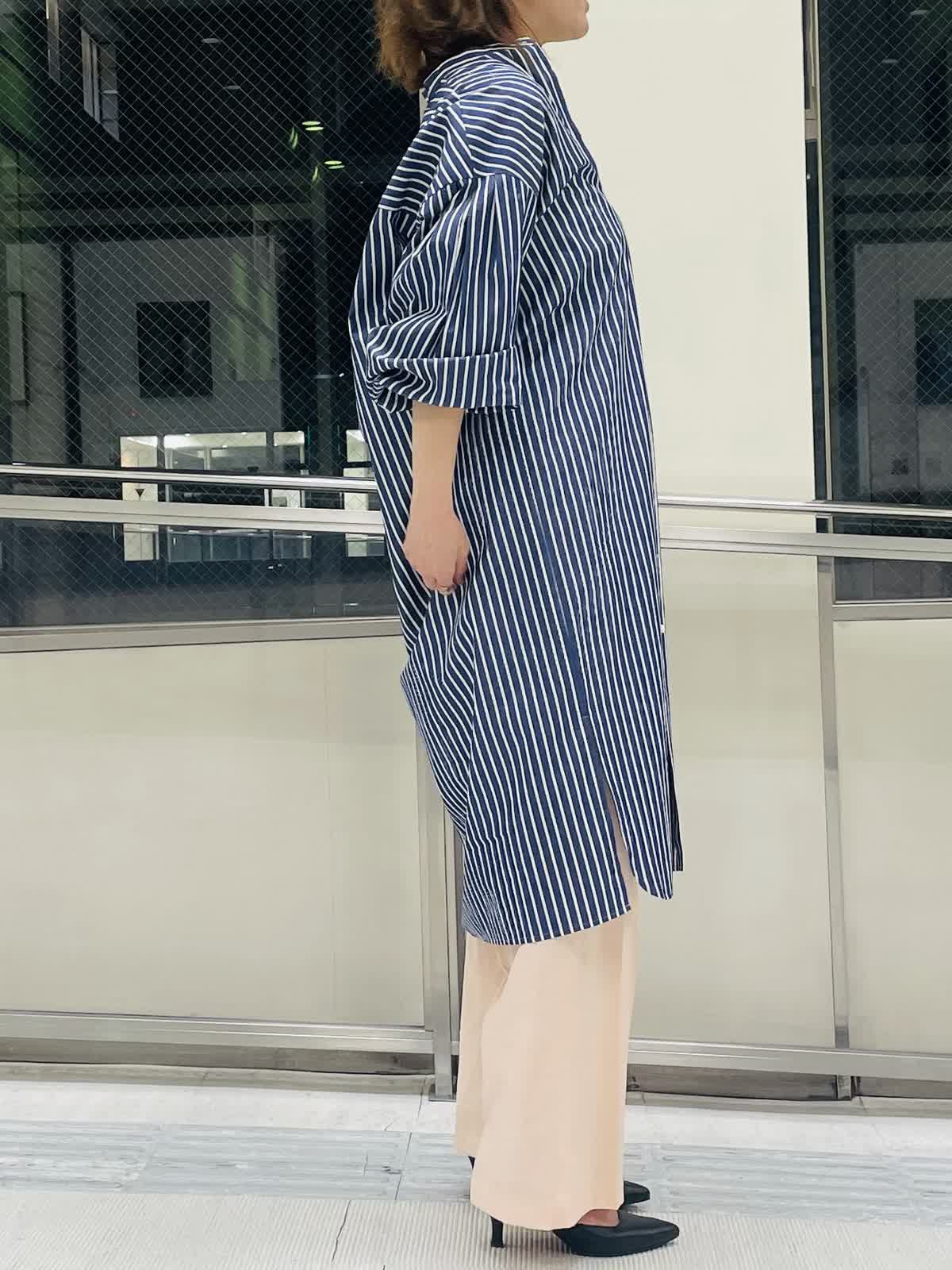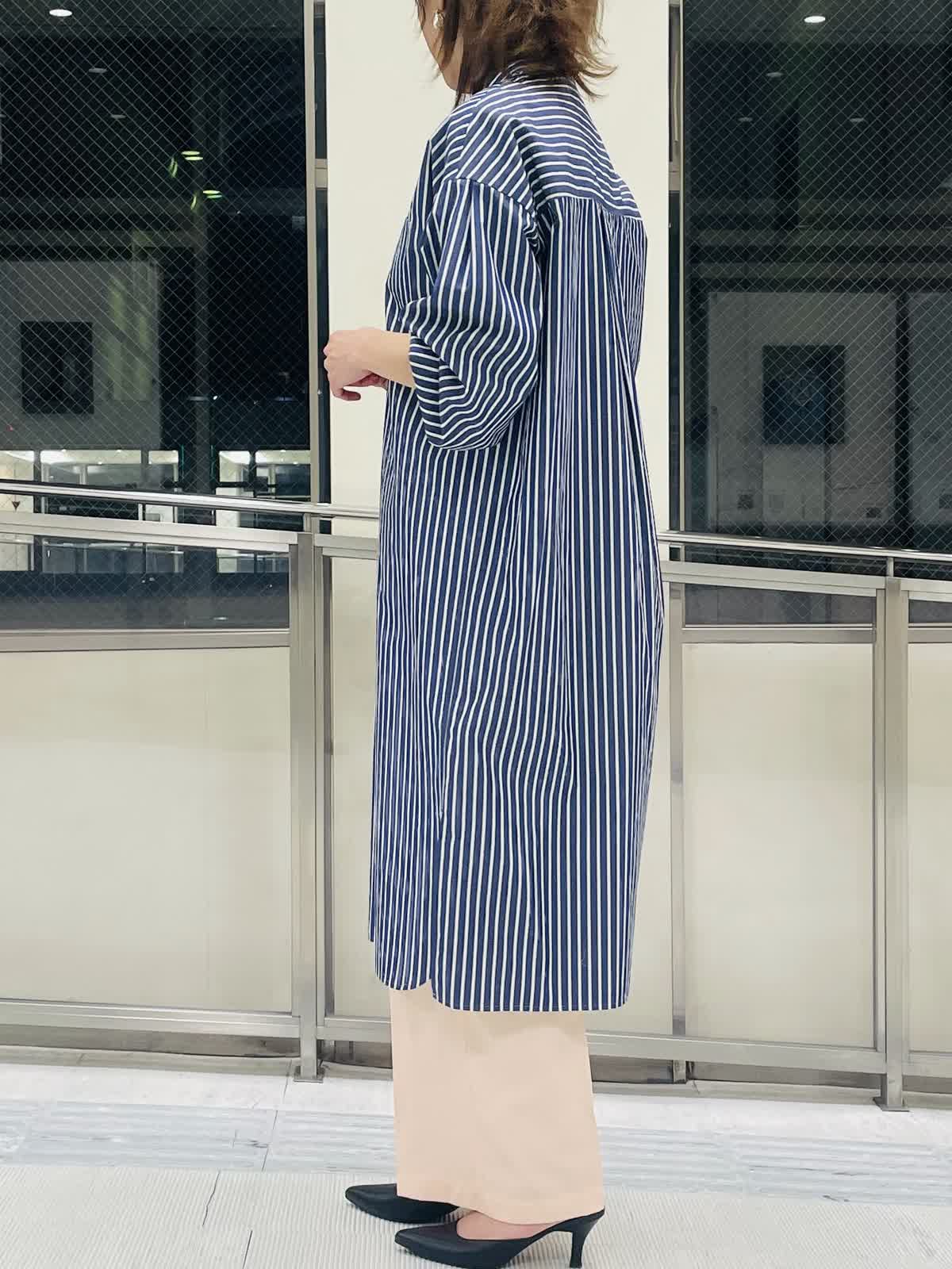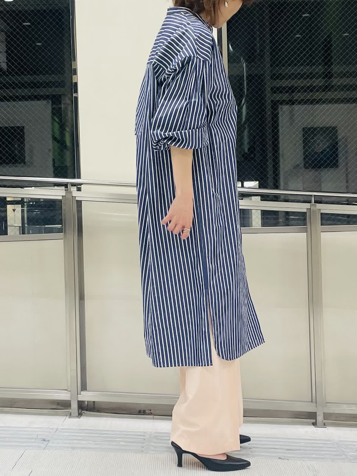 【着用サイズ/カラー】ストライプブラウスネイビー:フリーサイズ インナーホワイト:9号サイズ パンツピンク 袖ゴムが嬉しいストライプロングブラウス。 羽織りとしても活用しやすいハリ感。スリット入りで足捌きがよく、 スカートやワンピース合わせも◎。 ストライプはきちんと感があるのでボトムスはカジュアルも合わせやすくておすすめです。