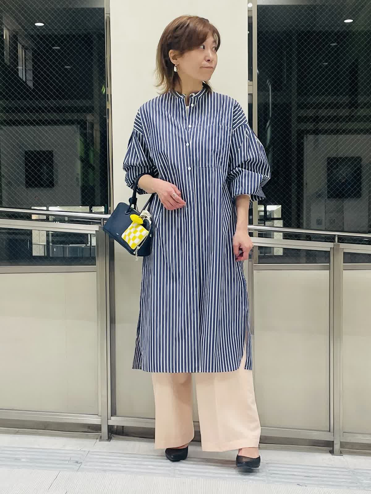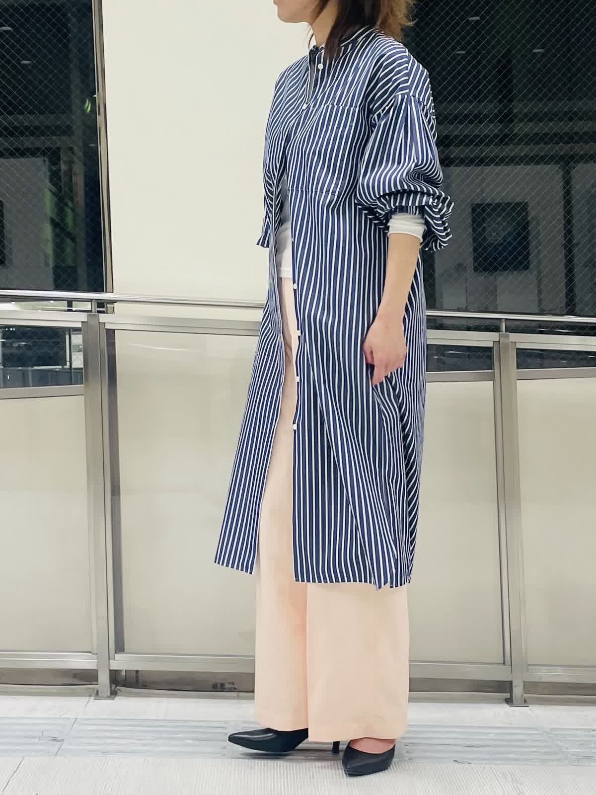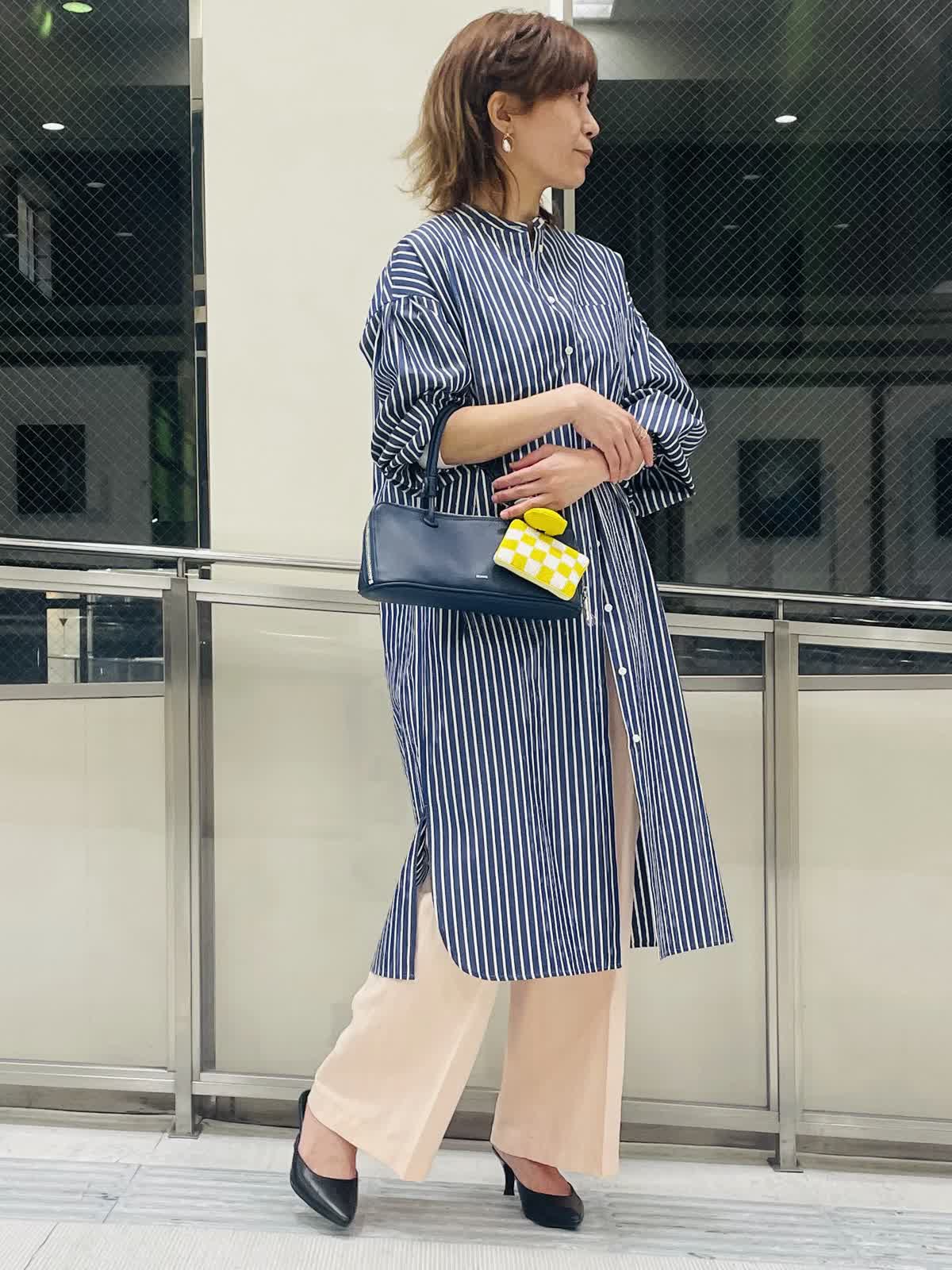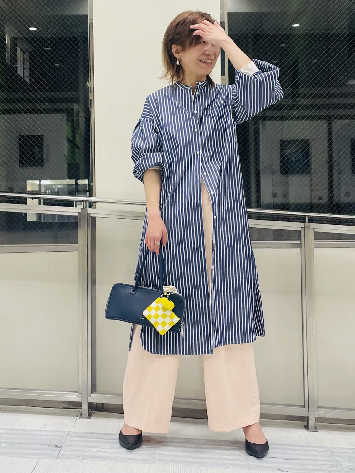 【着用サイズ/カラー】ストライプブラウスネイビー:フリーサイズ インナーホワイト:9号サイズ パンツピンク 袖ゴムが嬉しいストライプロングブラウス。 羽織りとしても活用しやすいハリ感。スリット入りで足捌きがよく、 スカートやワンピース合わせも◎。 ストライプはきちんと感があるのでボトムスはカジュアルも合わせやすくておすすめです。