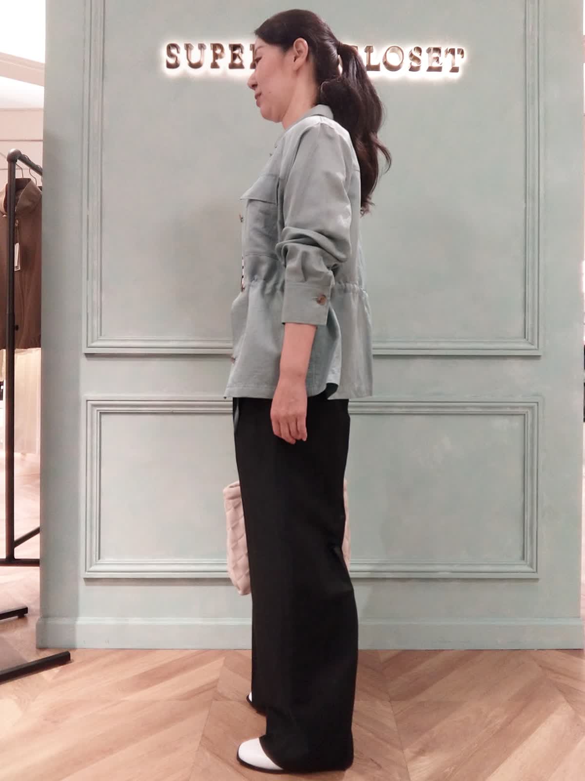 【着用サイズ】ジャケット:9号、ニット:フリー、パンツ:9号 【着用カラー】ジャケット:ペパーミント、ニット:ボーダー、パンツ:チャコールグレー 行楽やご旅行にオススメスタイル。お出かけが多くなる季節、軽い着心地のワークジャケットと、ワイドパンツでコーディネート。インナーのボーダーニットは5分袖で、上着を脱いでも二の腕が気にならない肘丈です。春らしいペパーミントのカラーにマリンテイストなボーダー、パンツは少しツヤ感がある黒に近いダークカラーのチャコールグレーです。 ジャケット、パンツ共に裏地が無く長いシーズン着られるアイテムです。