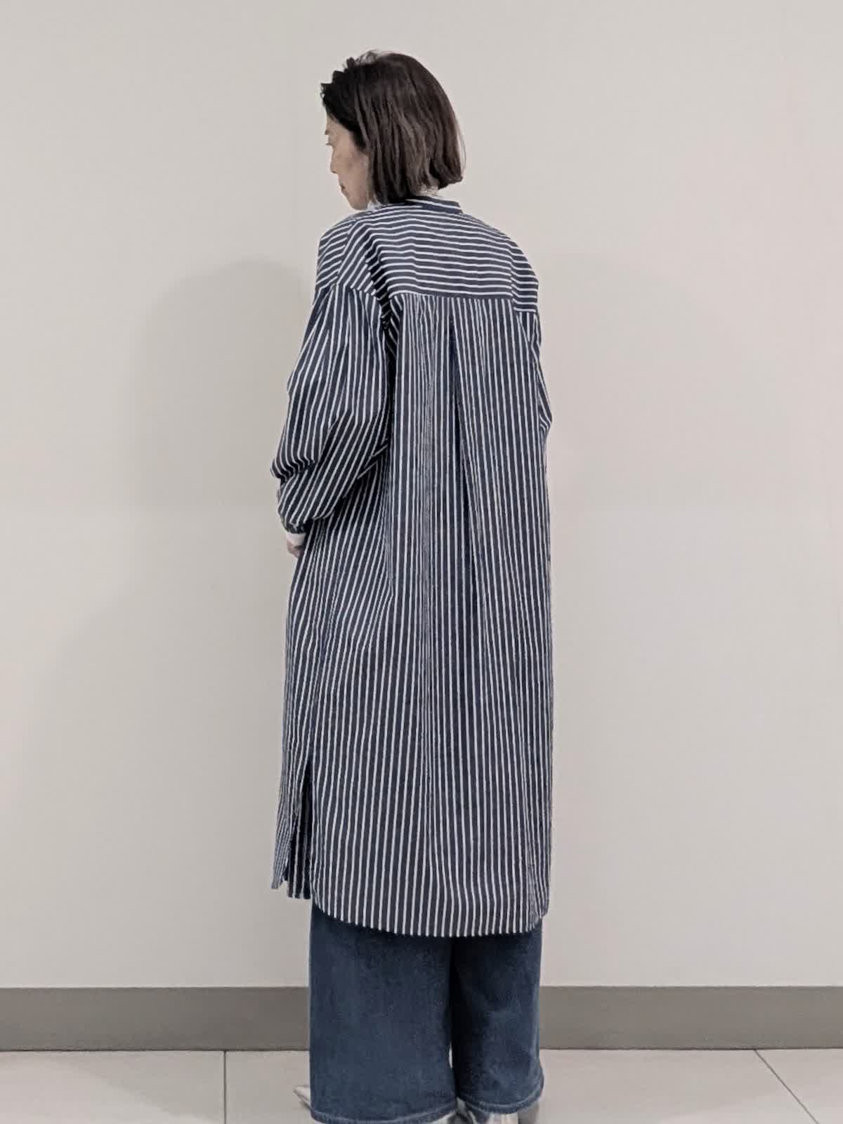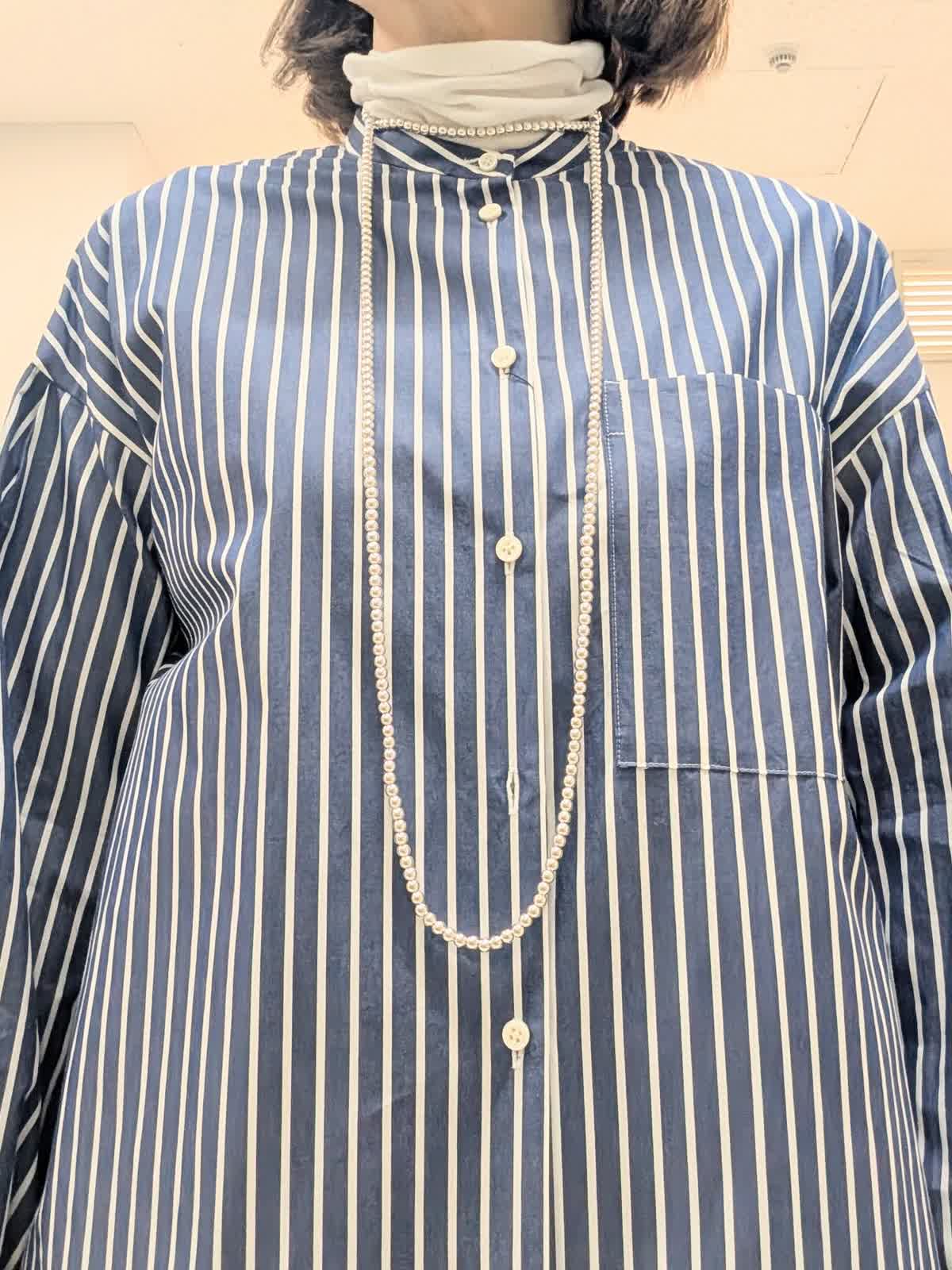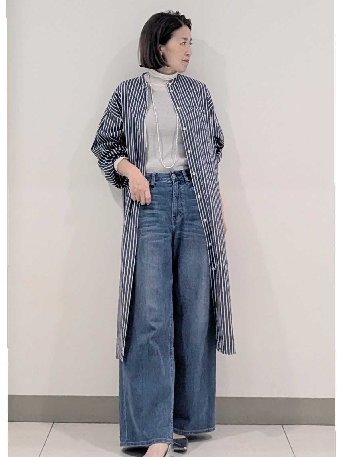 【着用サイズ9号】 これからの季節におすすめのワンピースとパンツのレイヤードスタイル。 ストライプシャツワンピースは、肩を落としたリラックス感のあるデザイン。袖はギャザーディテールでボリュームを出し、1枚で様になるデザイン。 袖口はゴム仕様なので調節可能◎ 羽織りとしてもお使いいただけます。 インナーはシアー感のある柔らかい素材のハイネックを。 着心地バツグンなインナーです。 ボトムスは、 イネド別注《HealthyDENIM》 ワイドバギーを合わせました。 はじめから馴染んだ生地感で軽く履きやすいシリーズです。