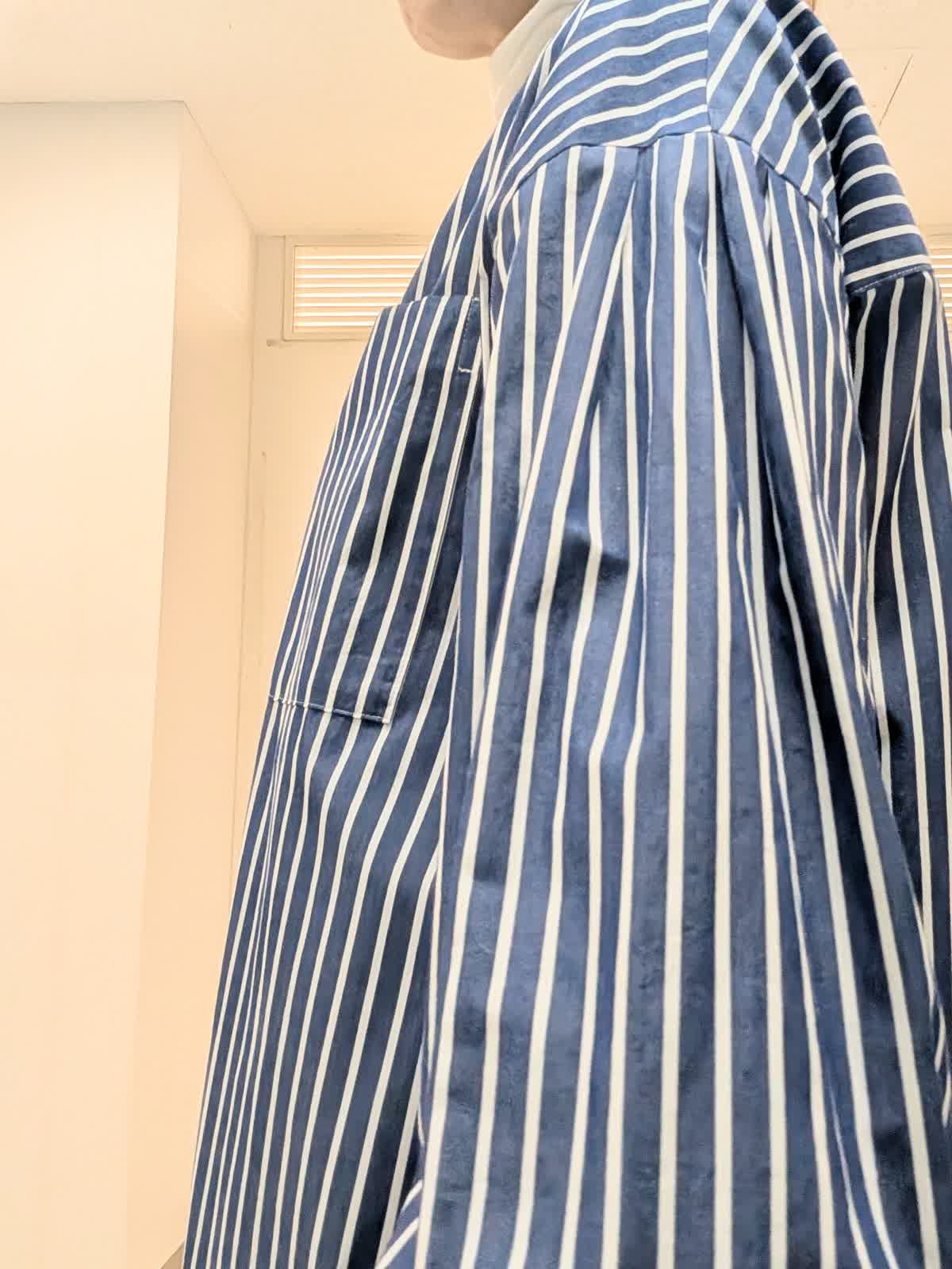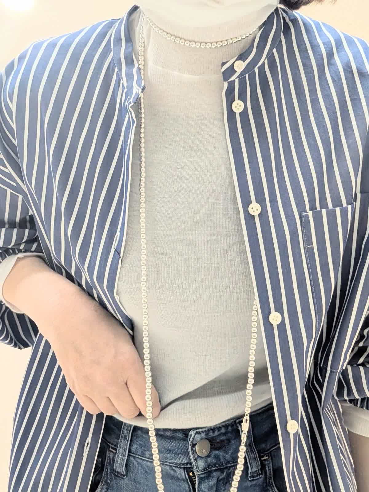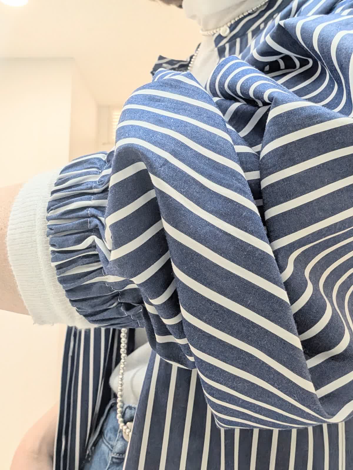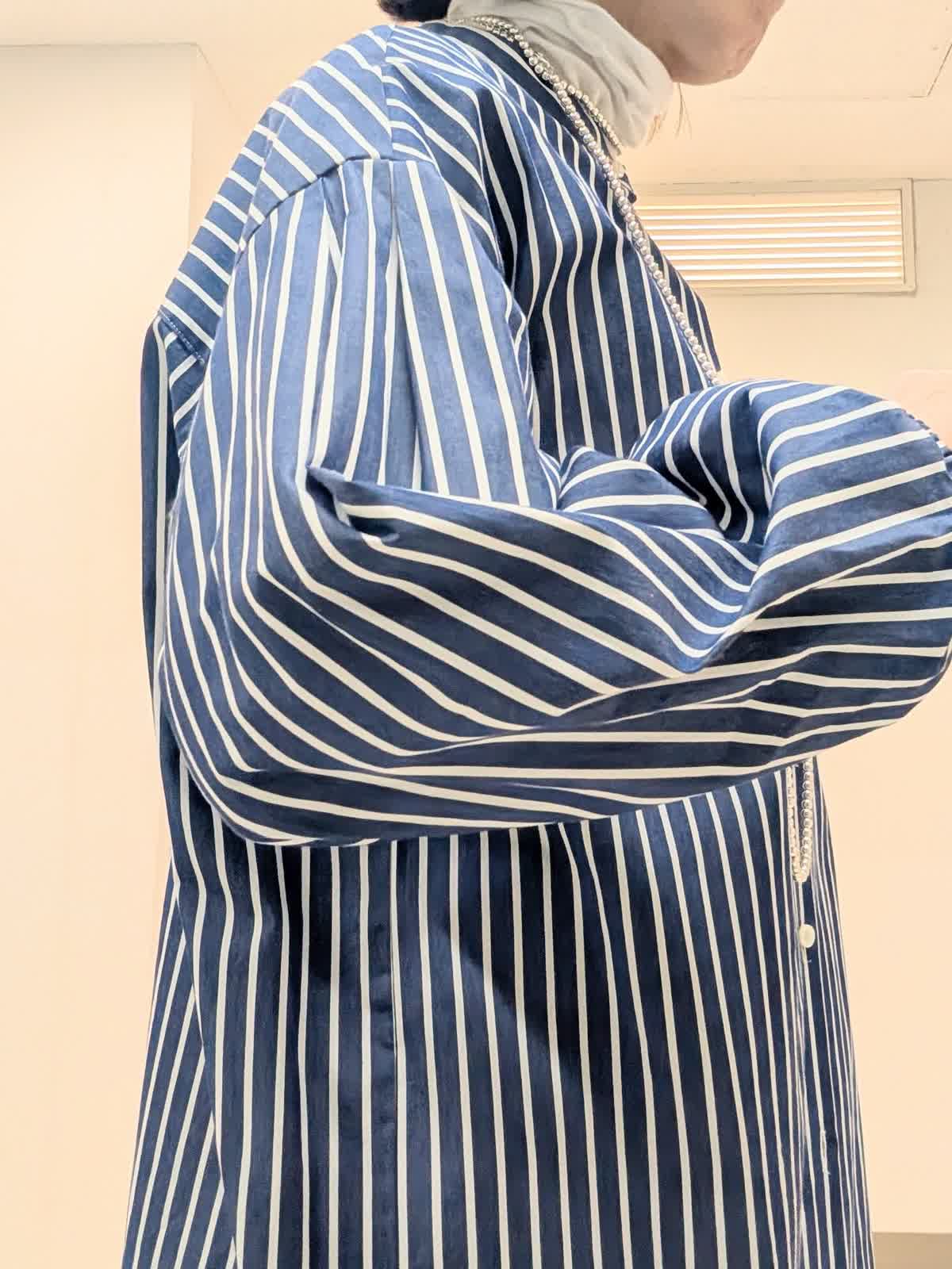 【着用サイズ9号】 これからの季節におすすめのワンピースとパンツのレイヤードスタイル。 ストライプシャツワンピースは、肩を落としたリラックス感のあるデザイン。袖はギャザーディテールでボリュームを出し、1枚で様になるデザイン。 袖口はゴム仕様なので調節可能◎ 羽織りとしてもお使いいただけます。 インナーはシアー感のある柔らかい素材のハイネックを。 着心地バツグンなインナーです。 ボトムスは、 イネド別注《HealthyDENIM》 ワイドバギーを合わせました。 はじめから馴染んだ生地感で軽く履きやすいシリーズです。