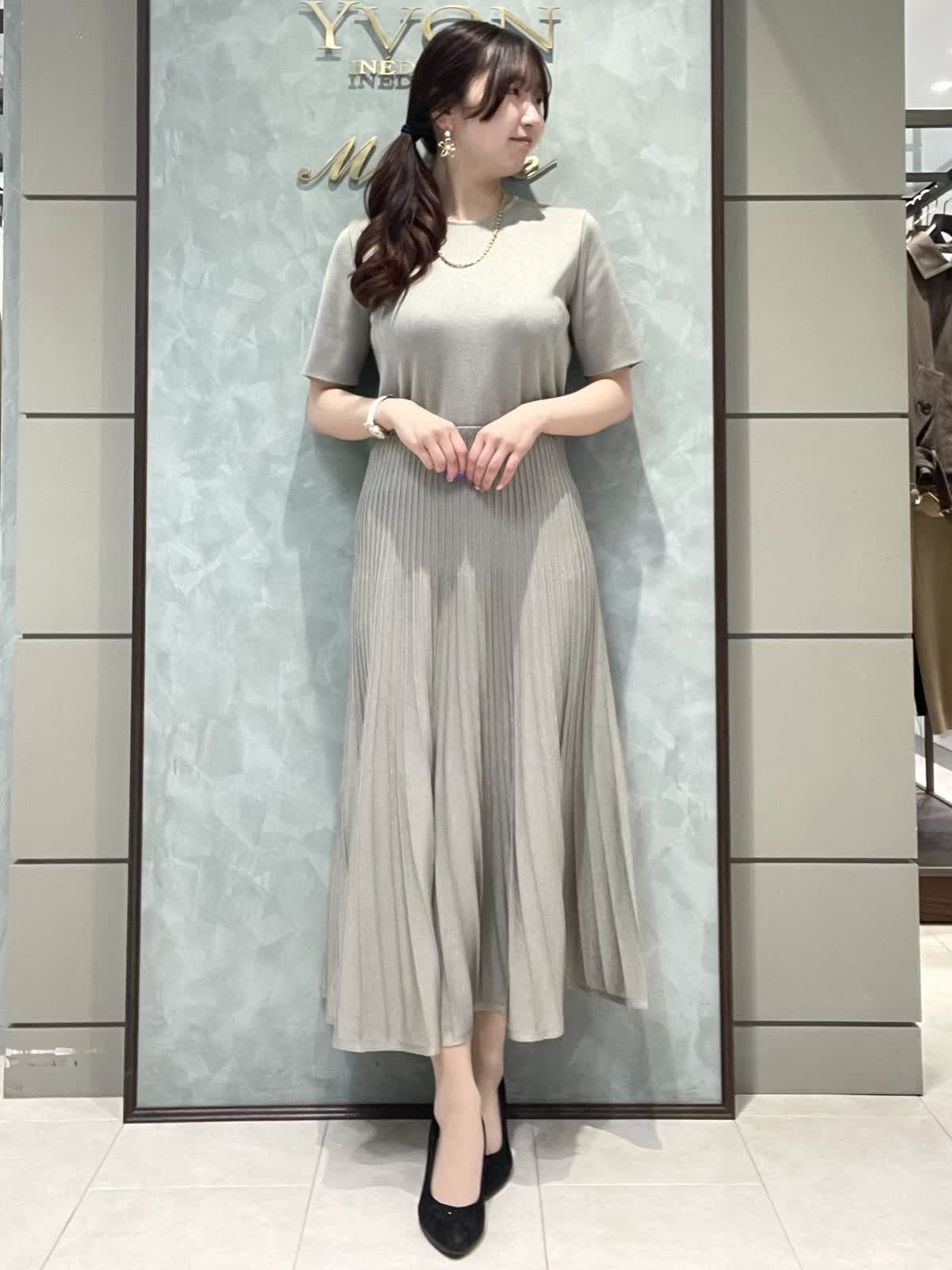 【着用サイズ】ワンピース:9号 パーティー、同窓会などにオススメの程よく華やかさのあるワンピースです。 厚手過ぎず、薄すぎずでボディラインを拾いにくく、羽織で調節してシーズンレスで着用いただけます。肌なじみの良いカラーなので、ジャケットやカーディガンを羽織る際は白や黒などはっきりしたカラーで合わせるのがおすすめです。繊細かつ細めのプリーツで華奢見えします。透け感は気になりません。着丈は157センチで足首が出るくらいです。