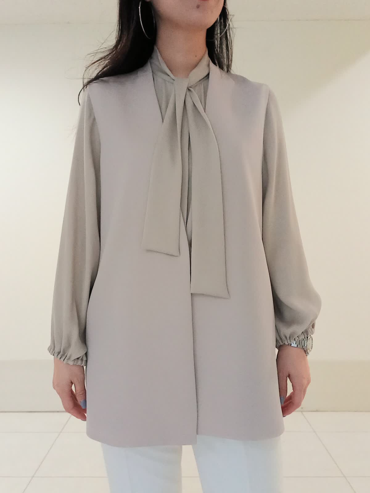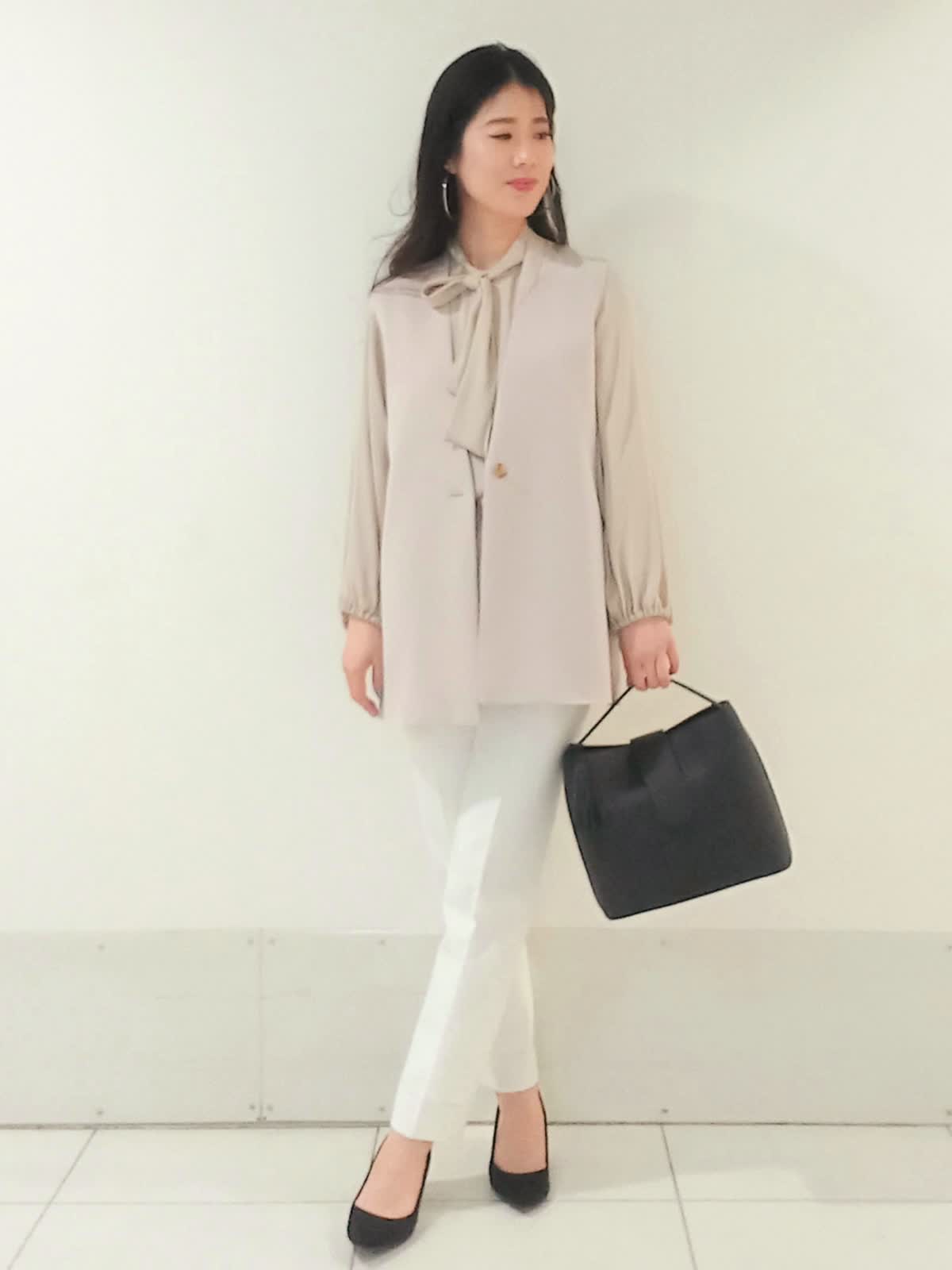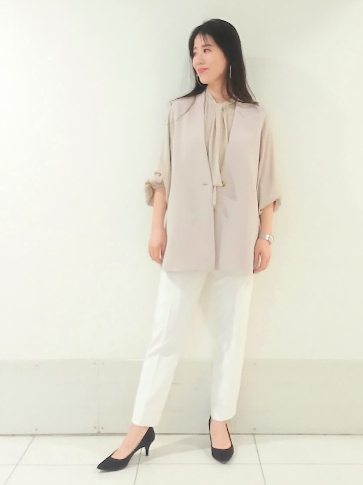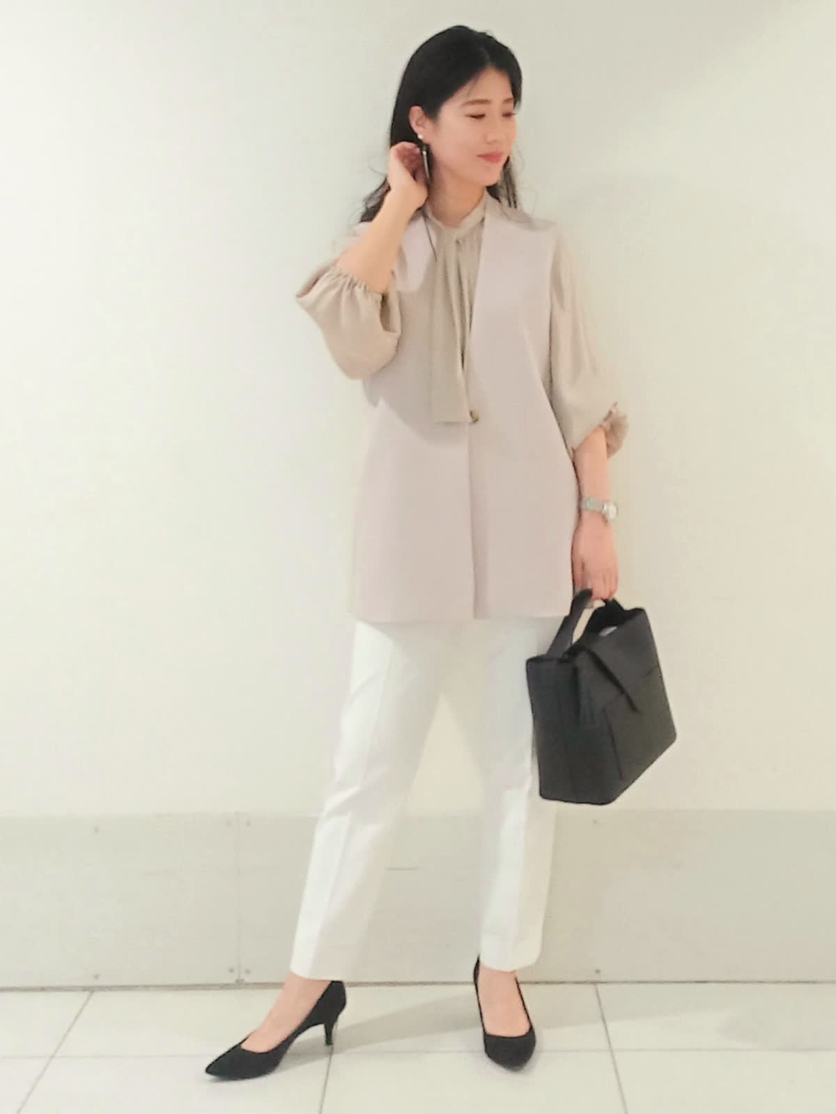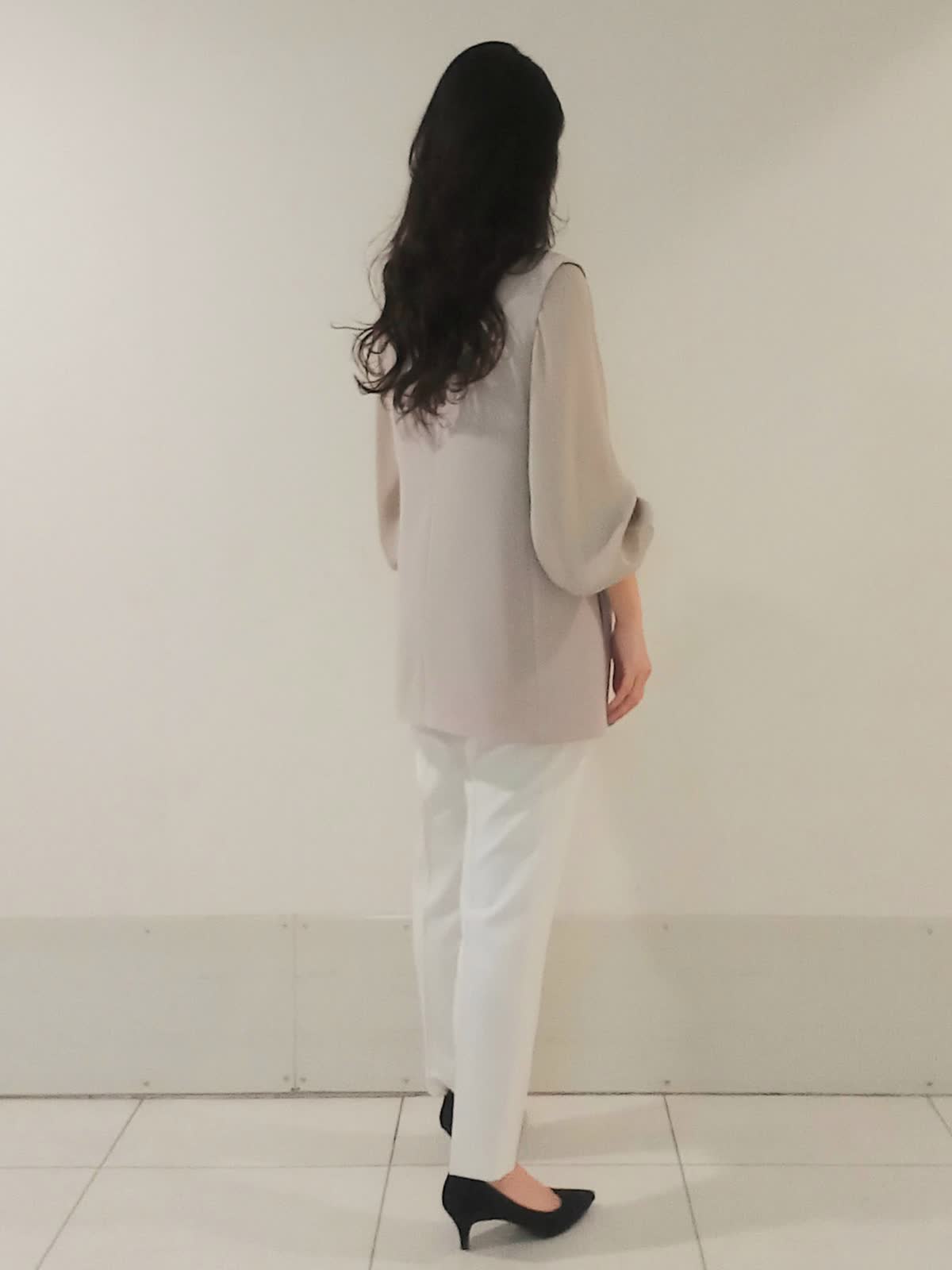 【着用サイズ、カラーレスジレ9号、ブラウス9号、テーパードパンツ9号】 ジレを羽織ることで、Iラインが強調され背を高く体型をすっきりと見せてくれる効果があります。 またブラウス1枚よりもこなれ感が出るのもポイントです。 きれいめなセンタープレス入りのパンツが全体をシャープに引き締めながら、柔らかい女性らしさも演出。 お仕事からイベントまで大活躍! 洗練された都会的な印象を与えクラス感のあるコーディネートに仕上げました。