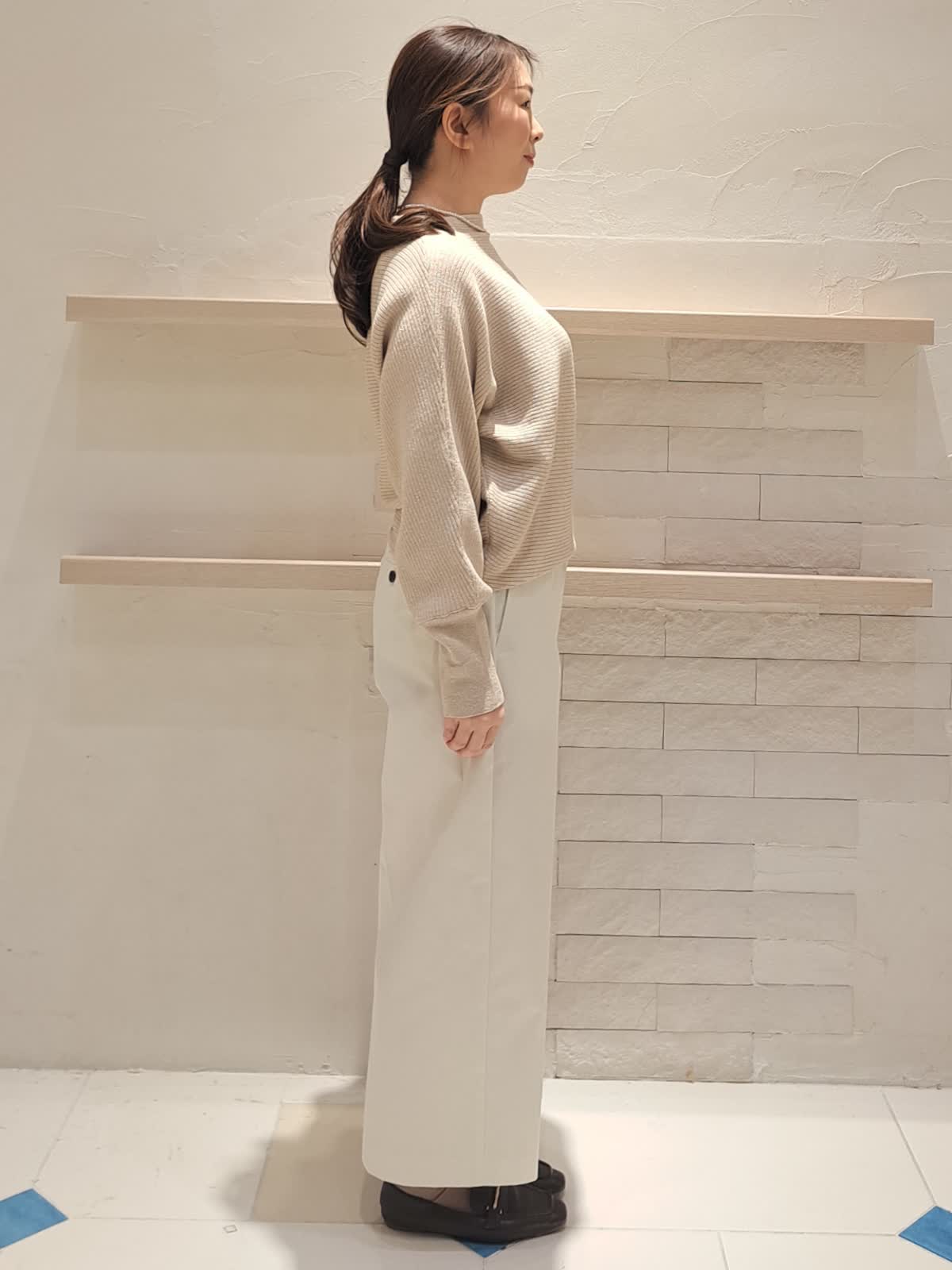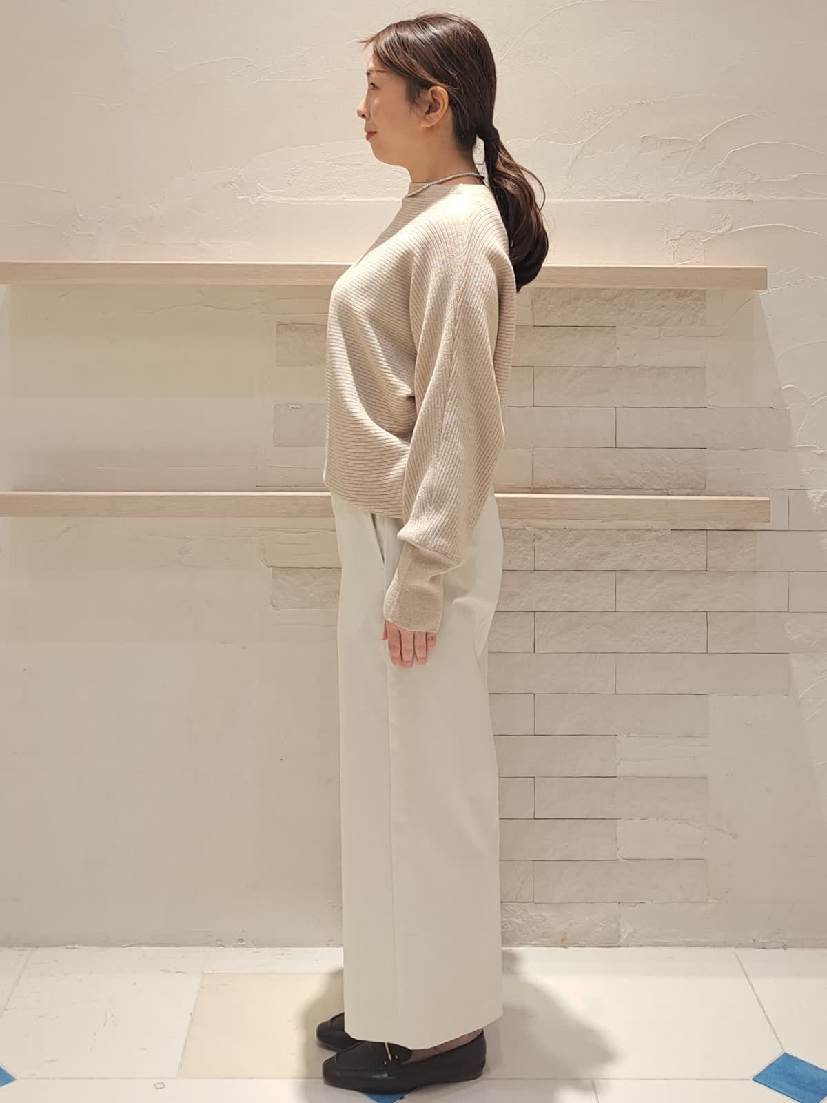 【着用サイズ】ニット:フリー パンツ:9号 【着用カラー】ニット:ベージュ パンツ:オフホワイト 細かいラメが華やかなドルマンニット。丈が短めなワイドパンツと合わせて、小柄な方でも着用できるコーディネートです。