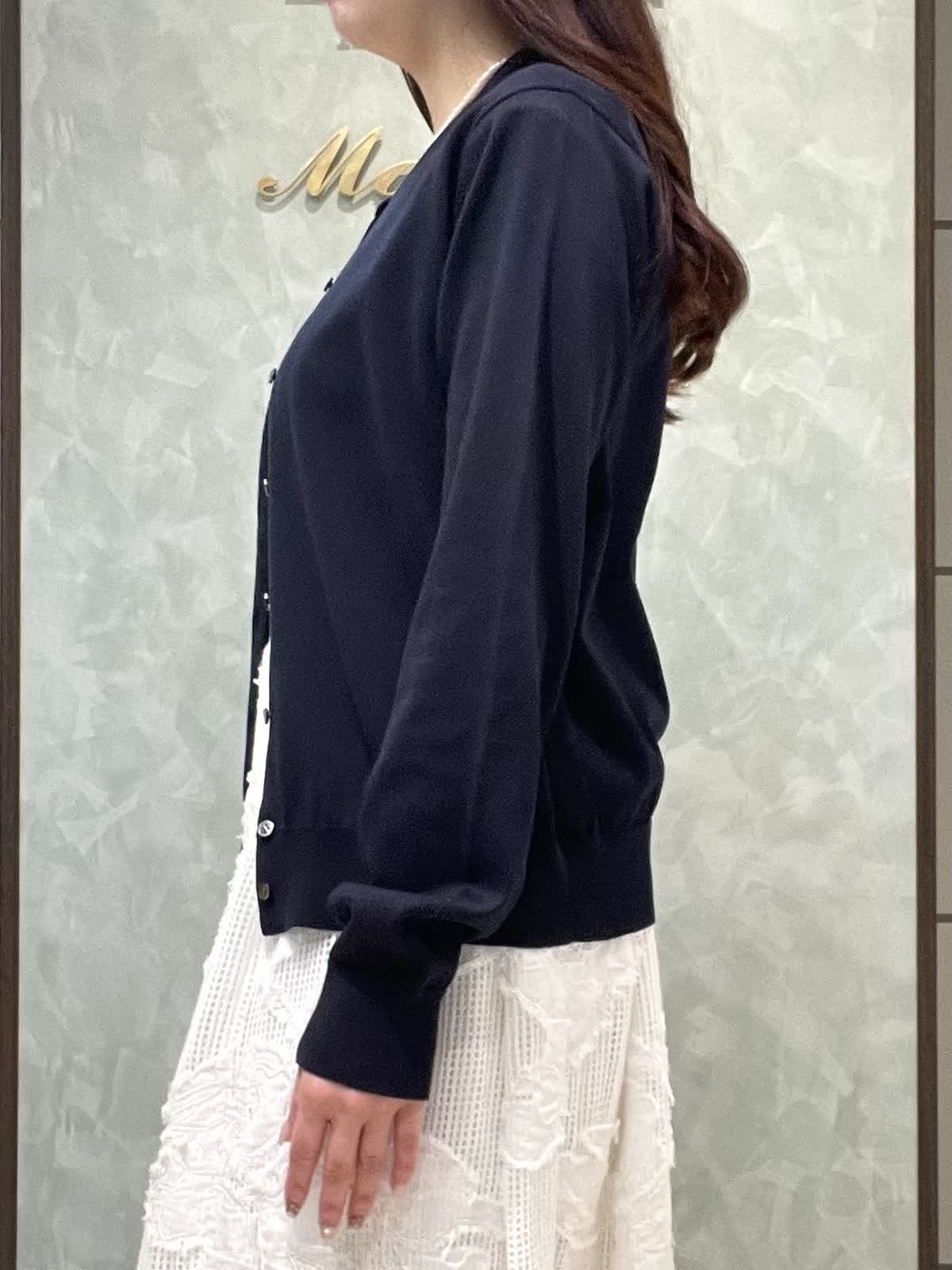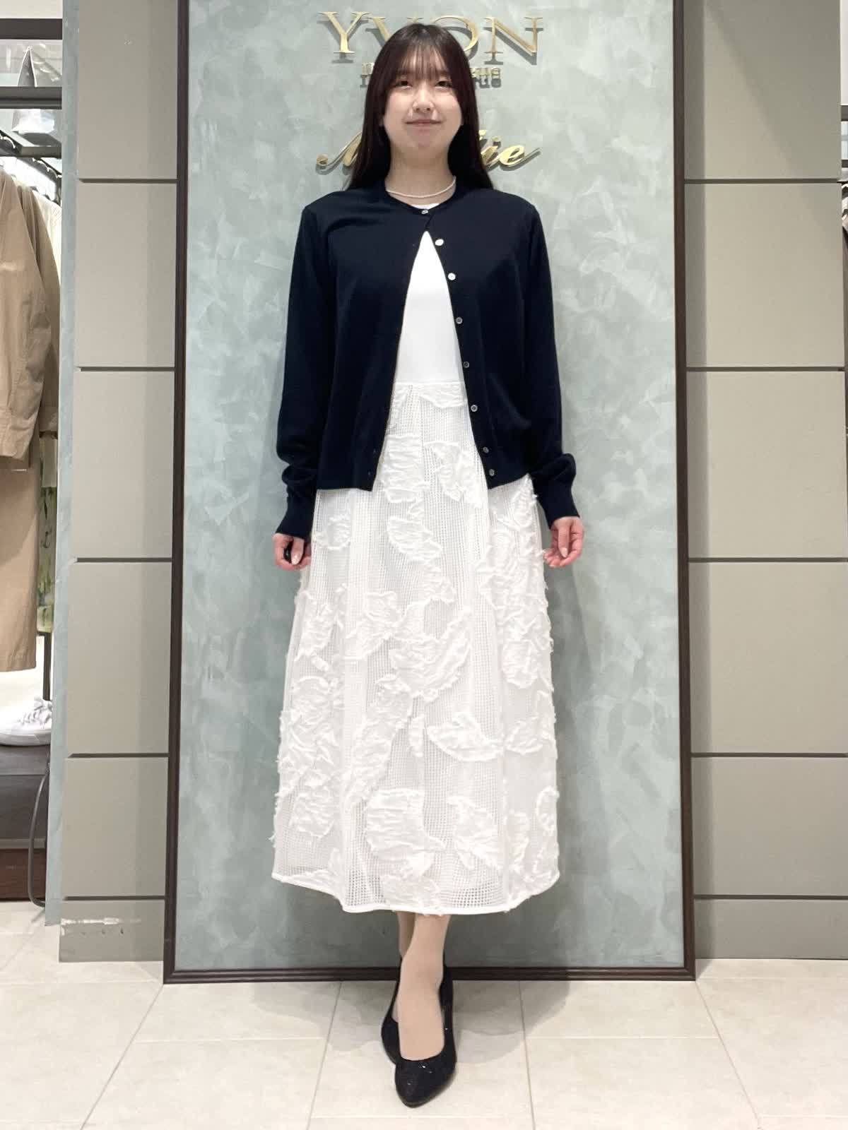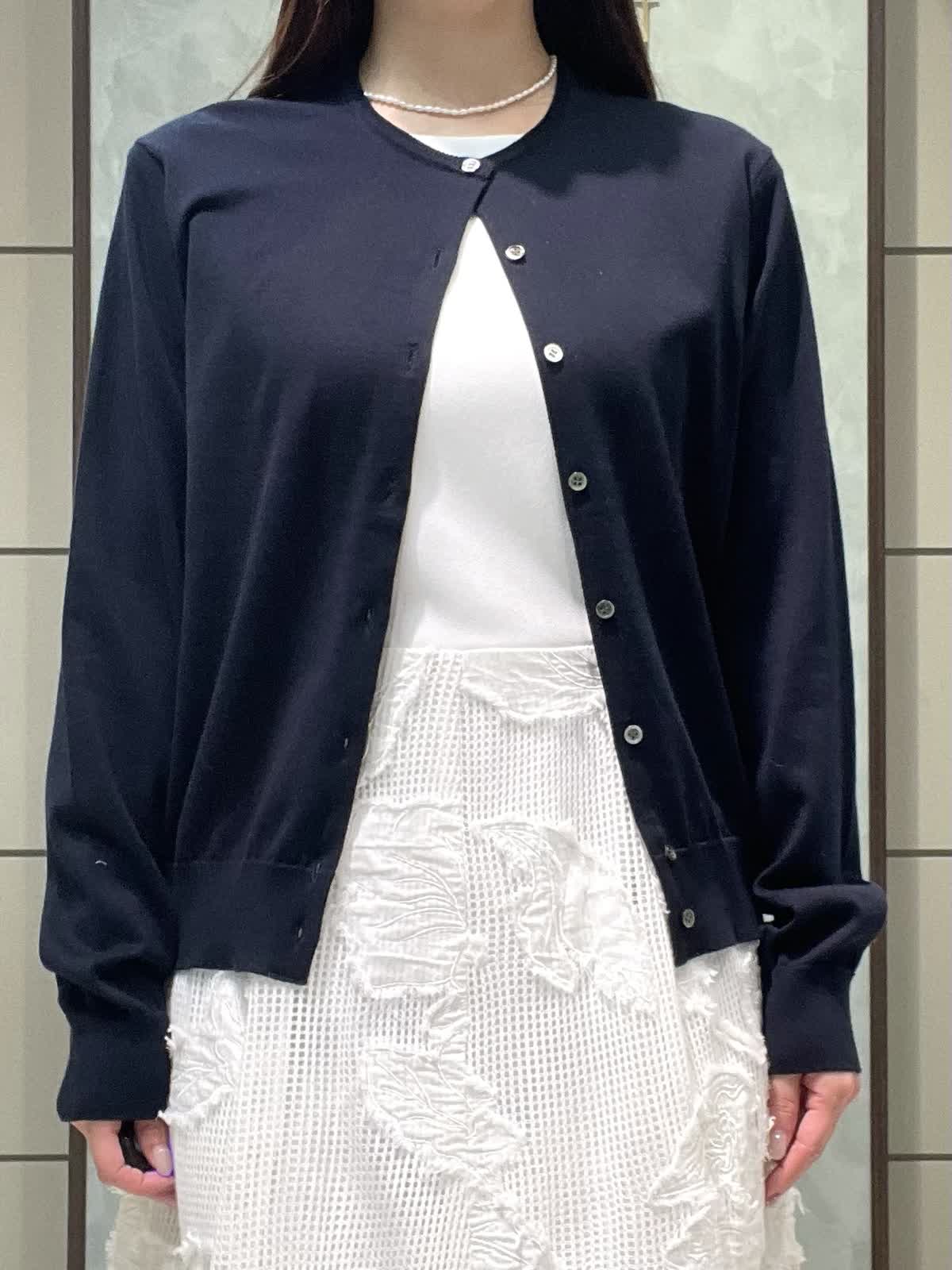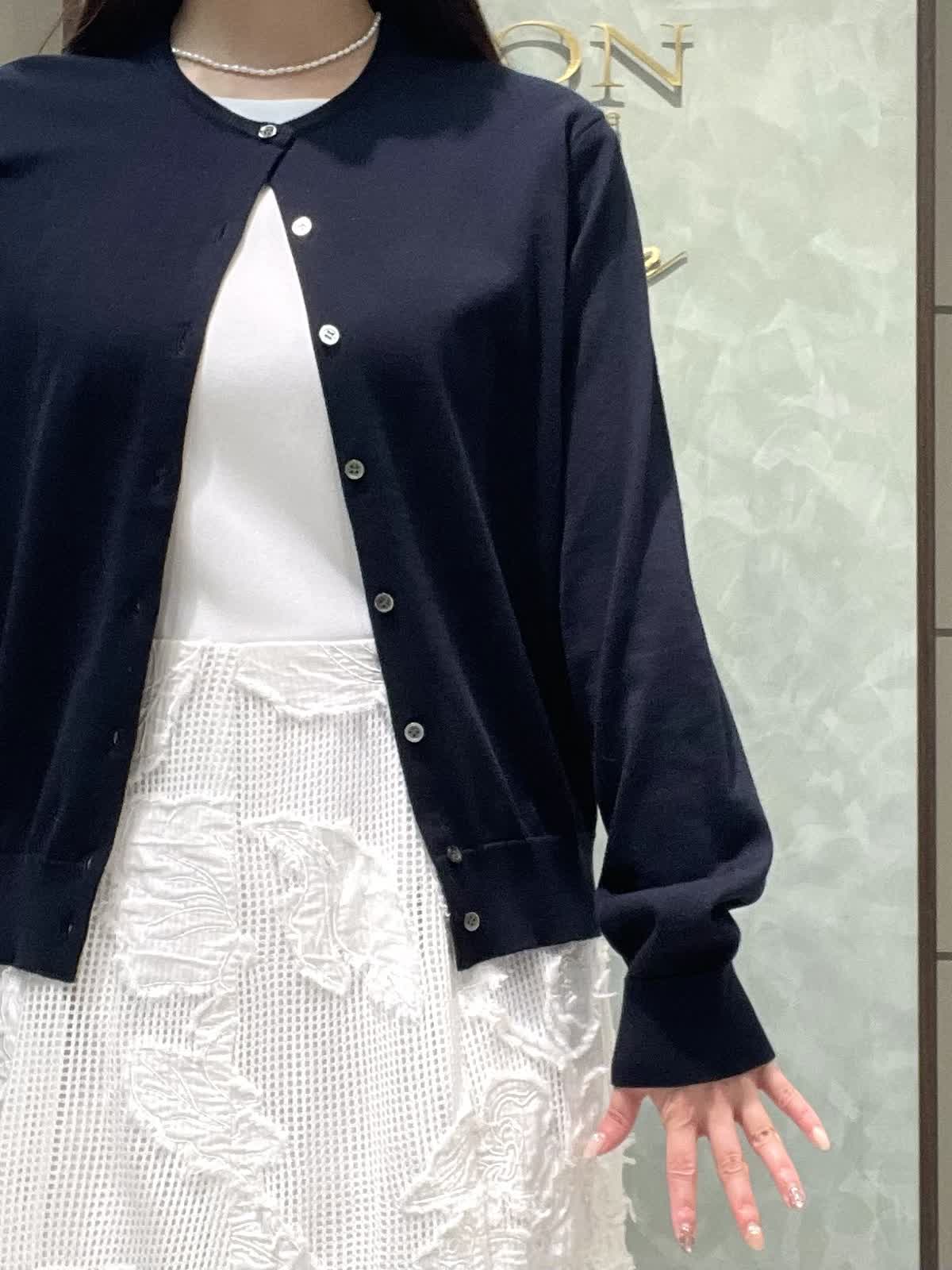 【着用サイズ】カーディガン、ワンピース:共に9号 お仕事、お顔合わせ、パーティーなど幅広いキレイめの場面で活躍するスタイリングです。 カーディガンは超ハイゲージでカットソーのようなさらっとした着心地です。ベーシックな形で流行り廃りなく、長く着用できます。ワンピースはさらっとしたカットソー生地にメッシュ地のドッキングです。首元はすっきり、お袖は肩が華奢見えするカットラインです。白でも着膨れしない、細見えシルエットです。後ろファスナー、ポケットなし。着丈は157センチでふくらはぎ下です。