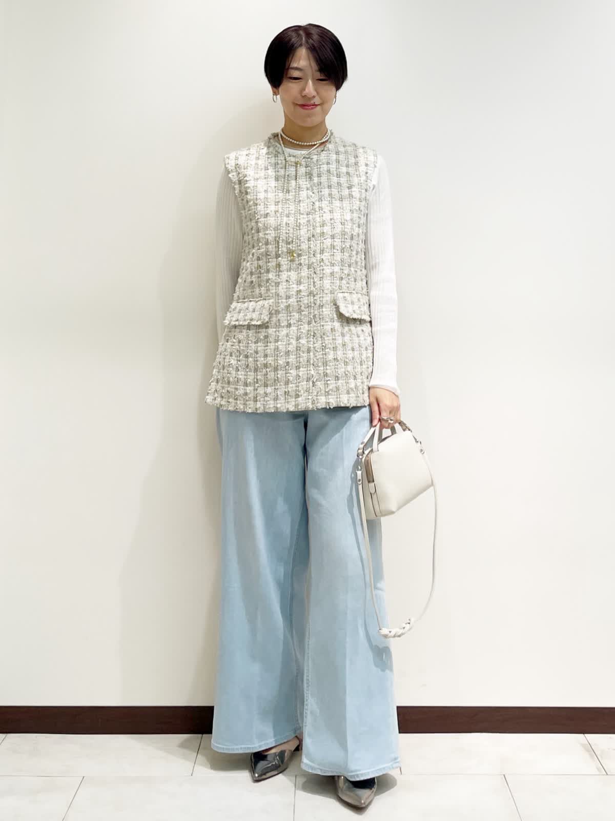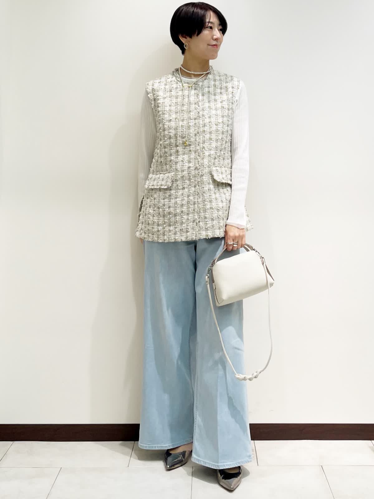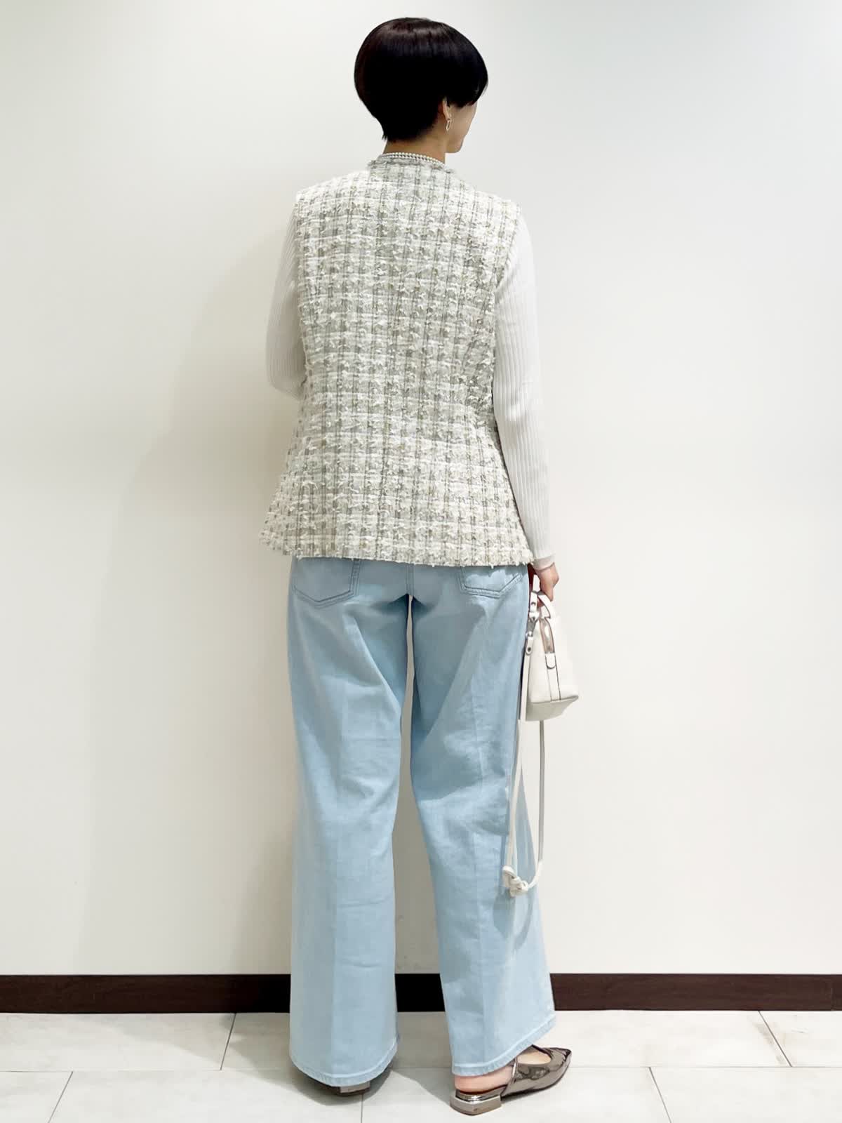 【着用サイズ】全て9号 【カラー】ジレ:ベージュ ニット:ホワイト パンツ:サックス バック:アイボリー 【コーディネートテーマ】 ツイードジレ×デニムのカジュアルダウンコーデ。 お出かけにオススメ!デニムスタイルが格上げされます! 【サイズ感】 ジレ:標準 ニット:ピッタリしすぎない適度なゆとりのあるシルエット パンツ:標準 163p 普段9号サイズ 骨格ウェーブで上半身に比べてヒップがやや大きい