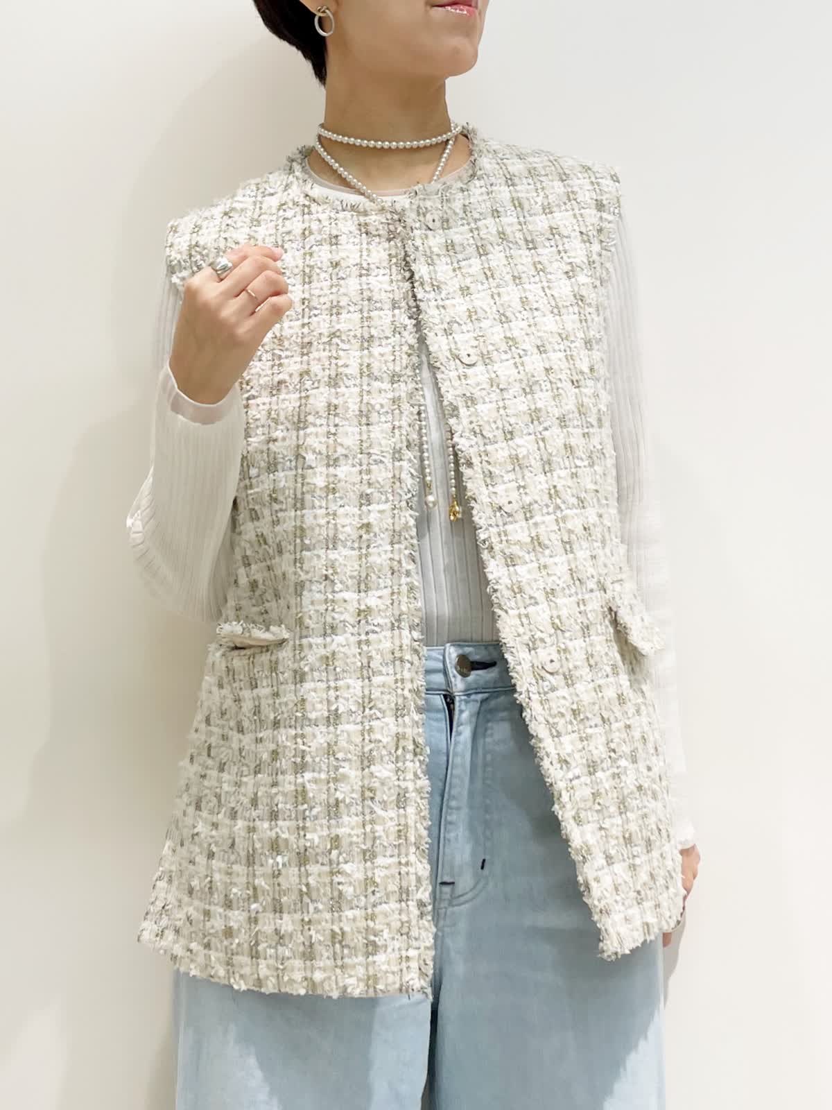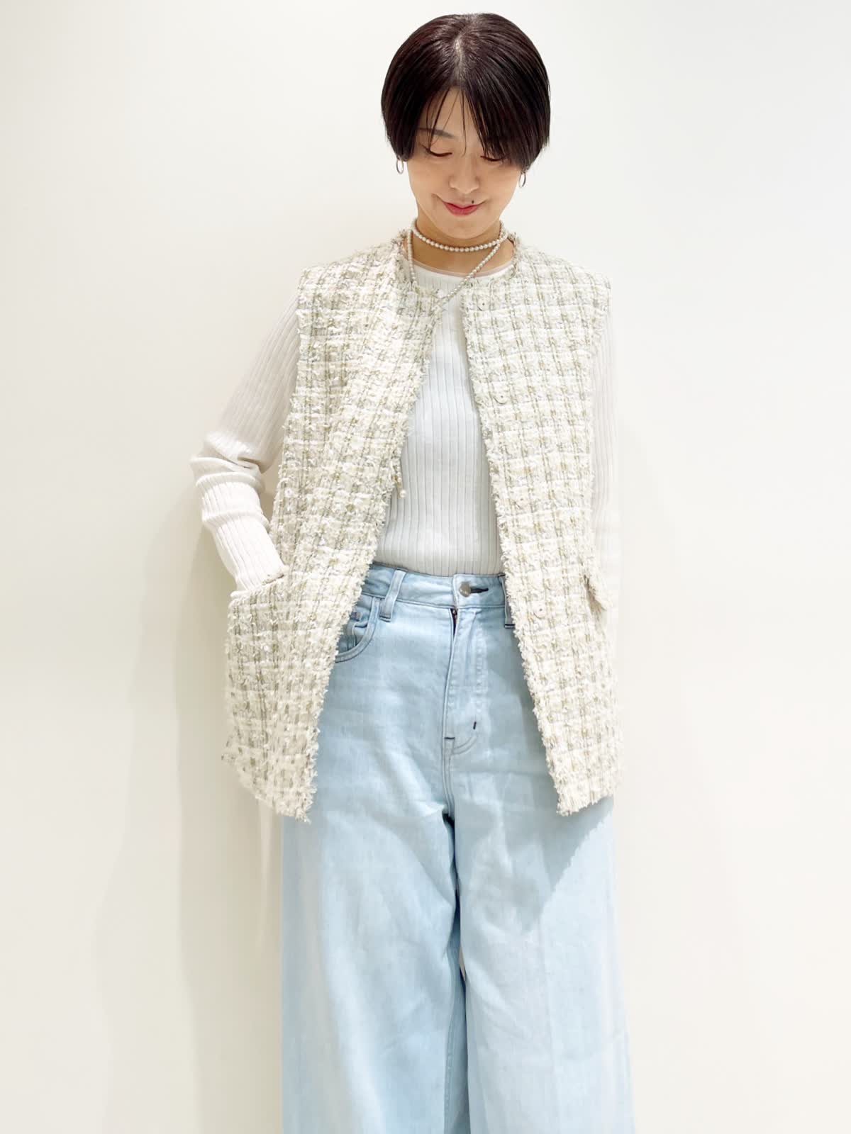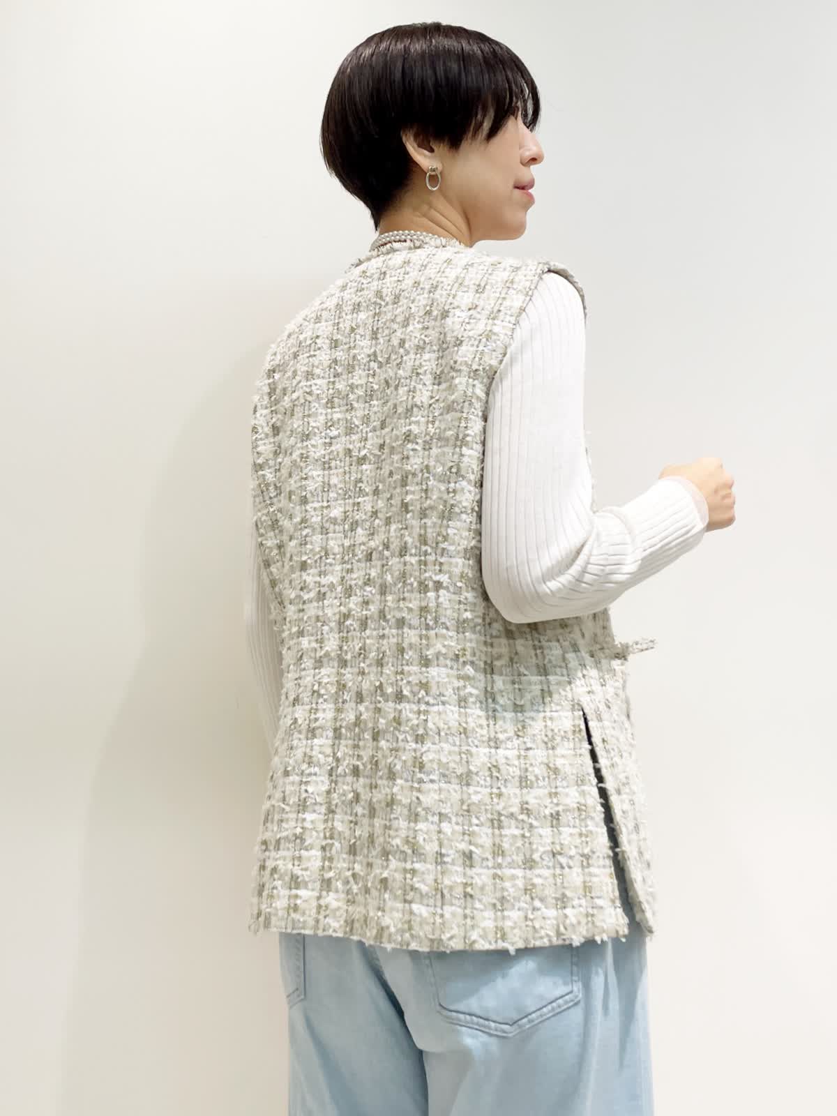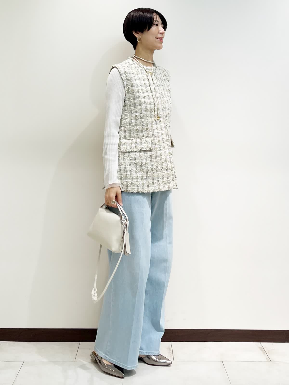 【着用サイズ】全て9号 【カラー】ジレ:ベージュ ニット:ホワイト パンツ:サックス バック:アイボリー 【コーディネートテーマ】 ツイードジレ×デニムのカジュアルダウンコーデ。 お出かけにオススメ!デニムスタイルが格上げされます! 【サイズ感】 ジレ:標準 ニット:ピッタリしすぎない適度なゆとりのあるシルエット パンツ:標準 163p 普段9号サイズ 骨格ウェーブで上半身に比べてヒップがやや大きい