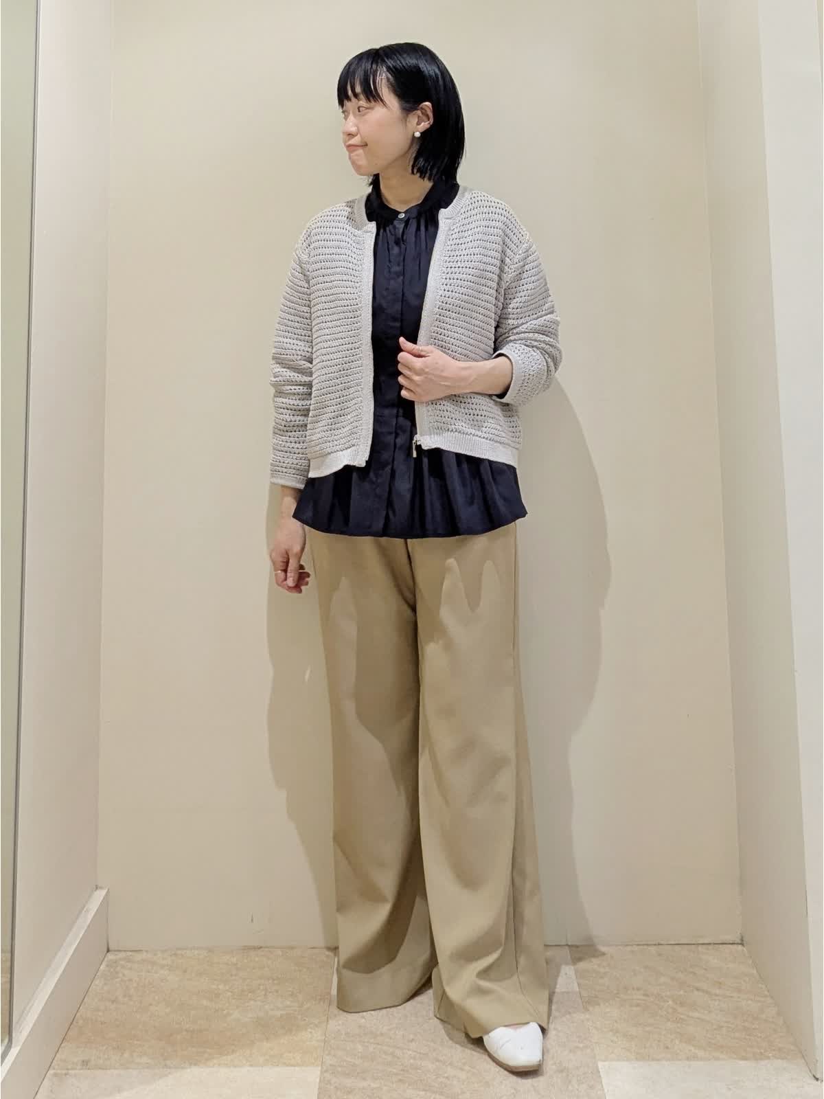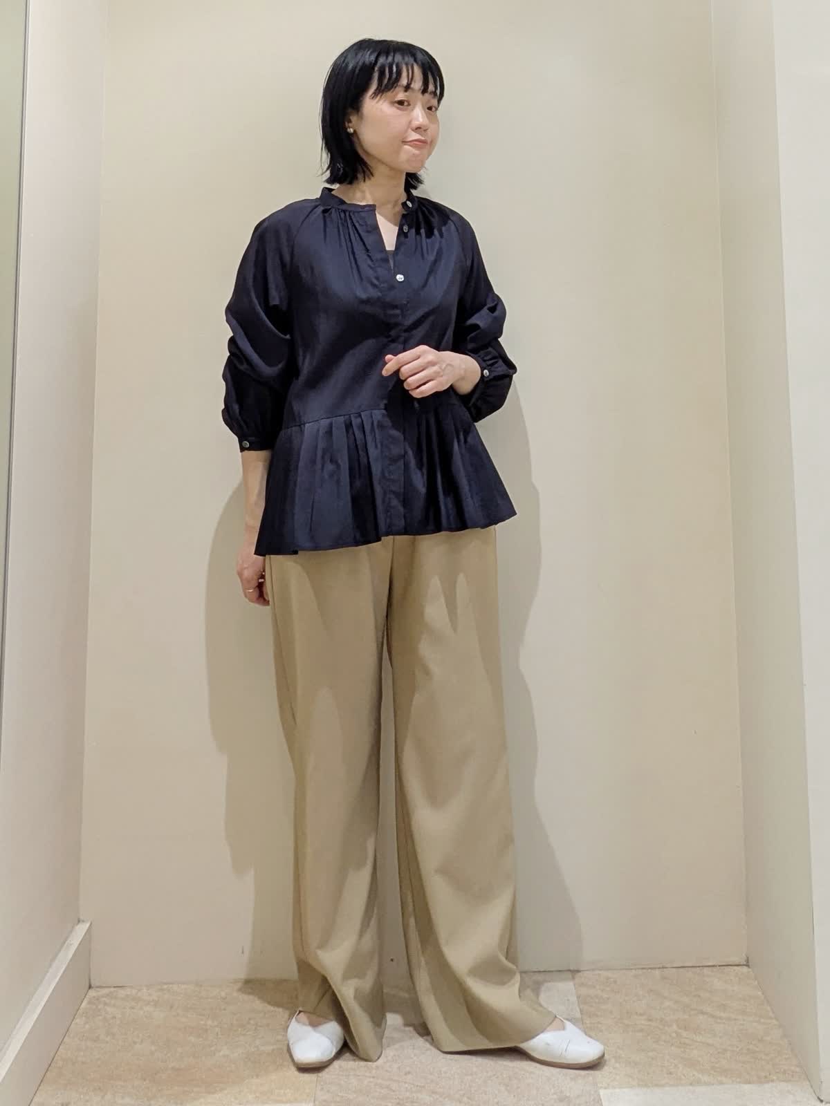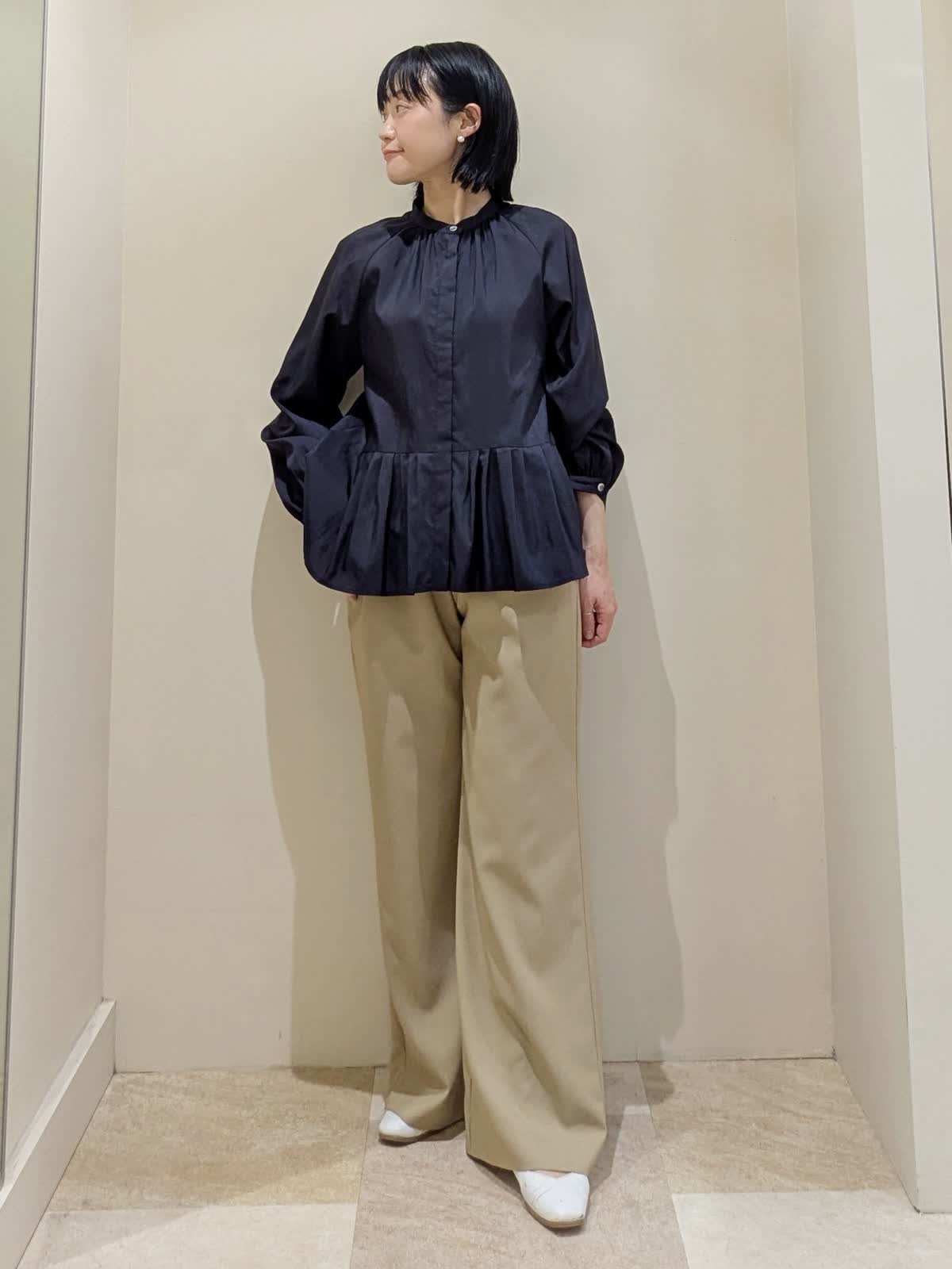 【着用サイズ】ブラウス/フリー、パンツ/9号、カーディガン/フリー 【着用カラー】ブラウス/ネイビー、パンツ/ベージュ、カーディガン/ミディアムグレー 『ブラウスから始める春スタイル』春、真っ先に欲しいアイテム、ブラウス。さりげない甘さのペプラムデザインは、素材の落ち感、ナチュラルな光沢感により大人世代も安心して着用出来ます。セミフレアラインで脚長効果抜群のパンツと合わせて、シンプルに着てみました。
