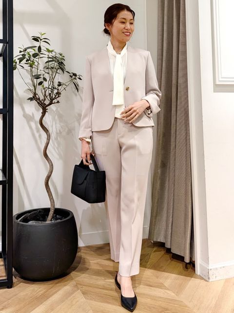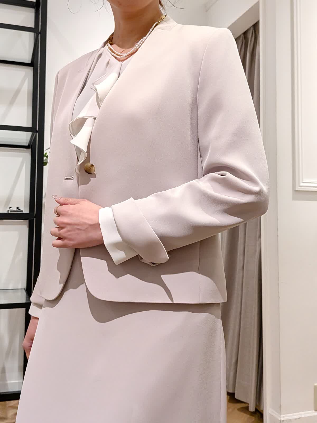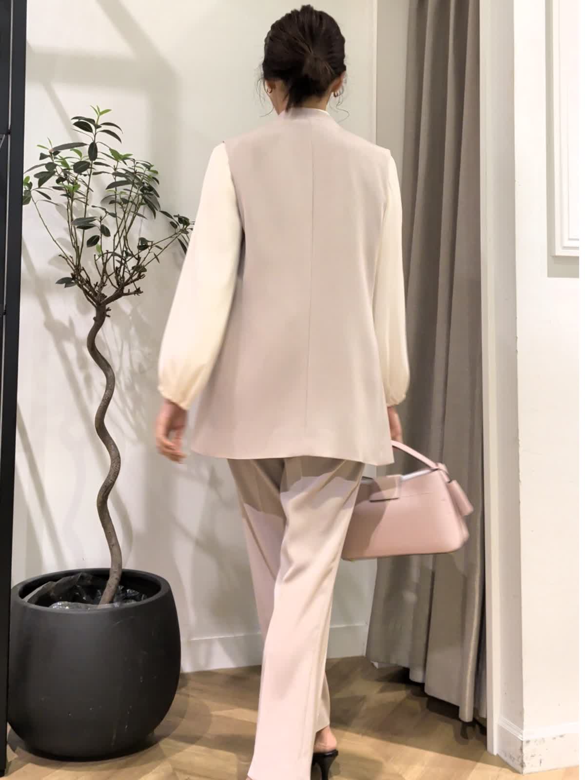 【着用サイズ】ジレ?グレーベージュ?9号ボータイブラウス?オフホワイト?11号 パンツ?グレーベージュ?9号 ジャケット?グレーベージュ?9号 フリルブラウスオフホワイト:9号 スカート:グレーベージュ:9号 肌なじみの良いグレーベージュのジレセットアップ。