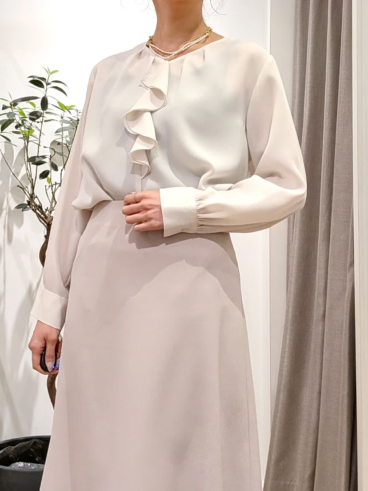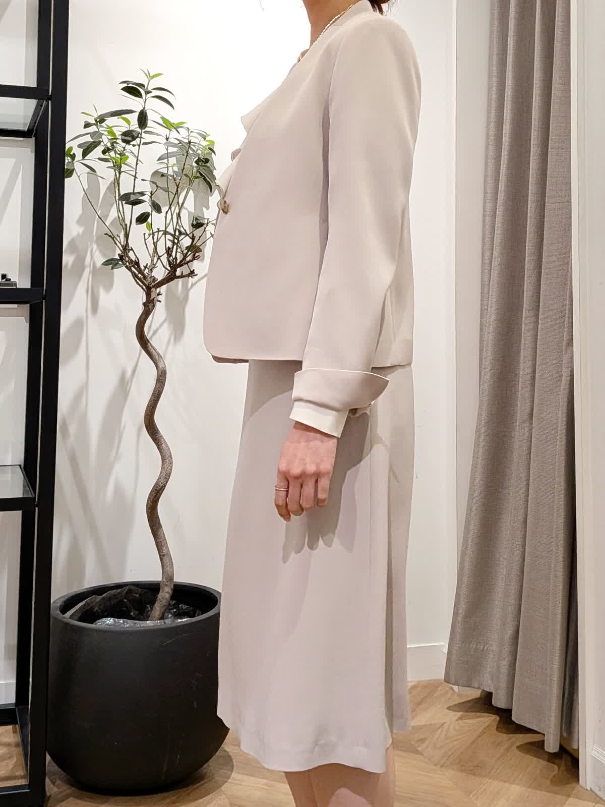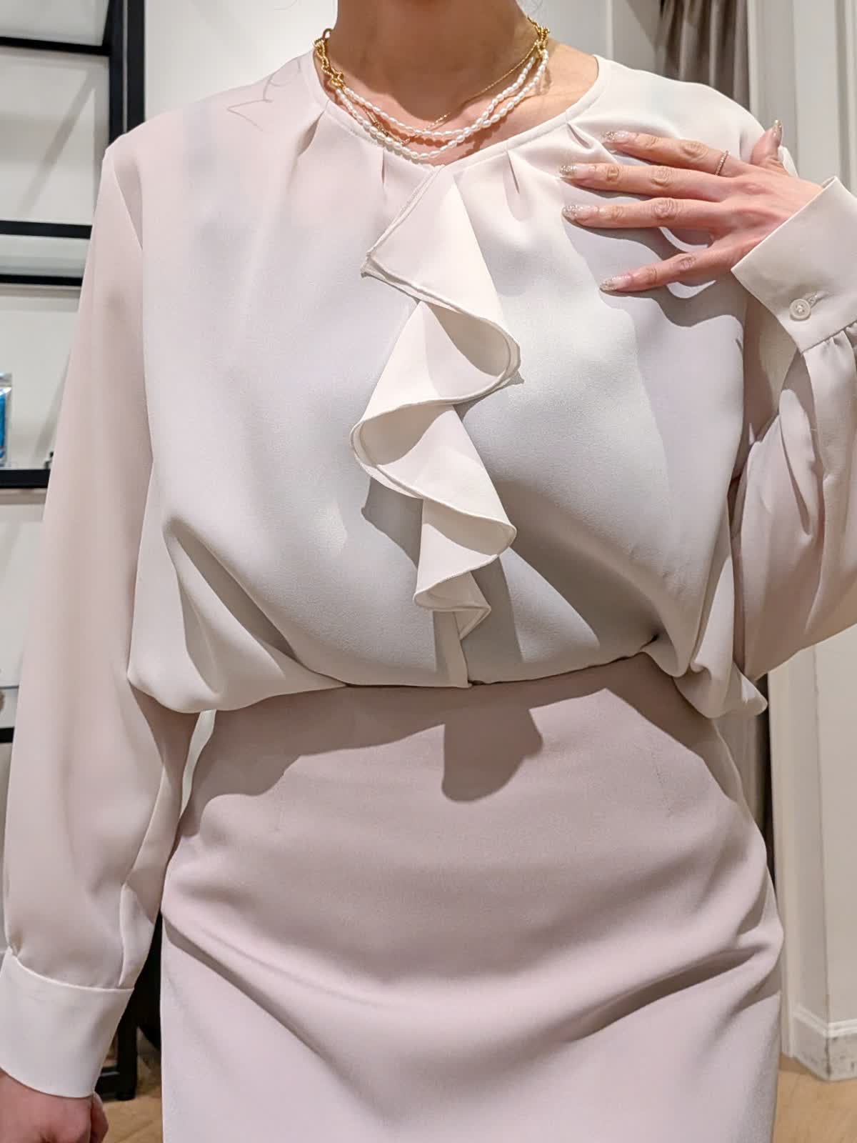 【着用サイズ】ジレ?グレーベージュ?9号ボータイブラウス?オフホワイト?11号 パンツ?グレーベージュ?9号 ジャケット?グレーベージュ?9号 フリルブラウスオフホワイト:9号 スカート:グレーベージュ:9号 肌なじみの良いグレーベージュのジレセットアップ。