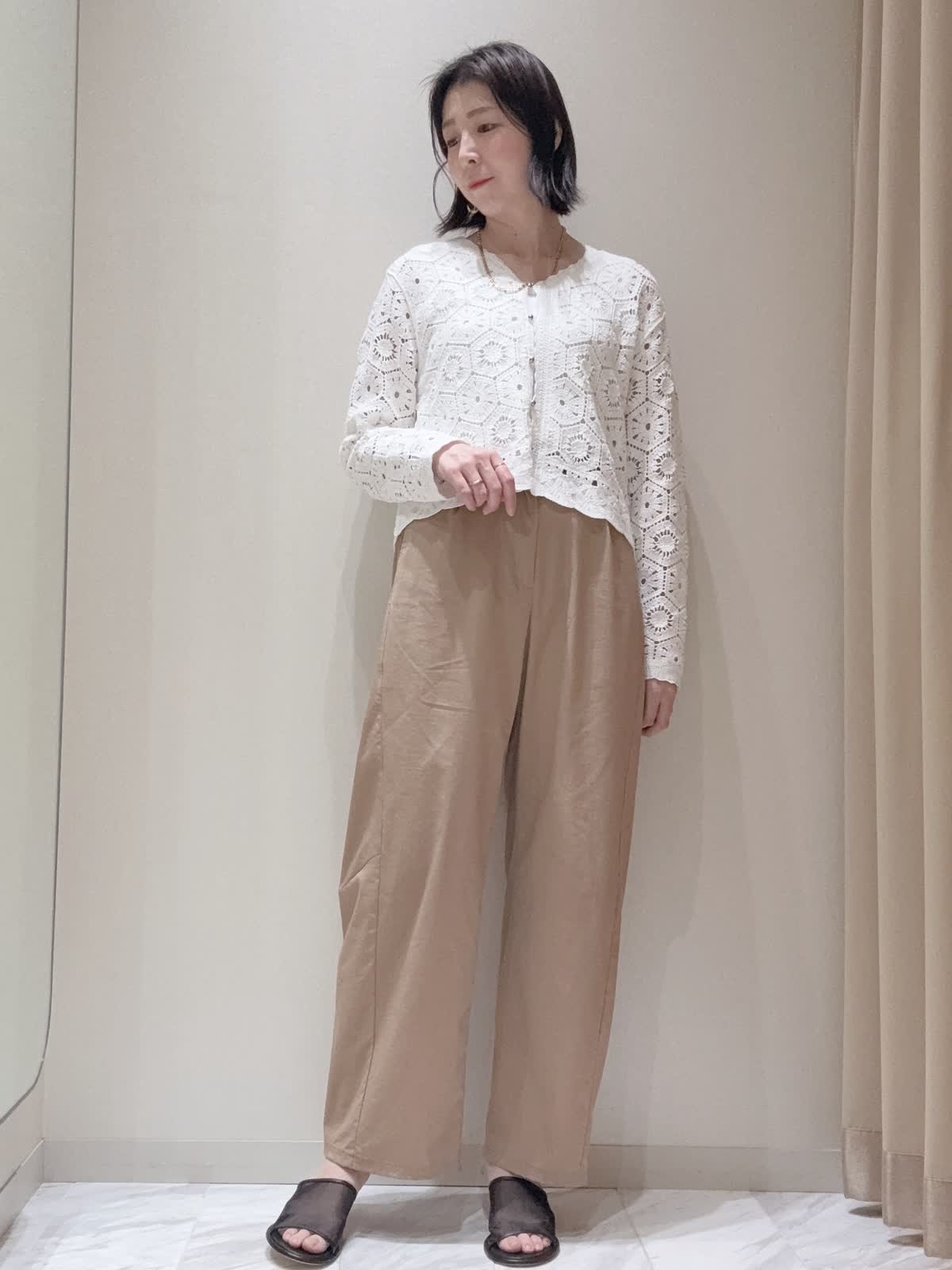 【着用サイズ】全て:9号 【着用カラー】ニット:オフホワイトカットソー: オフホワイト パンツ: キャメル コットン刺繍で表現したクロシェ編みのニットカーディガン。モチーフを組み合わせ大人っぽいクロシェニットで、浅めのVネックにメタルボタンのアクセントが効かせ、短めの着丈でバランスの取りやすいシルエットにしています。 水洗い可能。