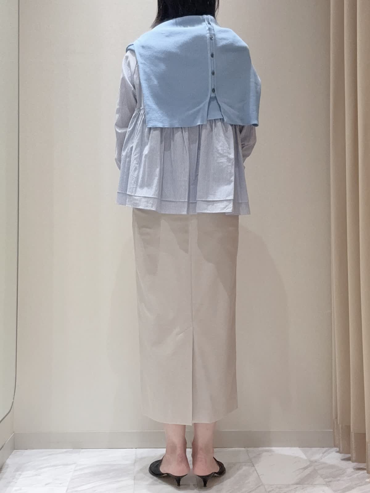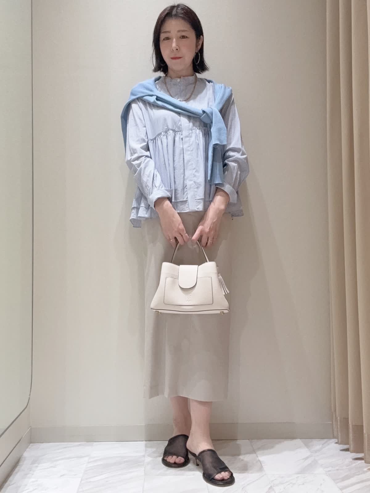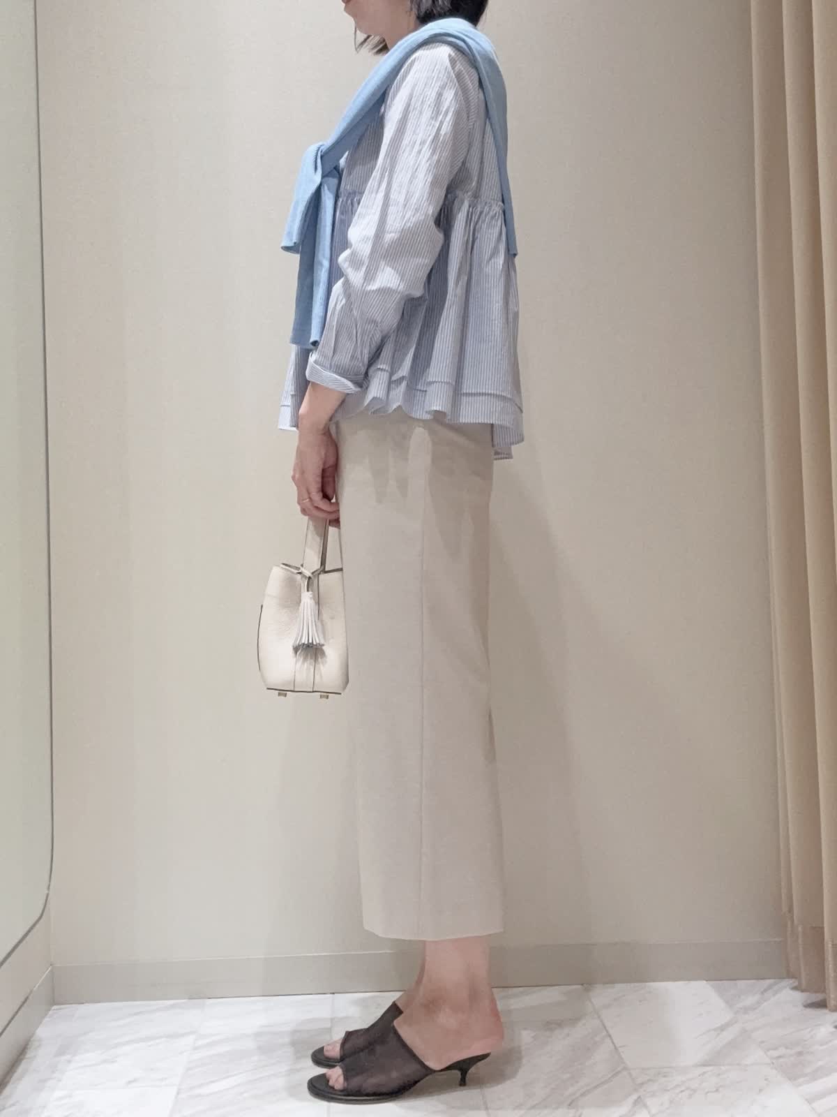 【着用サイズ】全て:9号 【着用カラー】コート:ネイビー ブラウス: ストライプ スカート: ベージュ カーディガン:ブルーバッグ: オフホワイト ウエスト部分で二段のギャザー切り替えを施し、ふんわりとしたさせたブラウス。襟元はスキッパータイプで、顔まわりがすっきり見える仕様です。ワイドパンツとのモードな装いや、デニム合わせでカジュアルなスタイリングで普段使いしやすいデザインです。