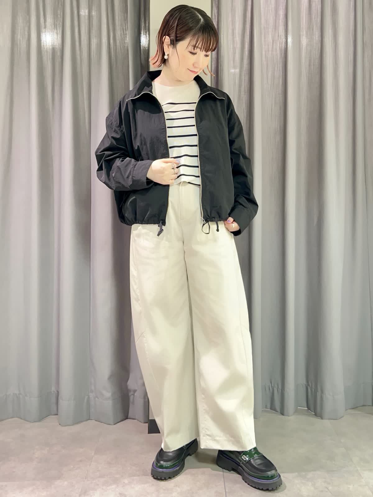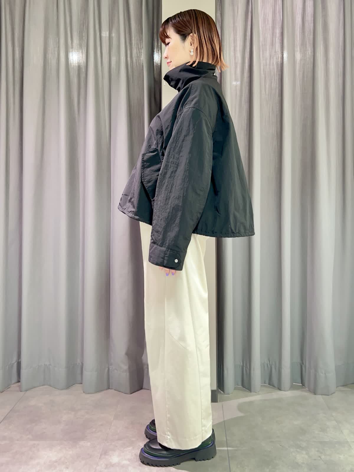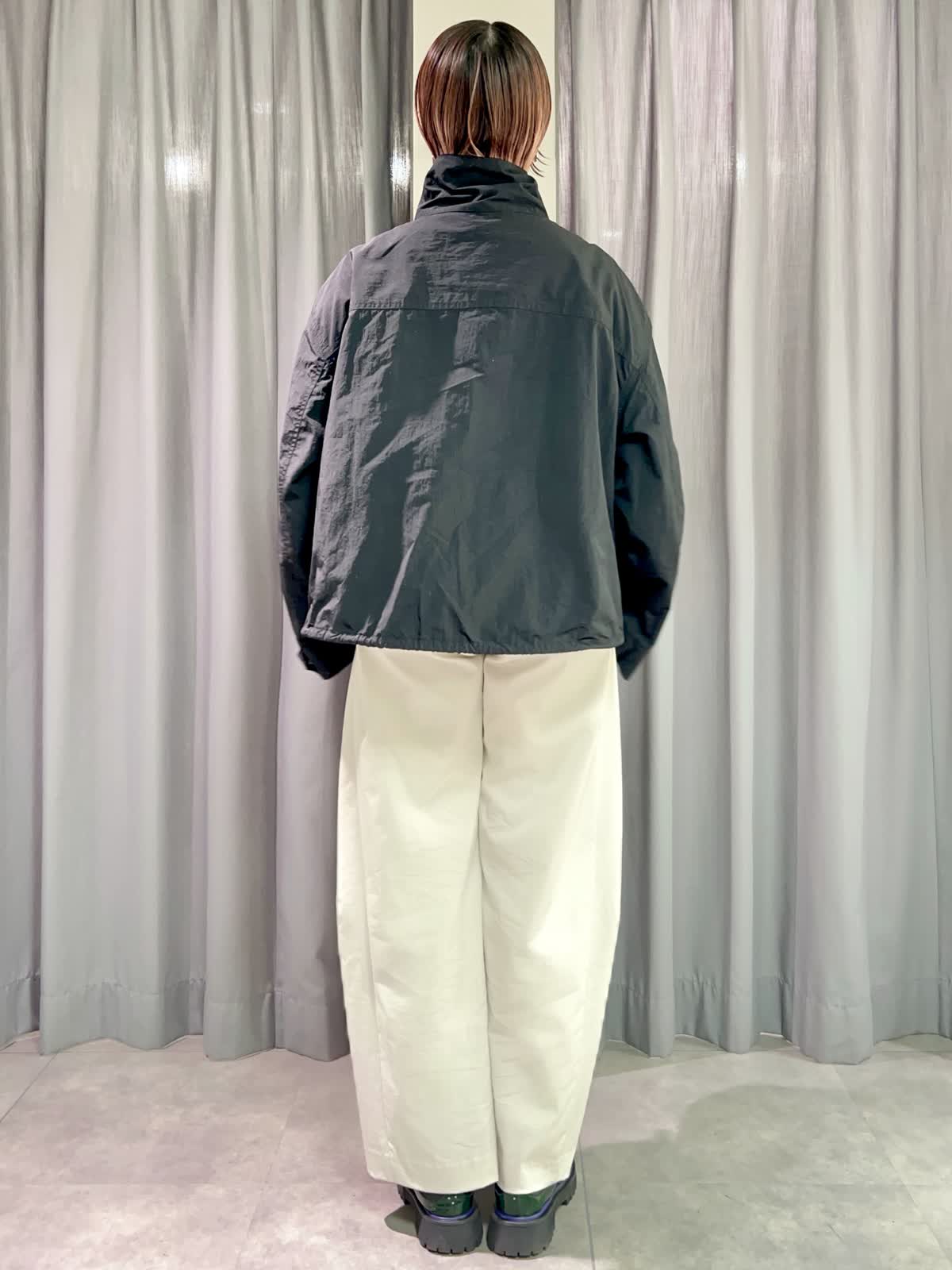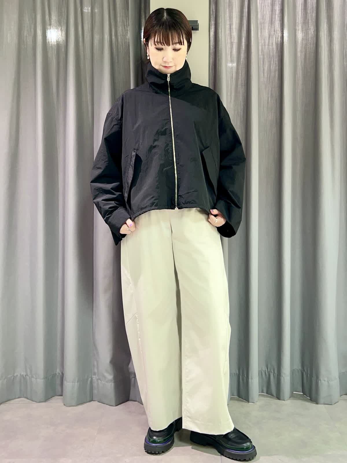 【着用サイズ/カラー】ブルゾン:フリー/ブラック ニット:フリー/グレーベージュ パンツ:11号/グレーベージュ 『春のカジュアルコーディネート』 [ブルゾン]ナイロン100%のドライタッチなライトブルゾンです。スタンドカラーとしても折り返して襟にしてもかわいいです。裾と袖口が調整出来るのでさまざまな表情で着られます。 [ニット]サラッとした着心地のオーバーサイズニットです。二の腕もカバーできる袖丈です。落ち感が良いのでインでもアウトでもサマになる一枚です。 [パンツ]程よくトレンド感の出るバレルパンツです。とても軽くサラッとした履き心地です。サイズは小さめで私は11号がギリギリでした。丈も短めで11号でちょうど良かったです。