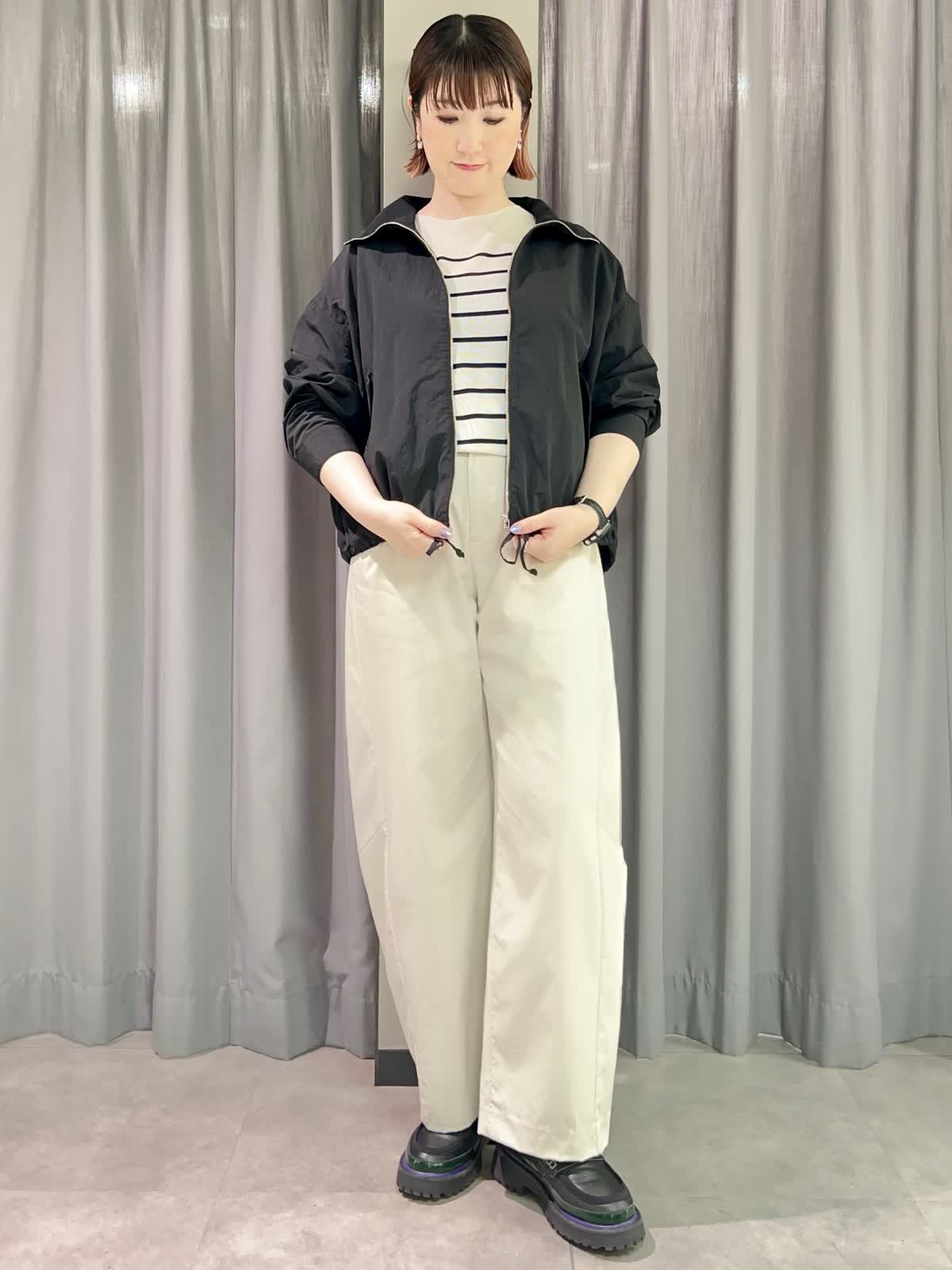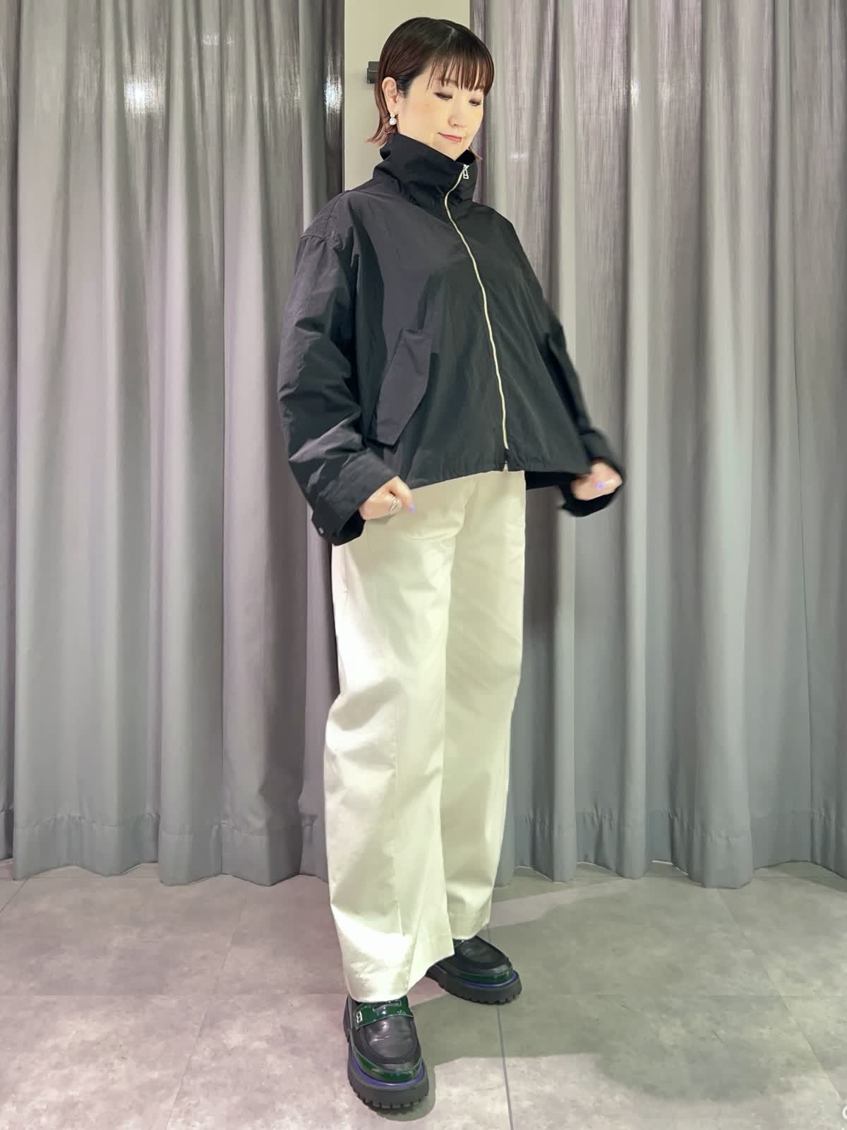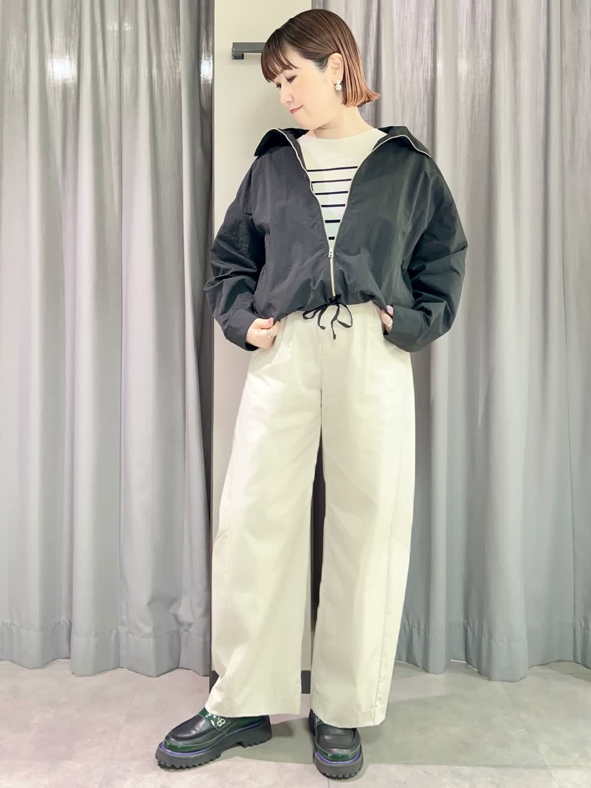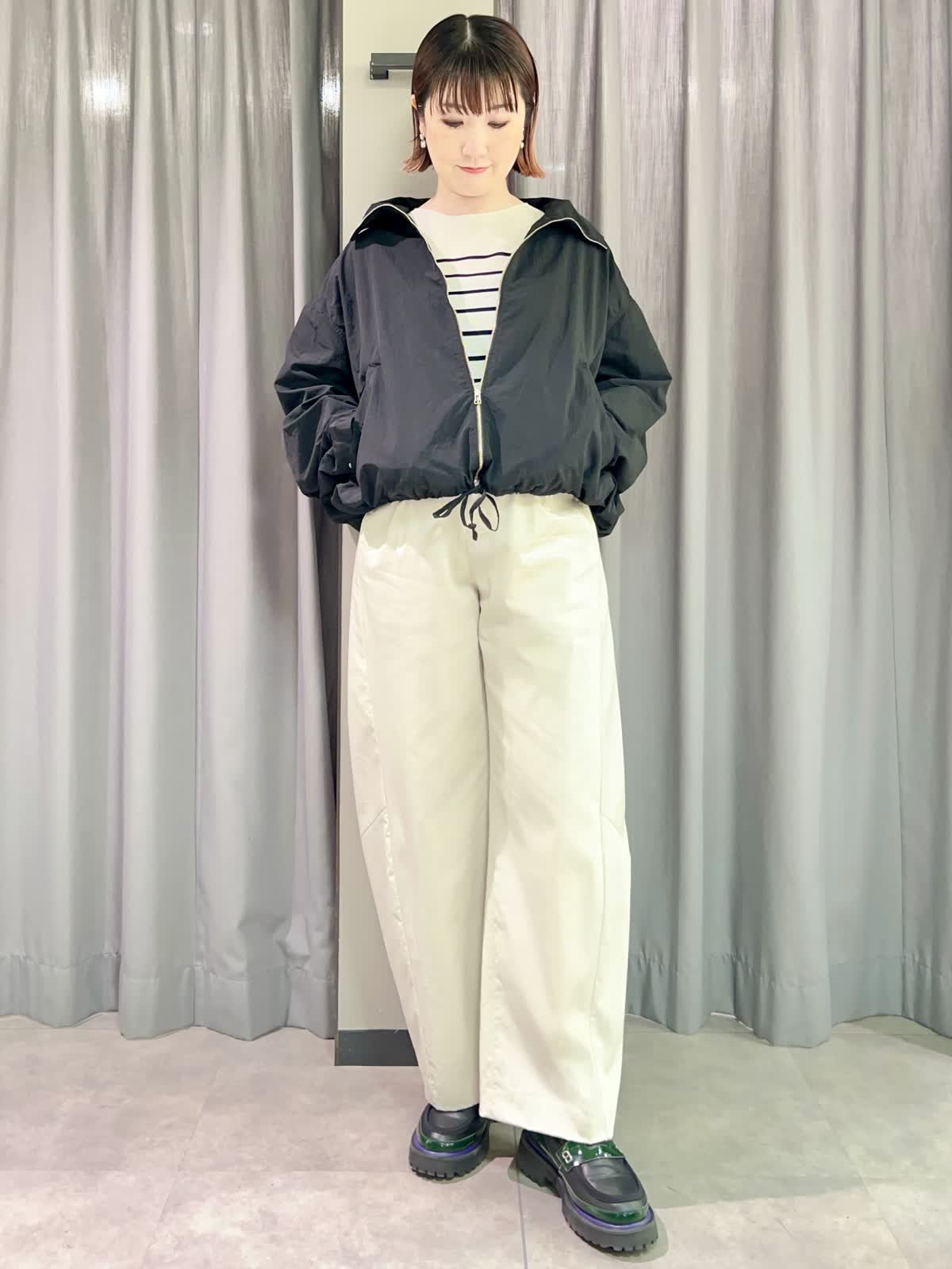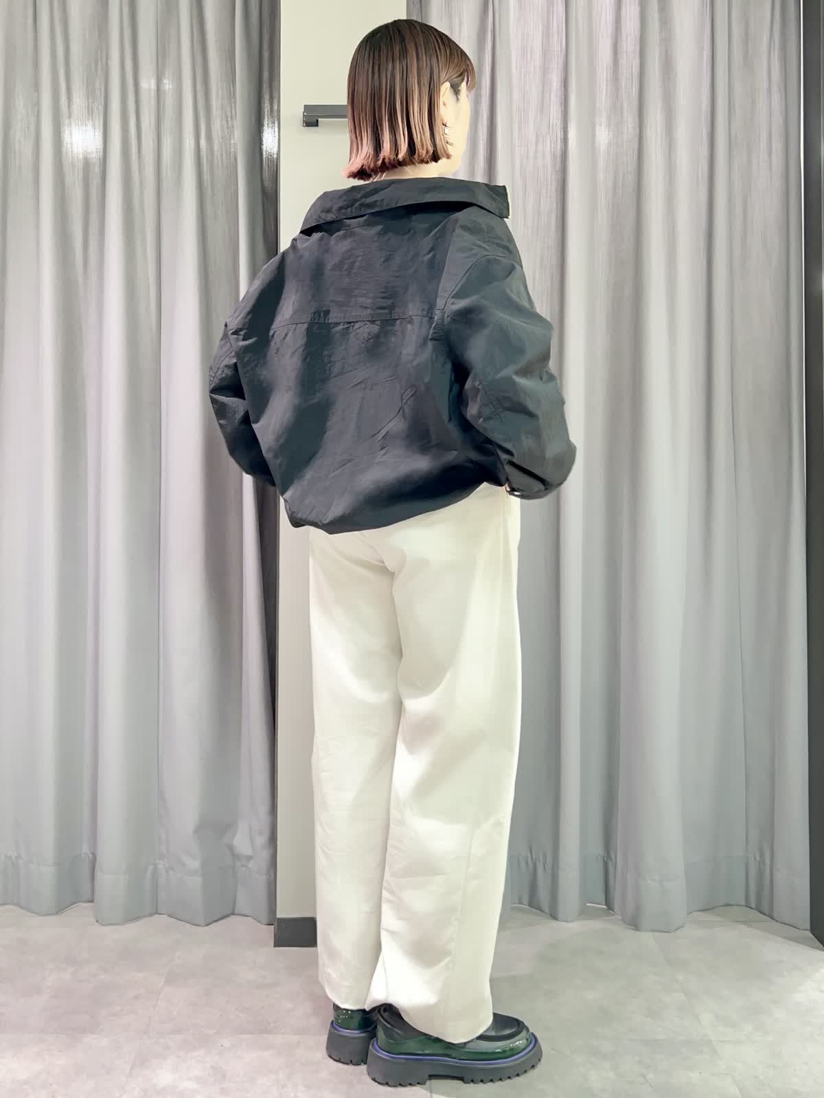 【着用サイズ/カラー】ブルゾン:フリー/ブラック ニット:フリー/グレーベージュ パンツ:11号/グレーベージュ 『春のカジュアルコーディネート』 [ブルゾン]ナイロン100%のドライタッチなライトブルゾンです。スタンドカラーとしても折り返して襟にしてもかわいいです。裾と袖口が調整出来るのでさまざまな表情で着られます。 [ニット]サラッとした着心地のオーバーサイズニットです。二の腕もカバーできる袖丈です。落ち感が良いのでインでもアウトでもサマになる一枚です。 [パンツ]程よくトレンド感の出るバレルパンツです。とても軽くサラッとした履き心地です。サイズは小さめで私は11号がギリギリでした。丈も短めで11号でちょうど良かったです。