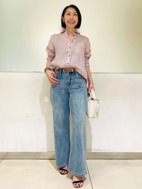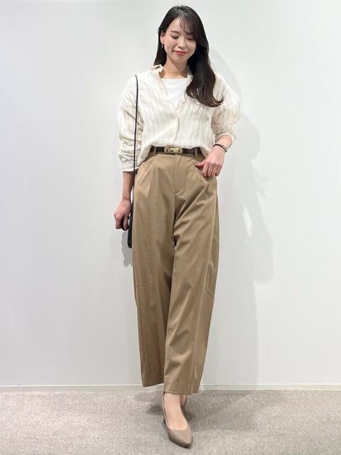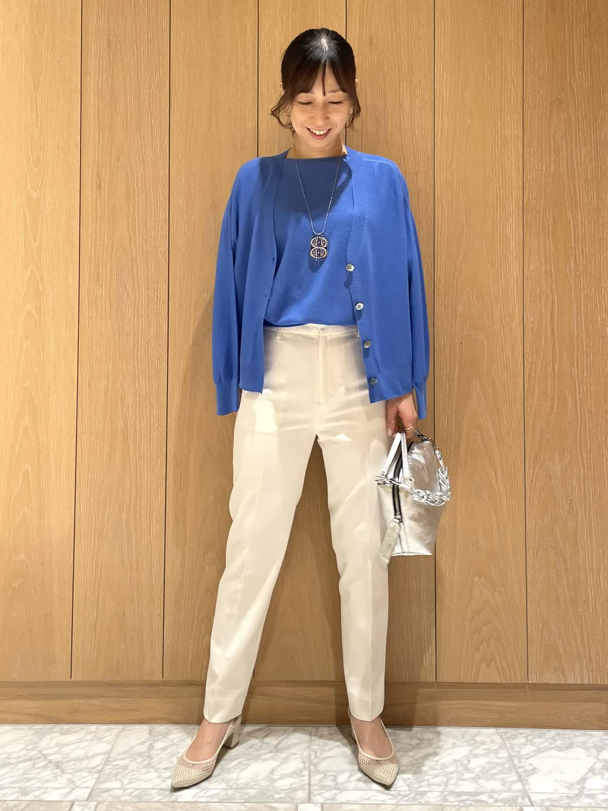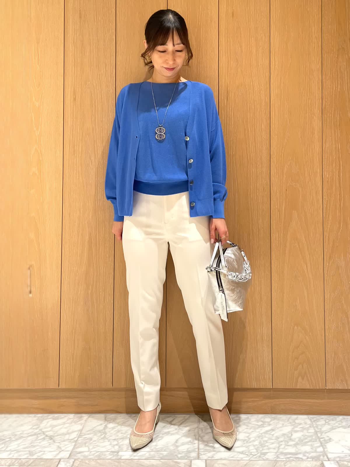 【着用サイズ・カラー】カーディガン・ニット :9号 ブルー パンツ : 7号 オフホワイト Cuooニットと美脚パンツを合わせたINEDの定番×定番スタイリングです。永く愛されるCuooのニットは、肌触りが良く、着るだけで女性らしい自然なシルエットになります。これからのシーズンはアンサンブルで揃えておくと大活躍です!スタイリングをシンプルにまとめたい時は、テーパードパンツがオススメです。