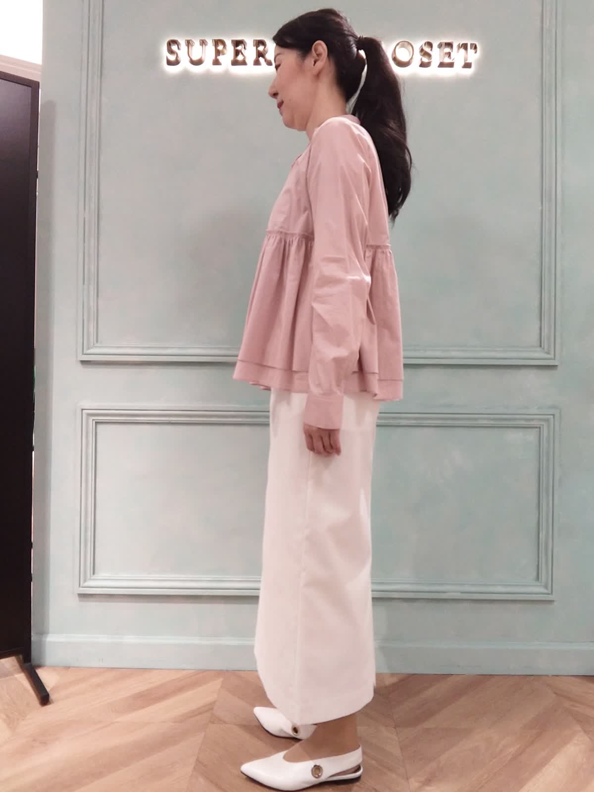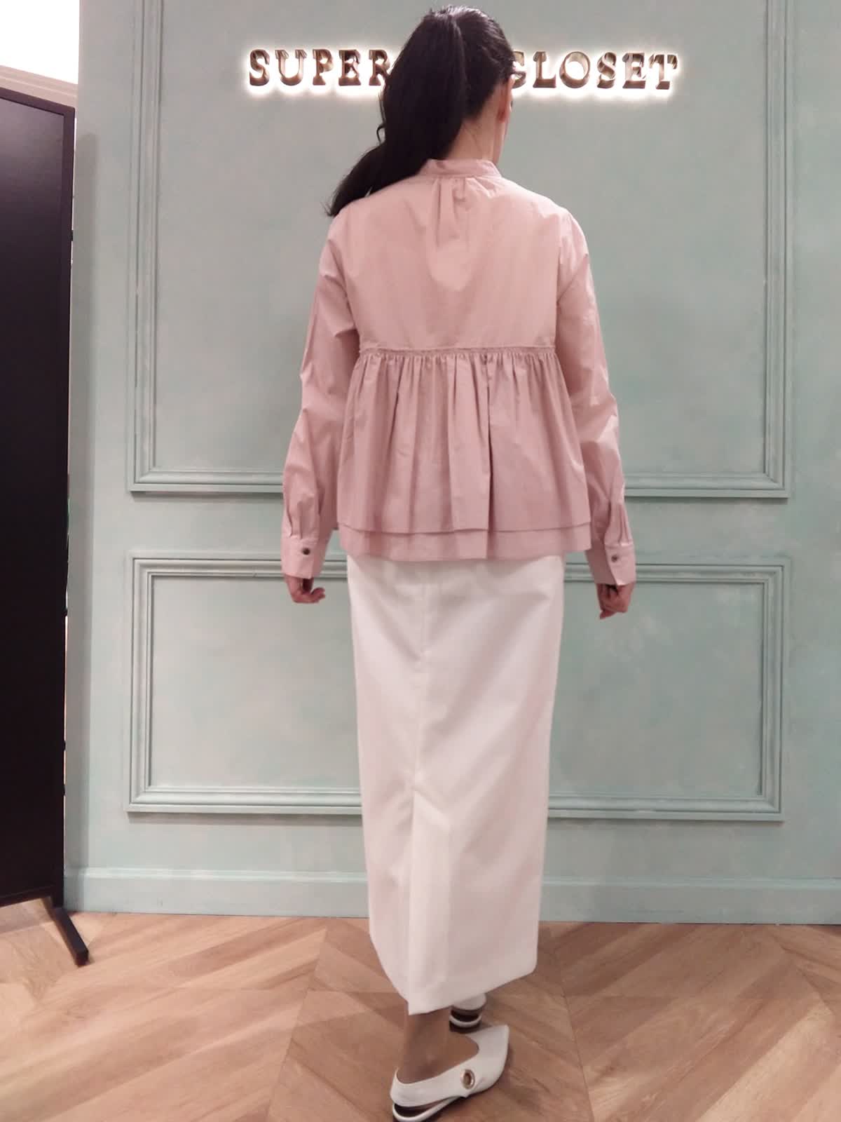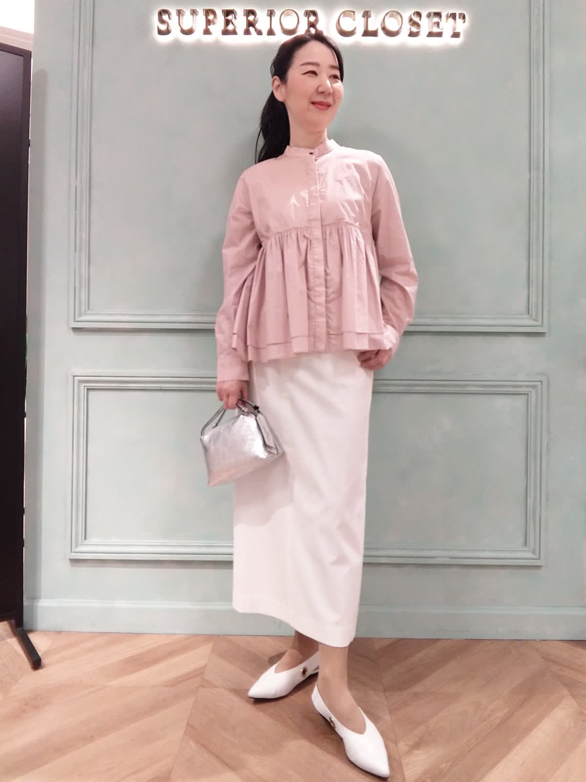 【着用サイズ】ブラウス:9号、スカート:9号 【着用カラー】ブラウス:ピンク、スカート:オフホワイト 大人のフェミニンブラウススタイル。ウエスト高め位置からギャザーのブラウスはフェミニンな印象に!長袖で季節の変わり目に1枚で着られるアイテムです。ストレートのタイトスカートと合わせて甘くなりすぎず、スッキリと全体のバランスよく着こなせます。