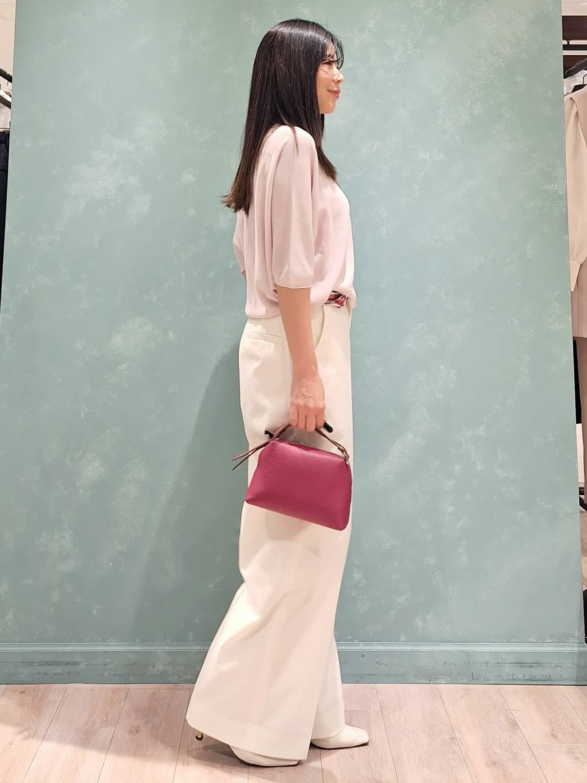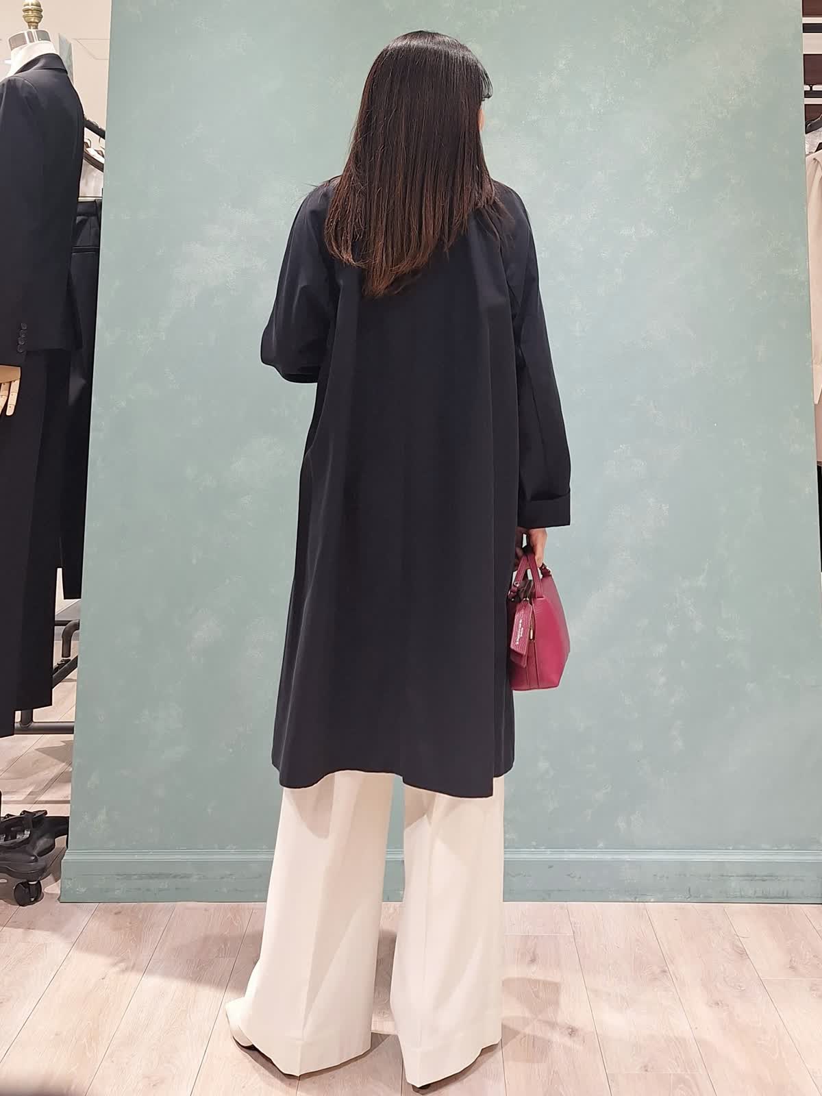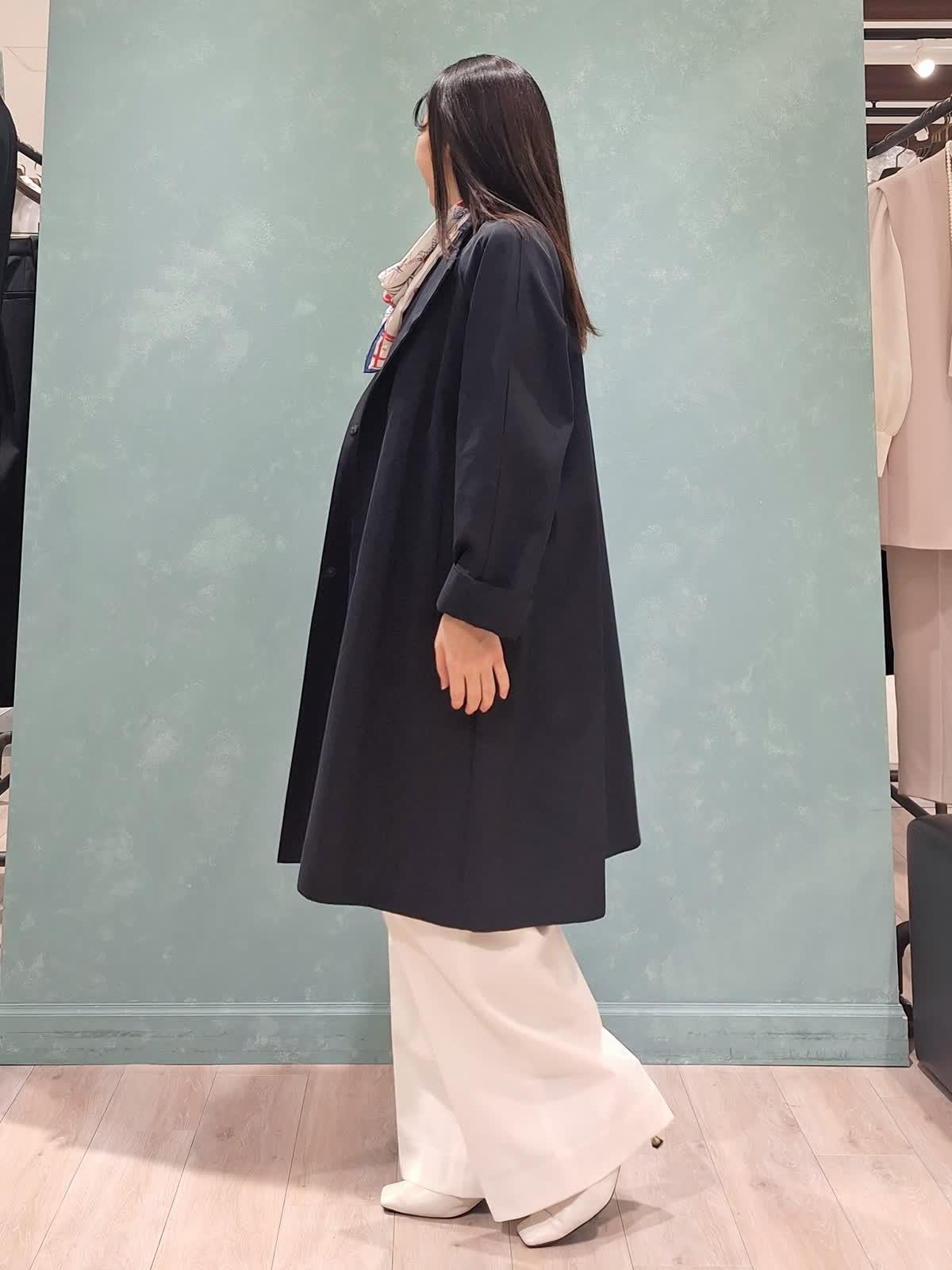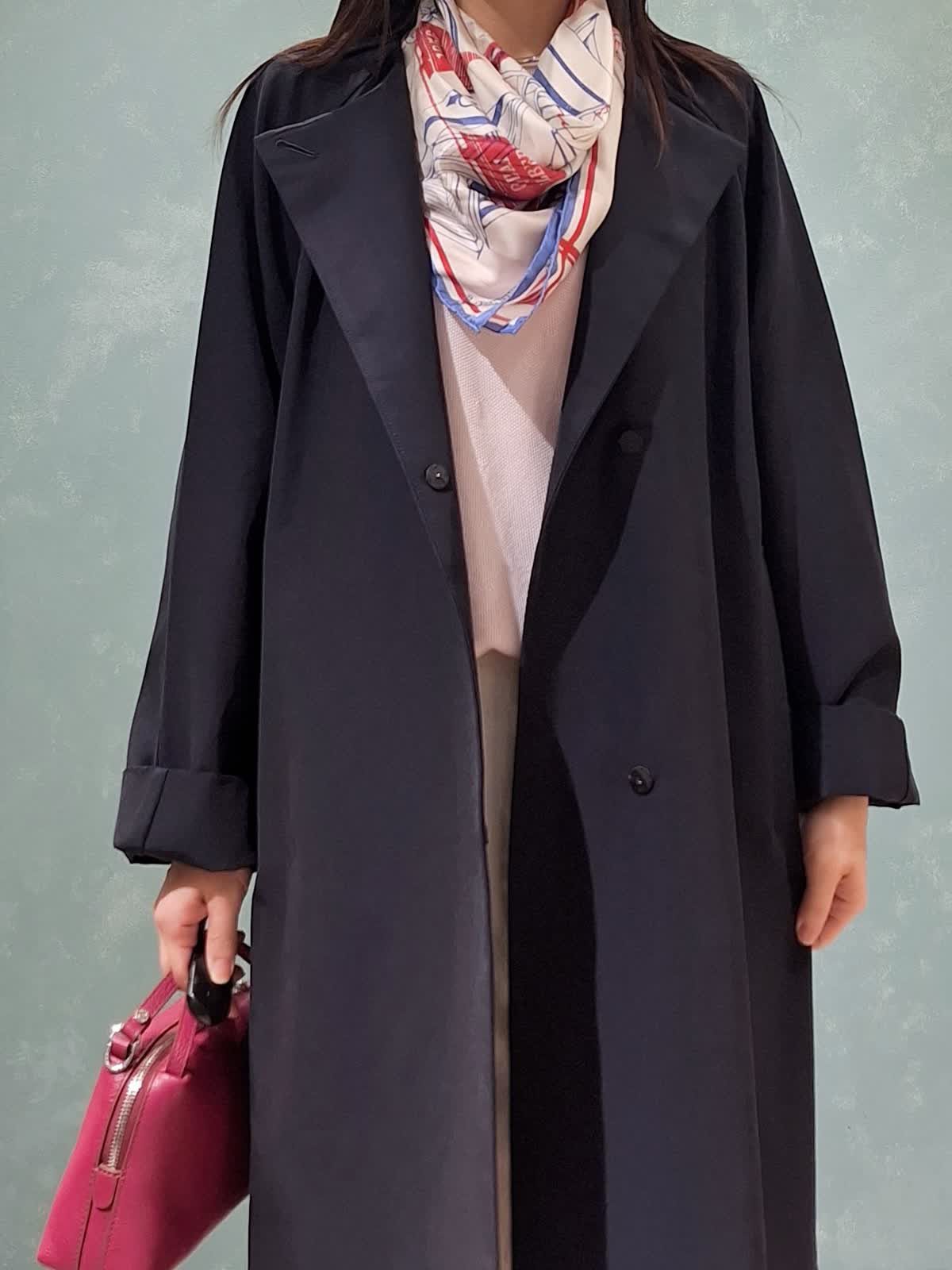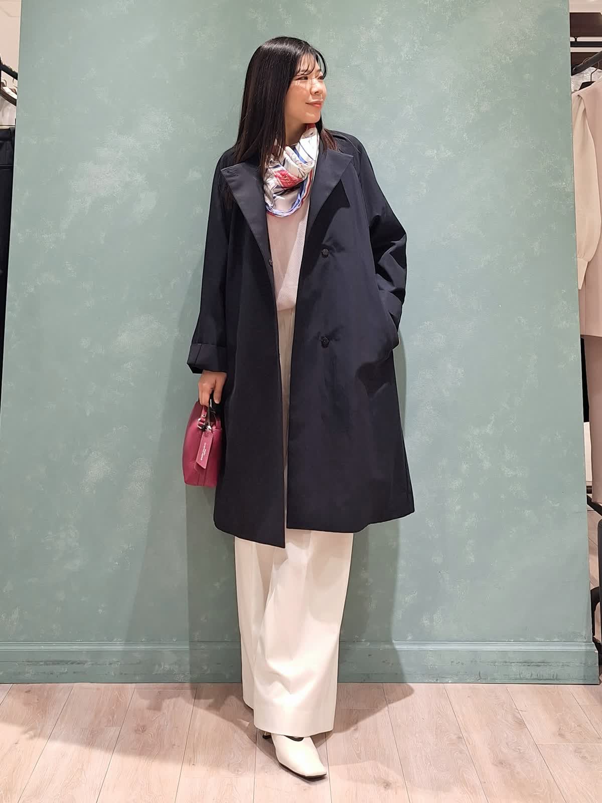 【着用サイズ、カラー】コート7号、ネイビー ニット:9号、グレイッシュピンク パンツ:7号、オフホワイト 春の休日お出掛けスタイル。アウターはAラインシルエットコート。張りがある微光沢生地で、通勤、休日どちらにも着ていただける万能コートです!開けて襟にしたり閉めてノーカラーにしたり、シーンや、気温に合わせた着こなしが出来ます。コートの中は毎年大人気のCUOOドルマンスリーブニットの新色グレイッシュピンク×セミワイドパンツを着用。首元にスカーフ+ピンクバッグで春らしく華やかにコーディネートしました。