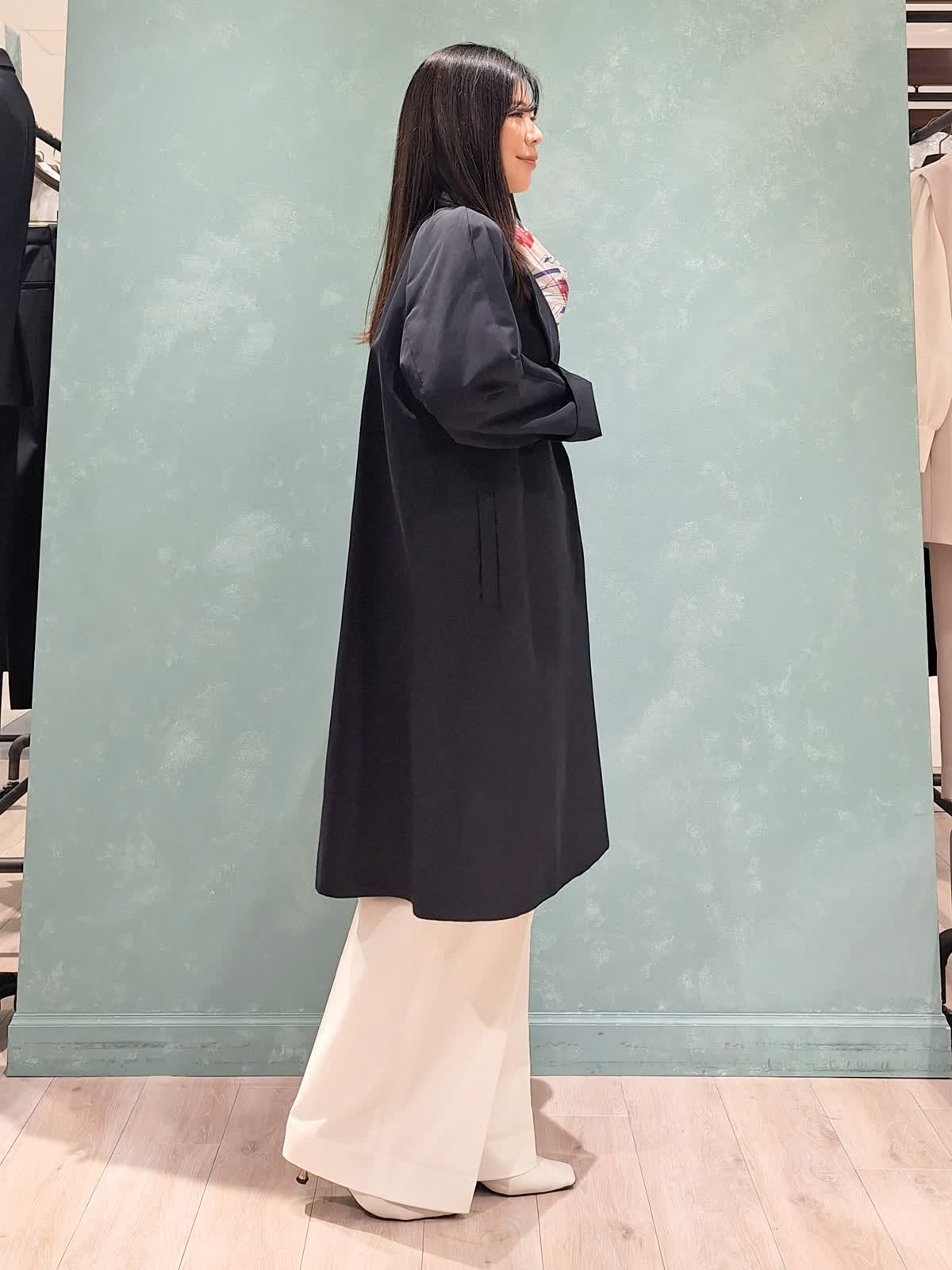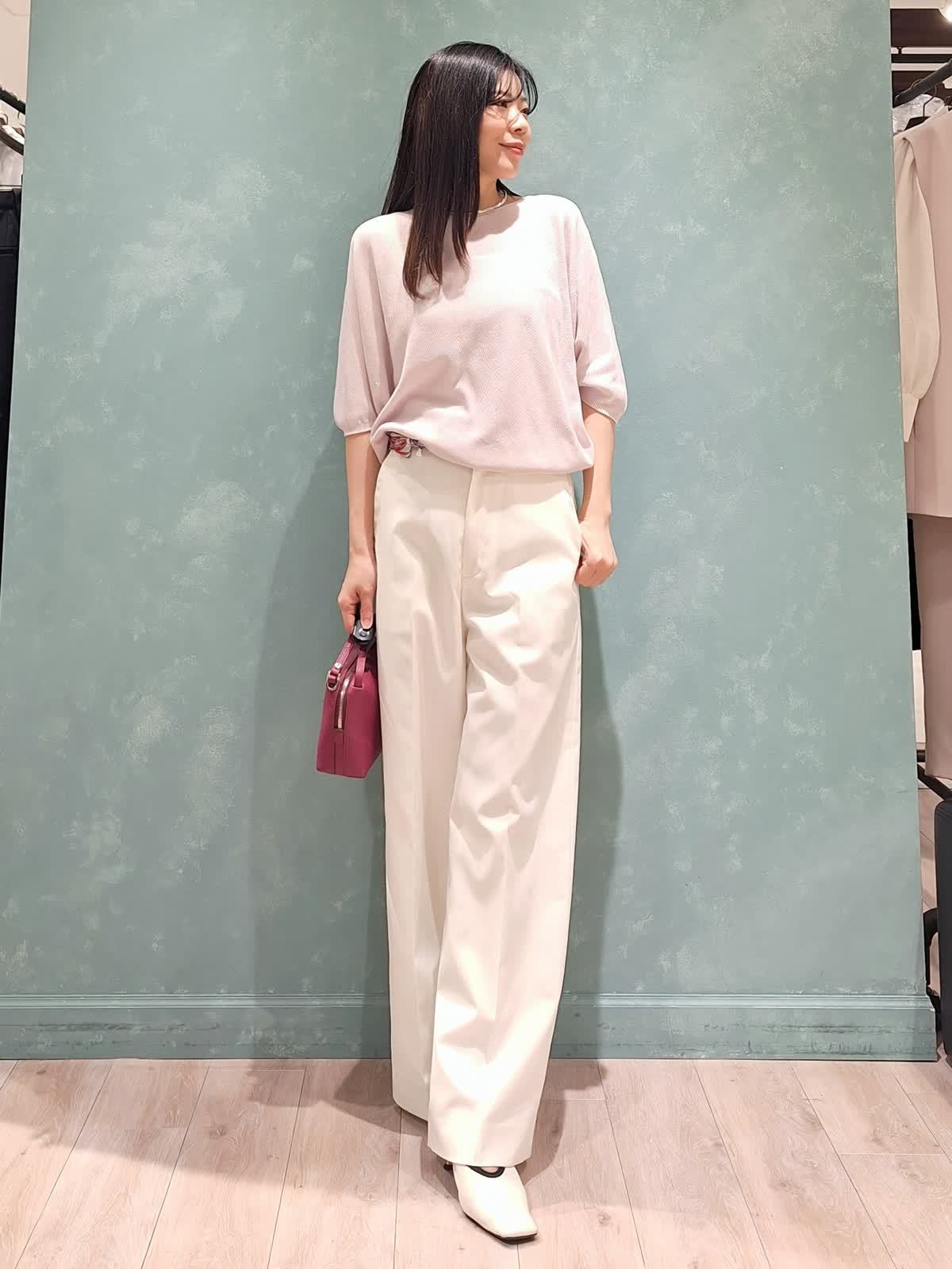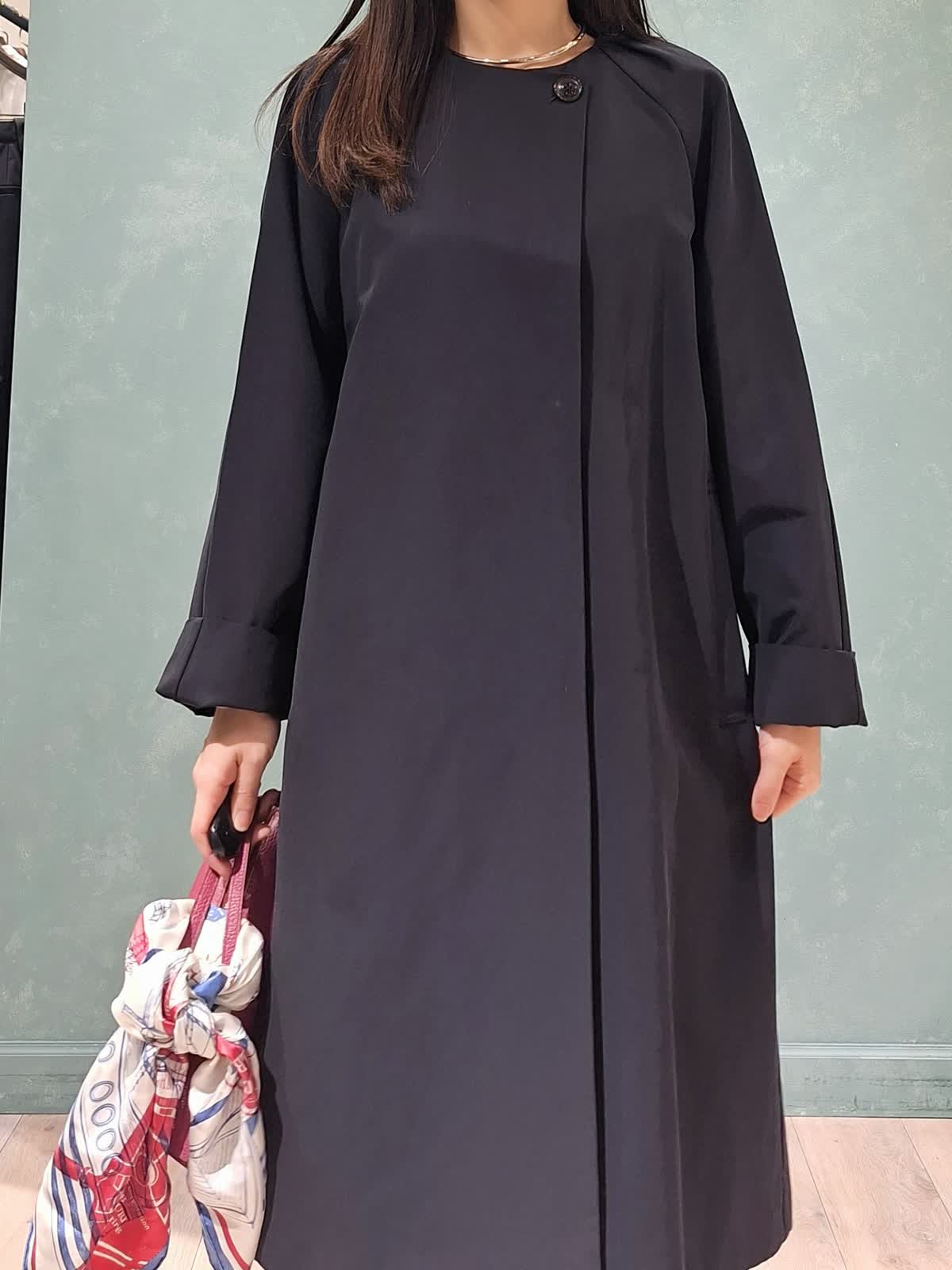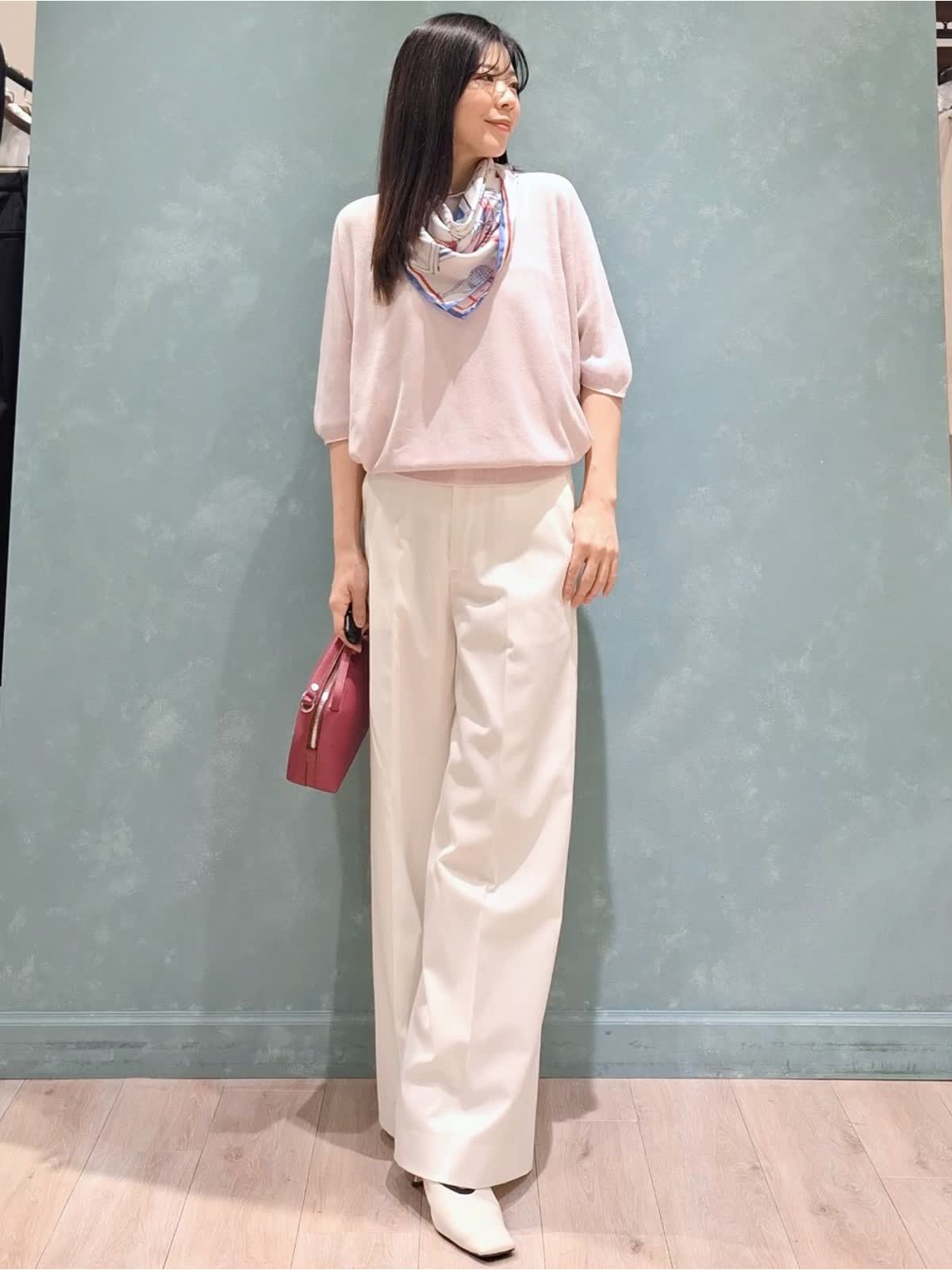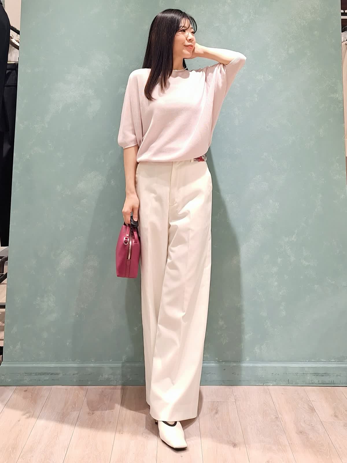 【着用サイズ、カラー】コート7号、ネイビー ニット:9号、グレイッシュピンク パンツ:7号、オフホワイト 春の休日お出掛けスタイル。アウターはAラインシルエットコート。張りがある微光沢生地で、通勤、休日どちらにも着ていただける万能コートです!開けて襟にしたり閉めてノーカラーにしたり、シーンや、気温に合わせた着こなしが出来ます。コートの中は毎年大人気のCUOOドルマンスリーブニットの新色グレイッシュピンク×セミワイドパンツを着用。首元にスカーフ+ピンクバッグで春らしく華やかにコーディネートしました。