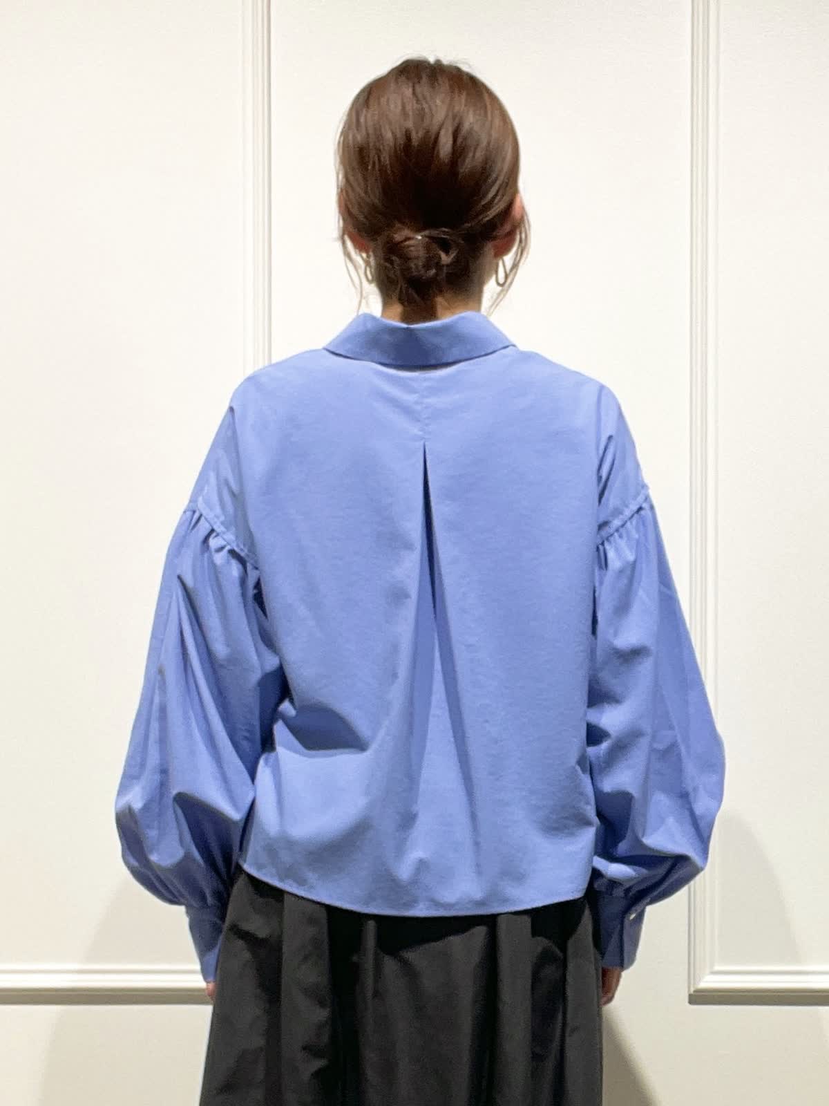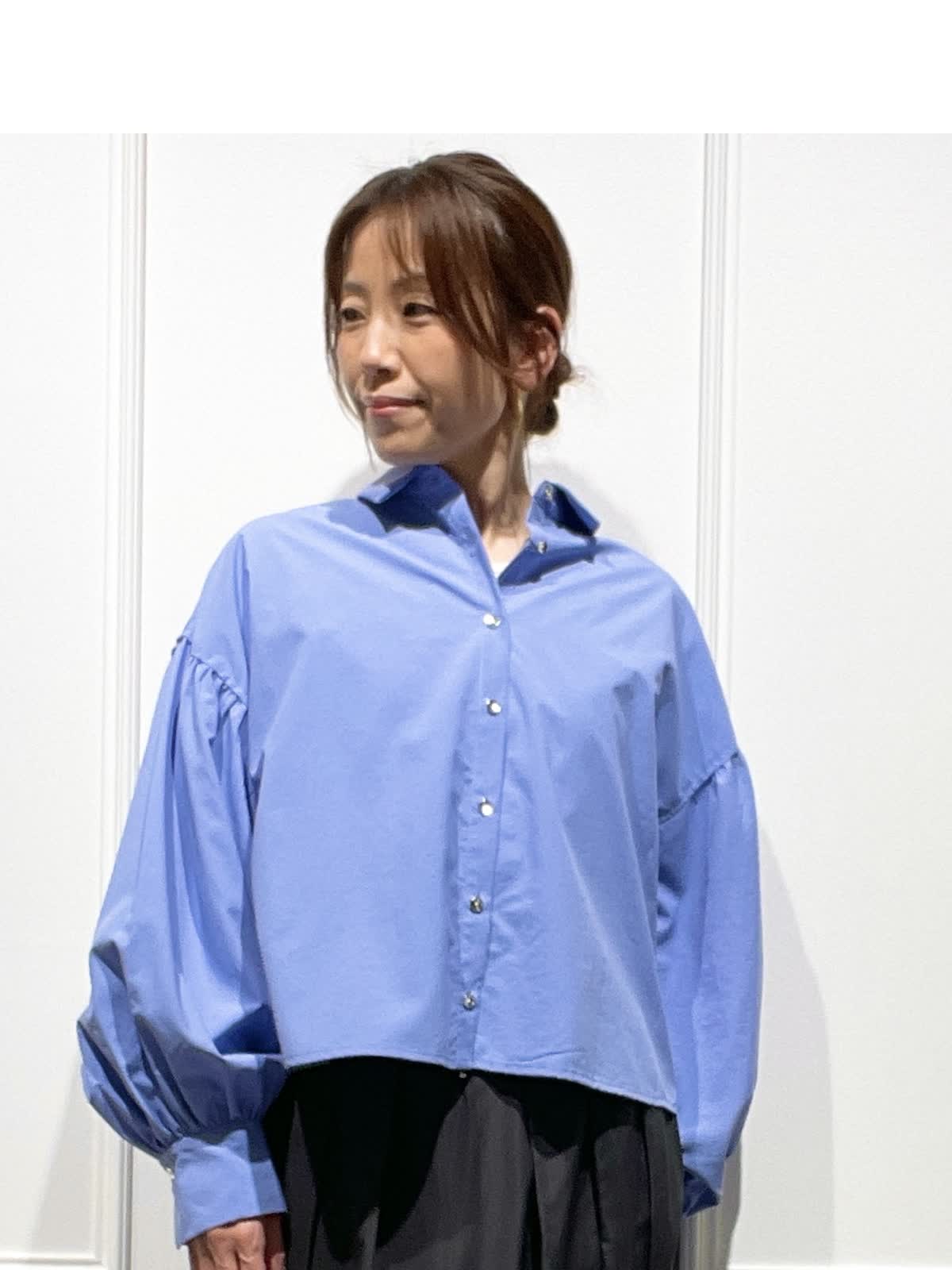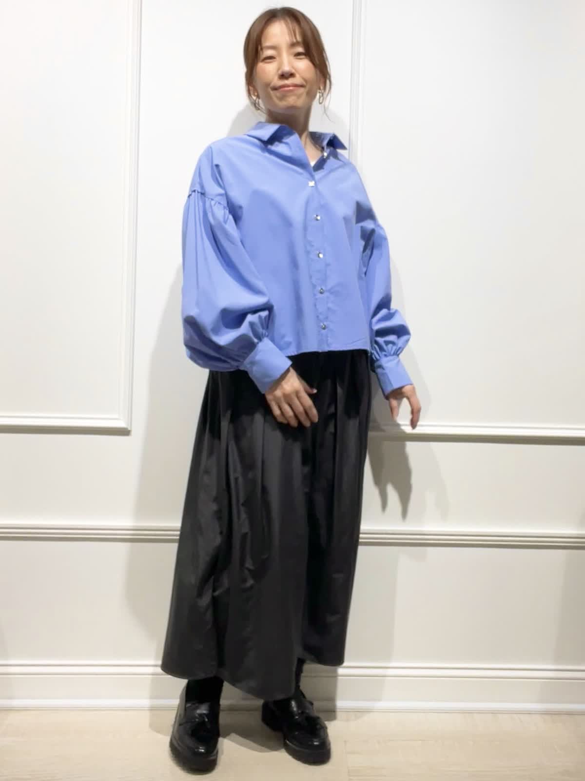 【着用アイテム:カラー/サイズ】 シャツ:サックス/9号 スカート:チャコールグレー/9号 クロップド丈の袖ぽわんシャツは、きちんと感もありオシャレに着れる優れもの。シワになりにくくイージーケアなのも、お仕事や旅行などにもぴったり。ややハイウエストのスカートは、後ろゴムでサイズ気にせず着て頂けます。丁度よいミディ丈が小柄さんも着やすいです。