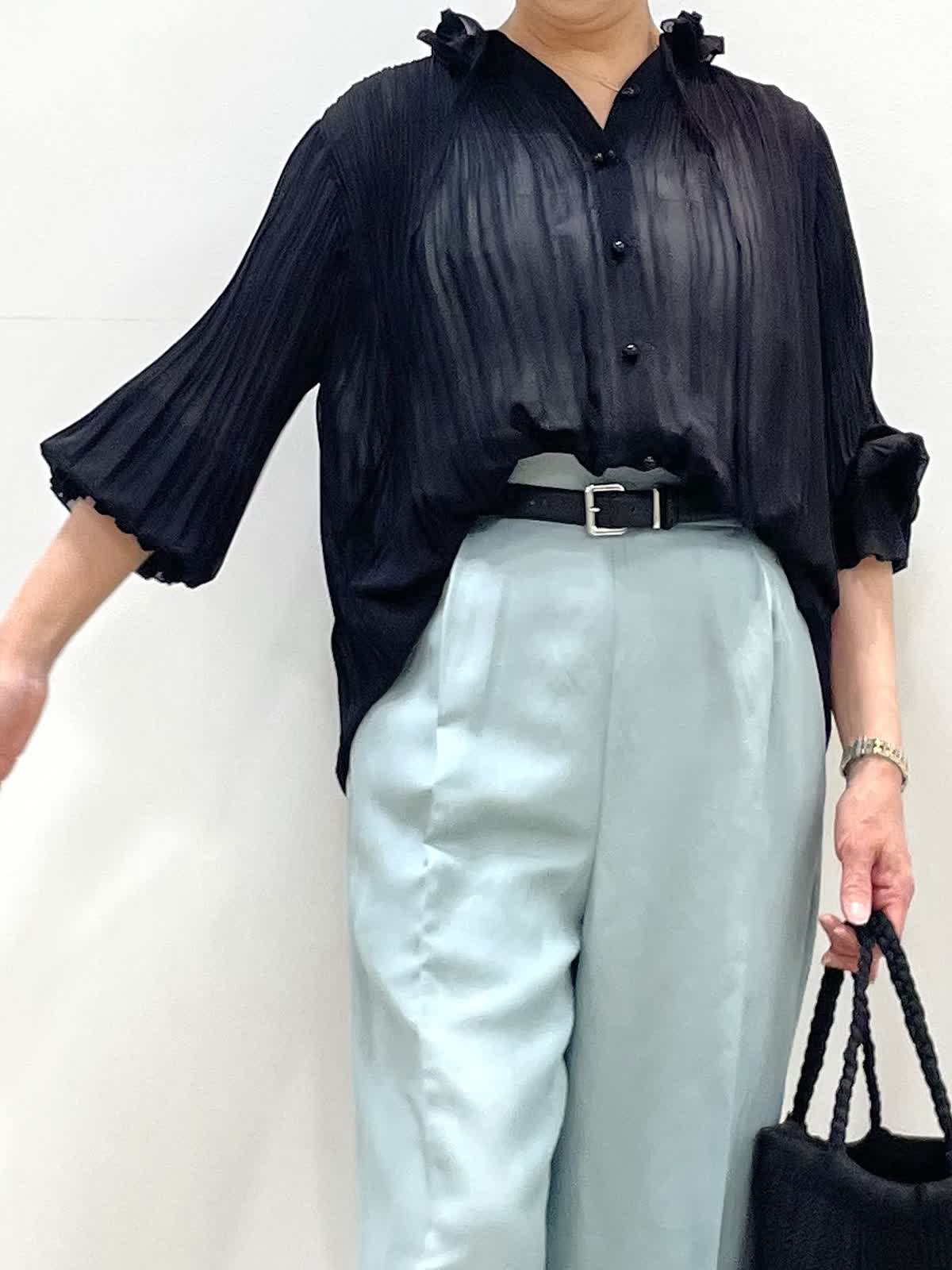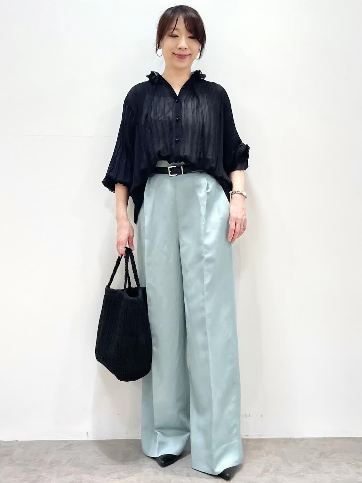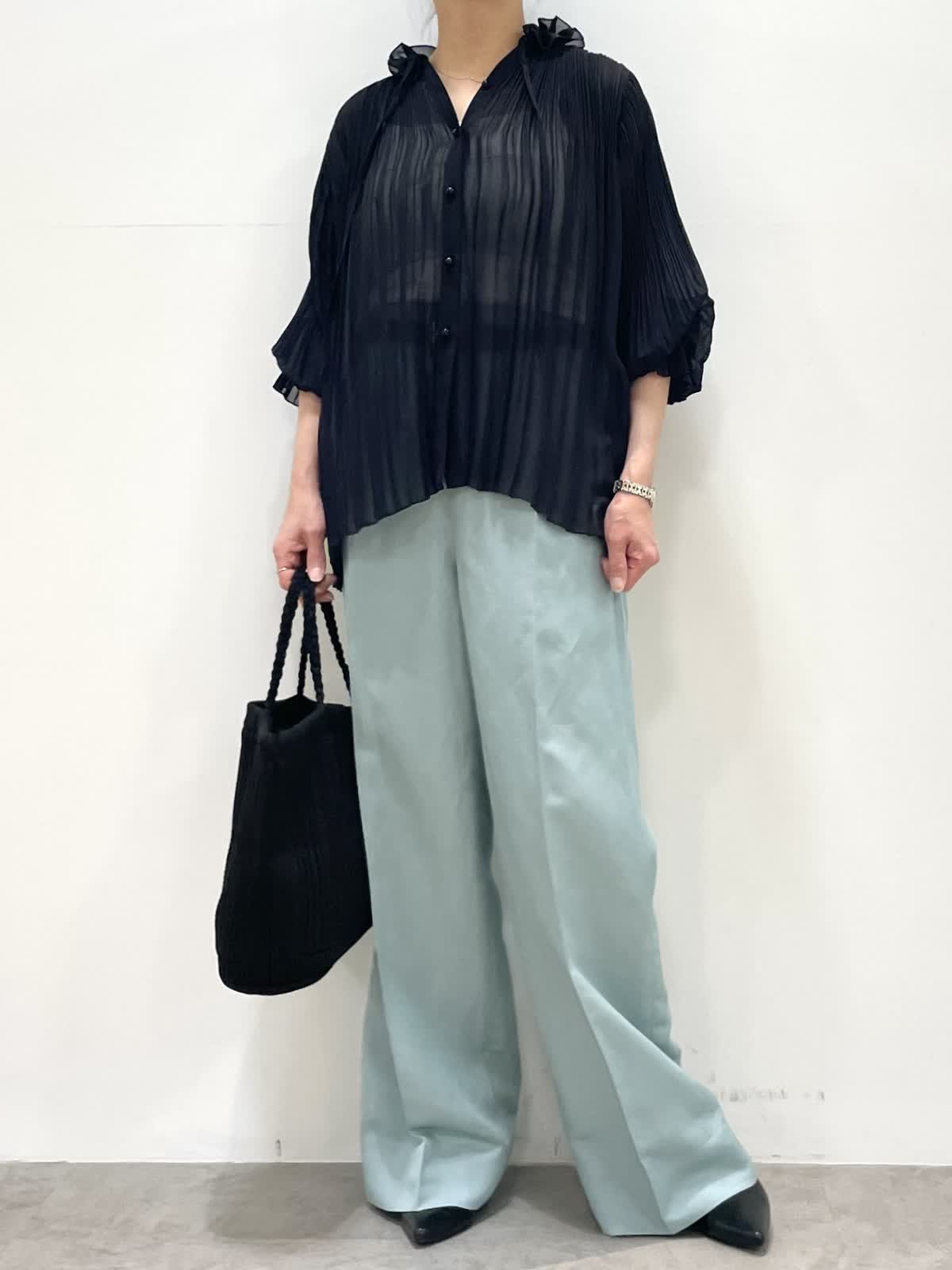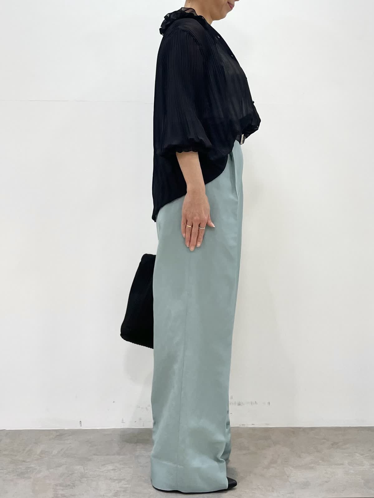 【着用サイズ】全て9号 【着用カラー】ブラウス:ブラック パンツ:ペーパーミント ブラウスはプリーツ使いで細見えが叶います。裾はイン、アウトどちらでもバランスが取りやすい着丈でさまざまなボトムと好相性。袖をプッシュアップしてボリュームを出した着こなしもおすすめです。パンツはラインを拾わないワイドシルエット。キュプラ特有の上品な光沢感があります。目を引くカラーはコーディネートの主役になってくれます。