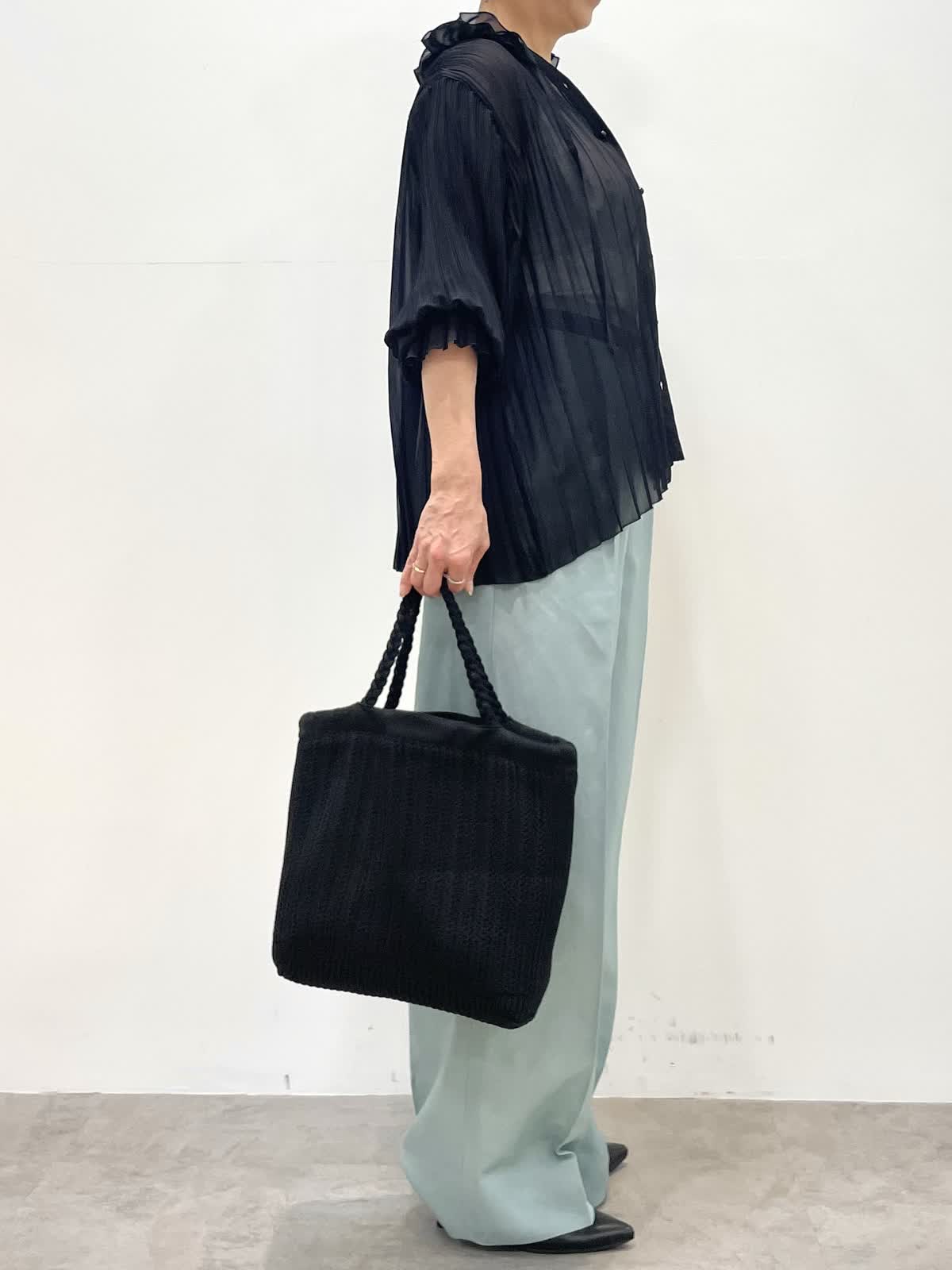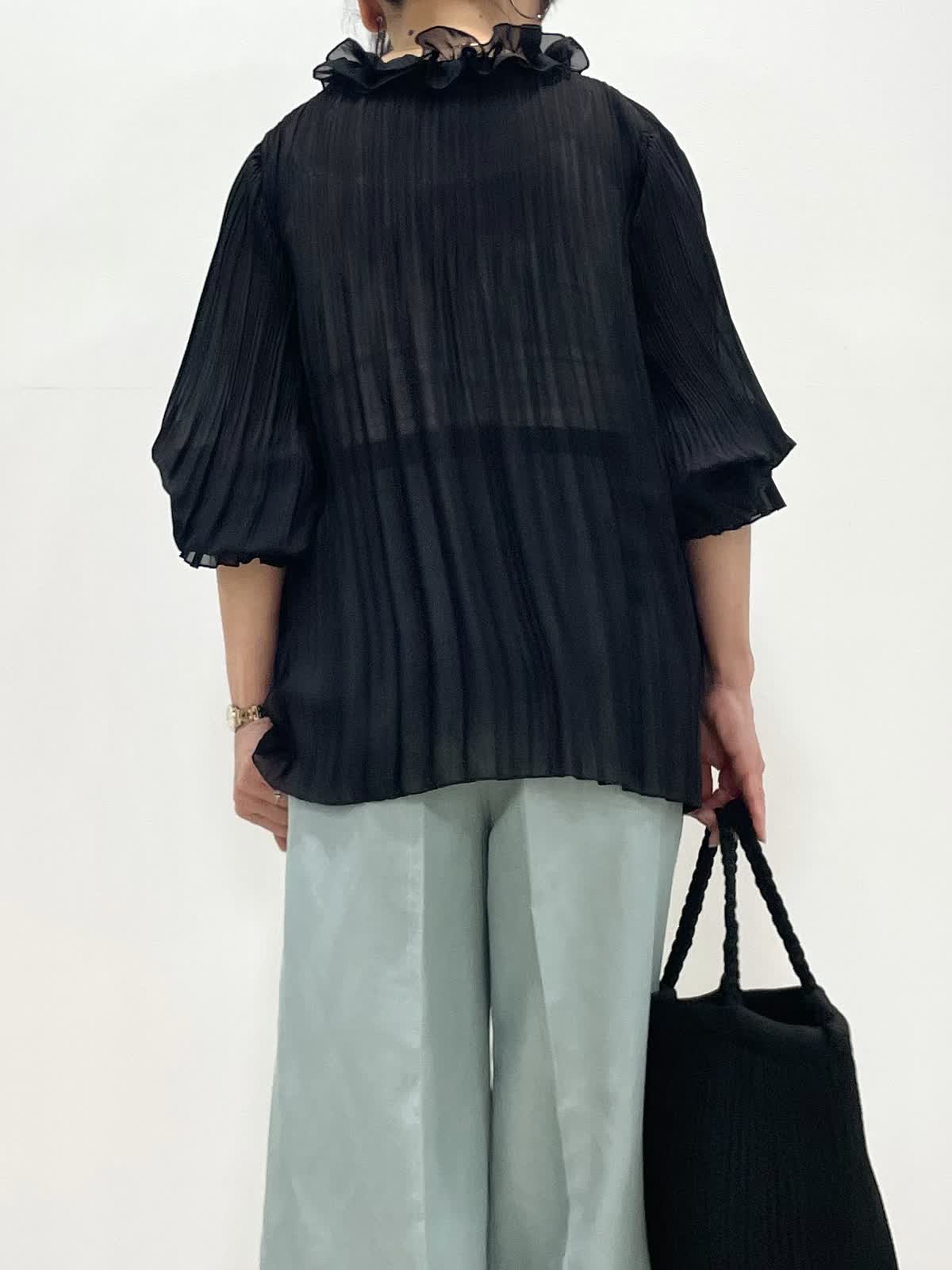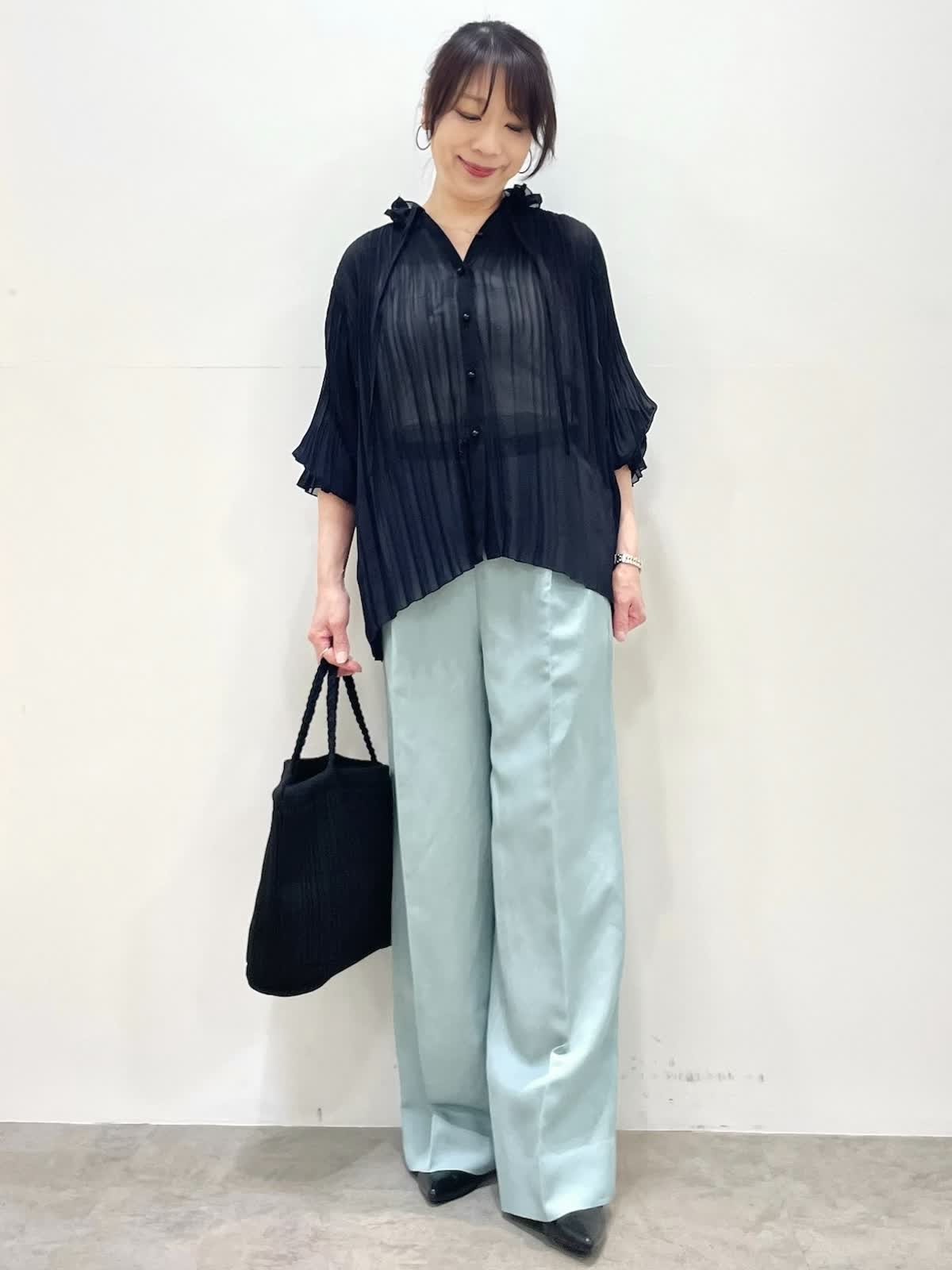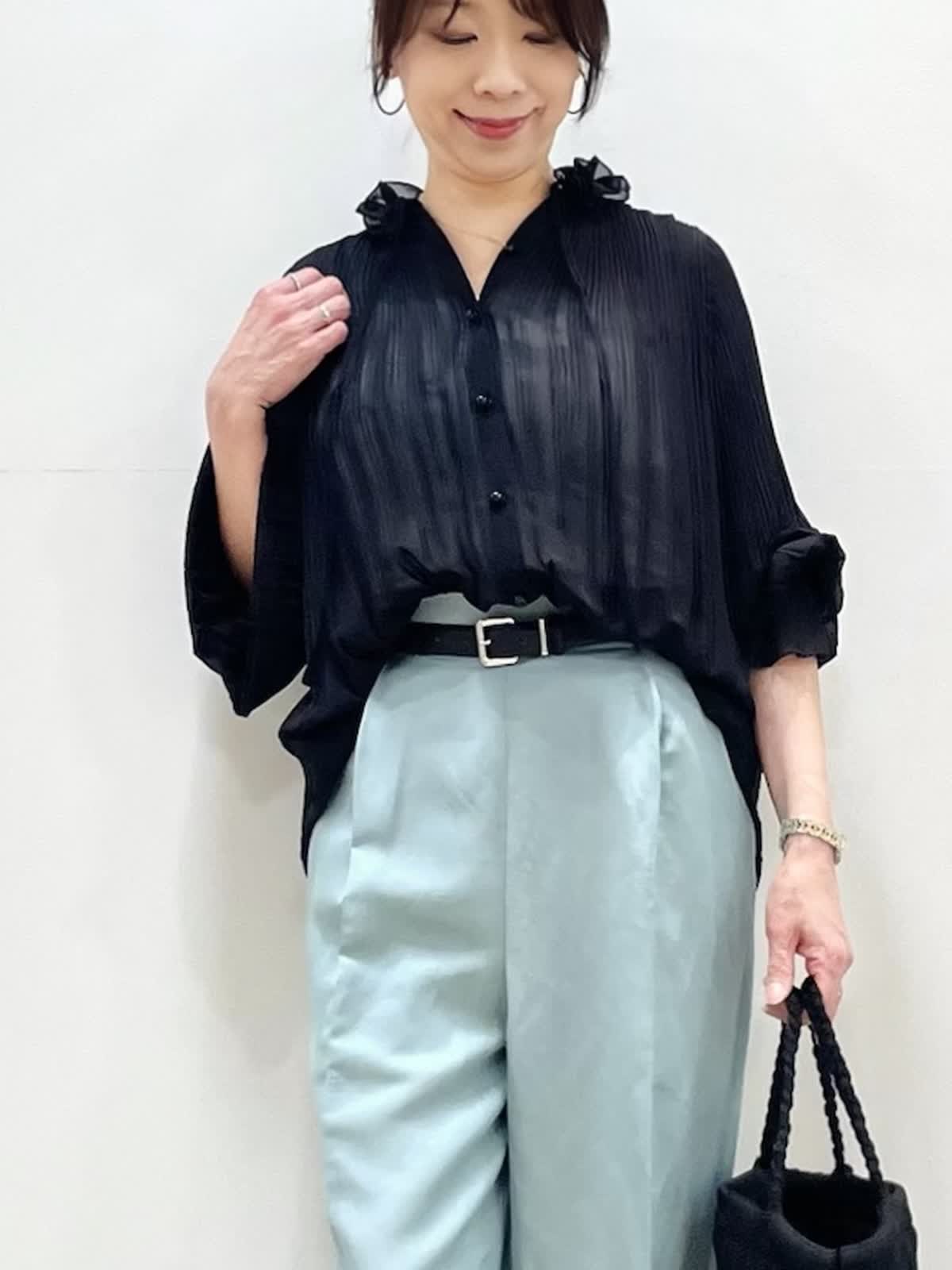 【着用サイズ】全て9号 【着用カラー】ブラウス:ブラック パンツ:ペーパーミント ブラウスはプリーツ使いで細見えが叶います。裾はイン、アウトどちらでもバランスが取りやすい着丈でさまざまなボトムと好相性。袖をプッシュアップしてボリュームを出した着こなしもおすすめです。パンツはラインを拾わないワイドシルエット。キュプラ特有の上品な光沢感があります。目を引くカラーはコーディネートの主役になってくれます。
