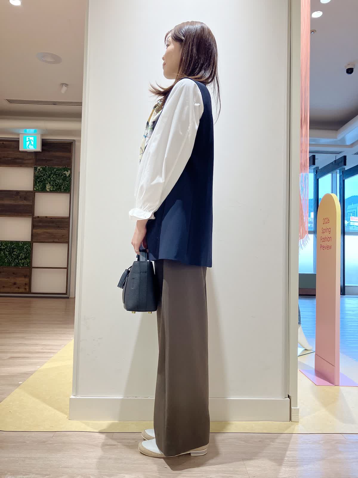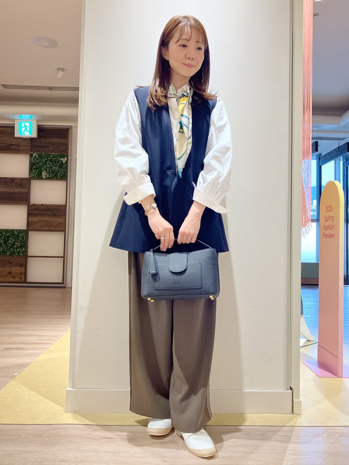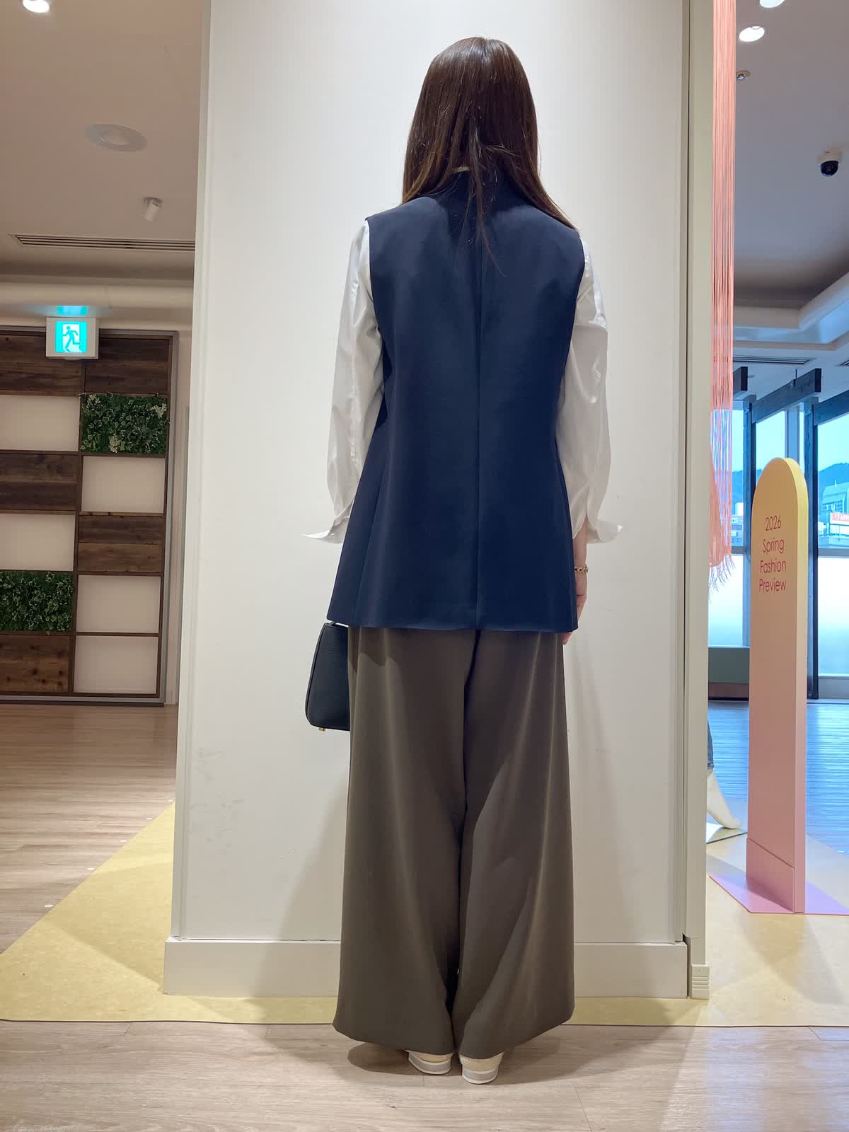 【着用サイズ】ジレ:9号 ブラウス:9号 パンツ:7号 【着用カラー】ジレ:ネイビー ブラウス:オフホワイト パンツ:カーキ コーディネートのテーマは春のお出かけスタイリングです。ジレをエレガンスカジュアルにコーディネートして、お仕事にもプライベートにもおすすめスタイリングです。洗えるのも今からの季節嬉しいポイント。