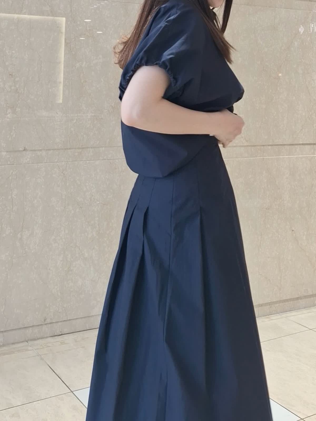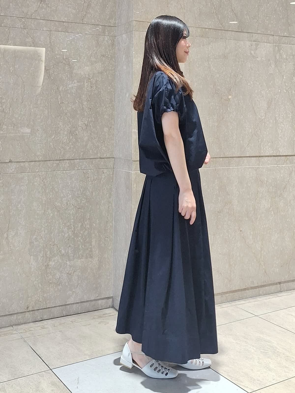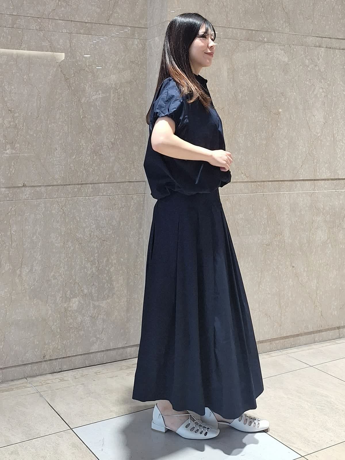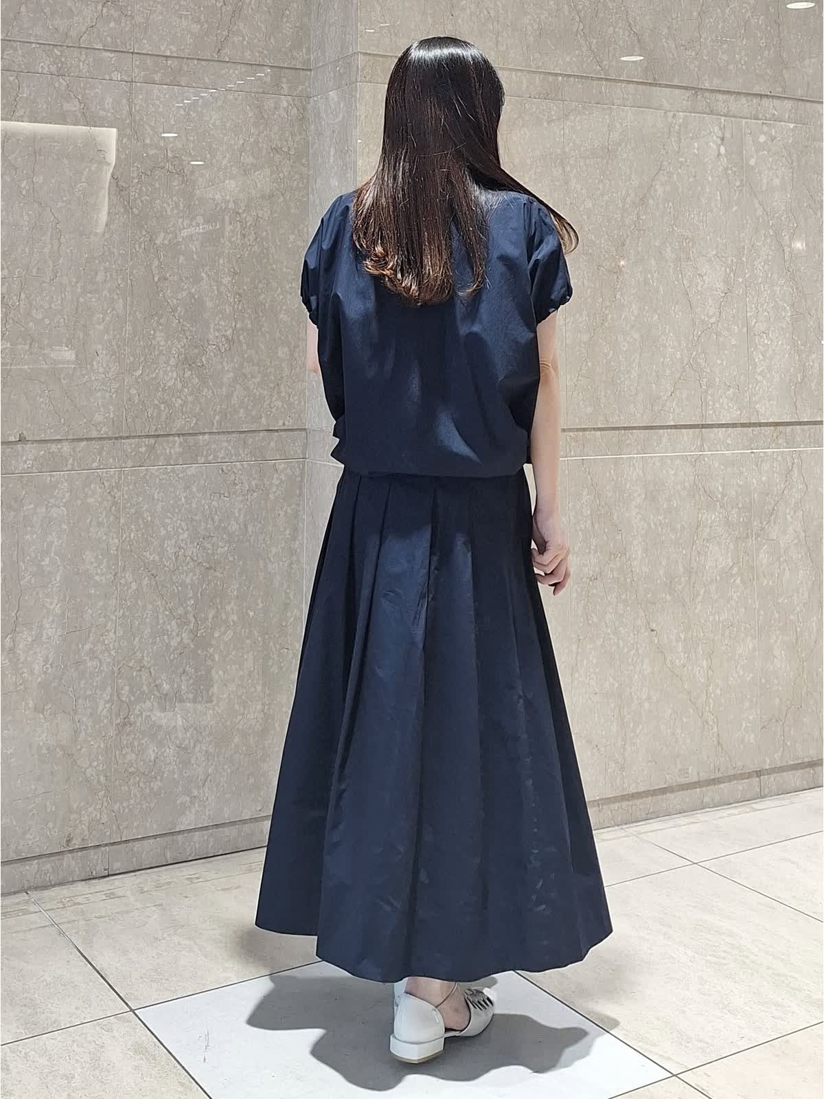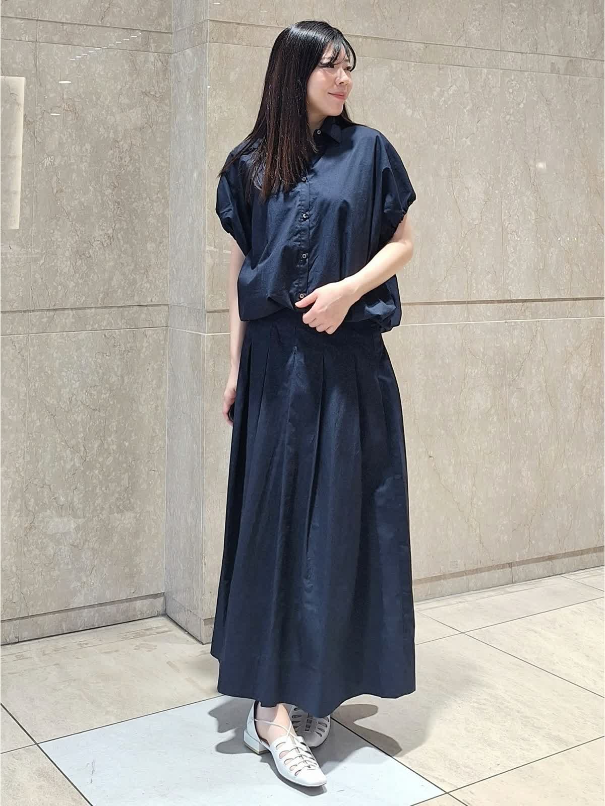 【着用サイズ、カラー】ブラウス:9号、ネイビー スカート:7号、ネイビー 《コラボSTORY》ツーピーススタイル。綿100%のタイプライター生地でハリ感があり、ドライタッチで軽い着心地です。ギャザーシャツブラウスは、裾が絞れるデザインで丸みのあるフォルムが作れます。ボトムに合わせて調節するのがお勧めです。お袖口はゴム入り。動きやすくて気になる二の腕もスッキリ見えます。タックスカートは、腰回りスッキリのフレアライン。長めの着丈で安心感あり。パンプス、サンダル、スニーカー全部合います!ツーピースで揃えておくとお出掛けの時に考えなくていいので便利です♪