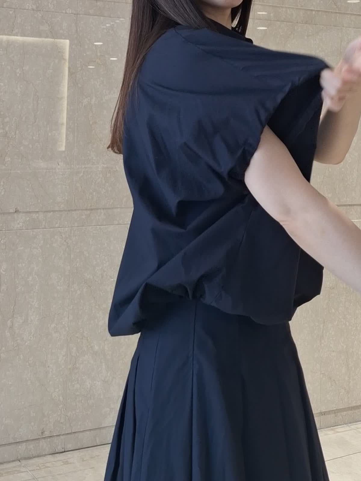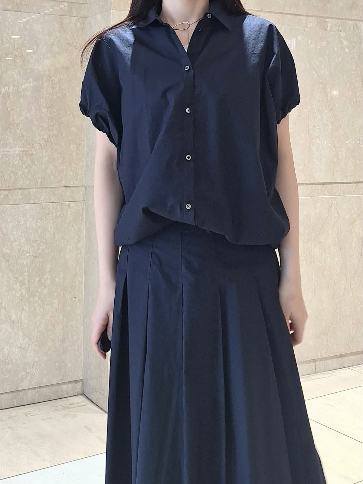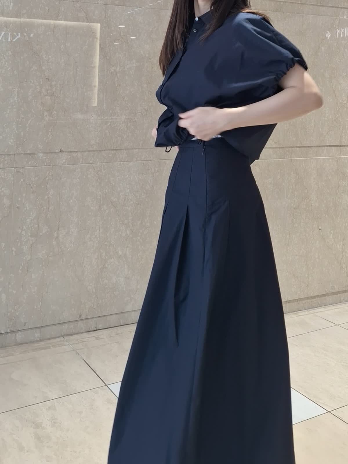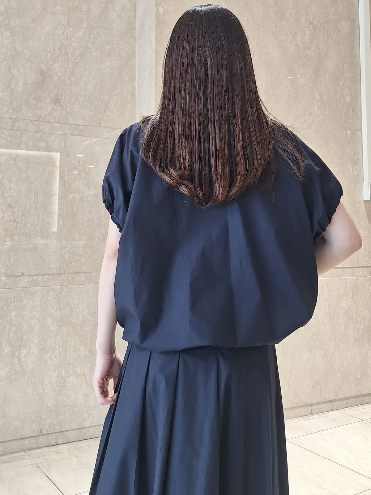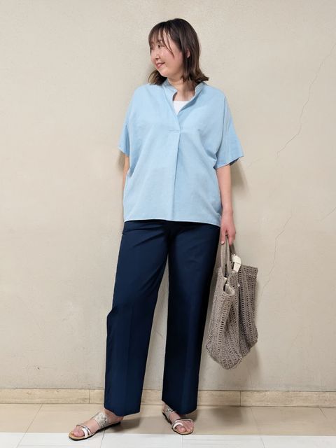 【着用サイズ、カラー】ブラウス:9号、ネイビー スカート:7号、ネイビー 《コラボSTORY》ツーピーススタイル。綿100%のタイプライター生地でハリ感があり、ドライタッチで軽い着心地です。ギャザーシャツブラウスは、裾が絞れるデザインで丸みのあるフォルムが作れます。ボトムに合わせて調節するのがお勧めです。お袖口はゴム入り。動きやすくて気になる二の腕もスッキリ見えます。タックスカートは、腰回りスッキリのフレアライン。長めの着丈で安心感あり。パンプス、サンダル、スニーカー全部合います!ツーピースで揃えておくとお出掛けの時に考えなくていいので便利です♪