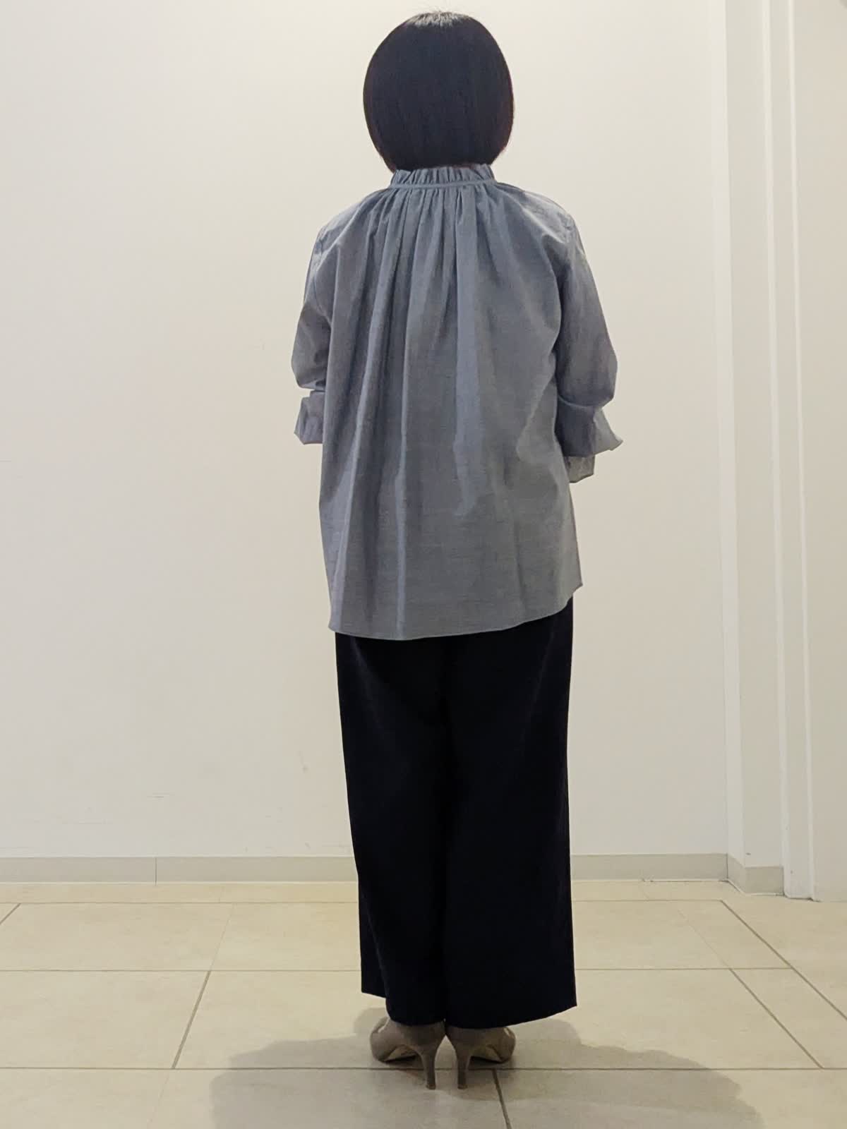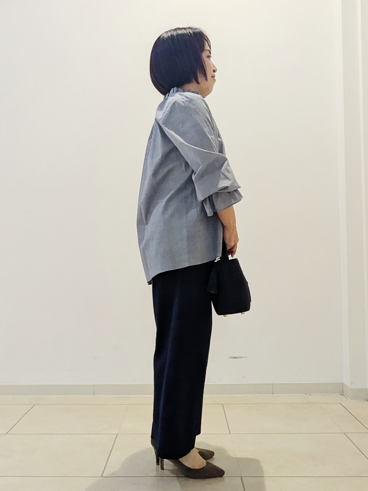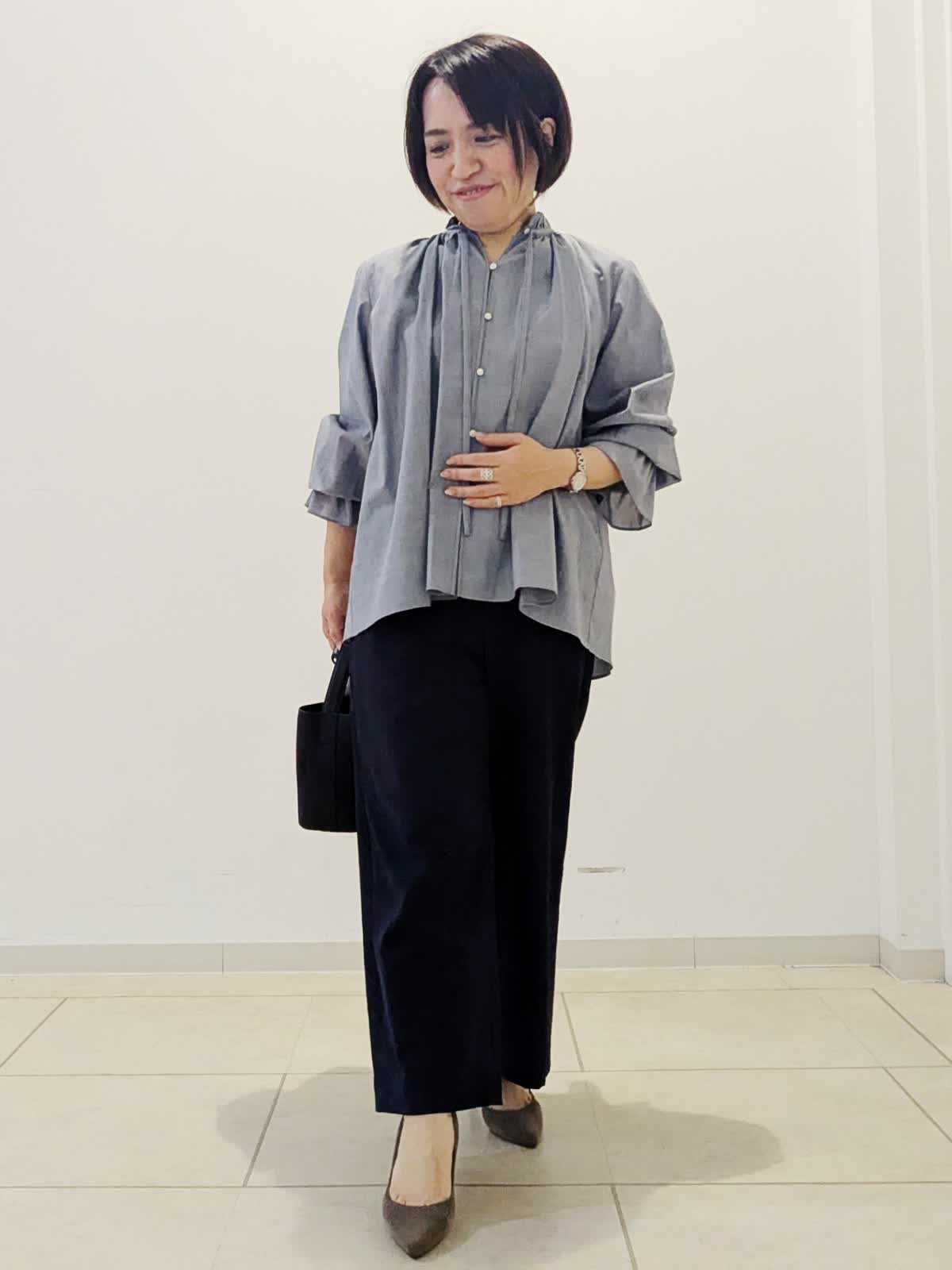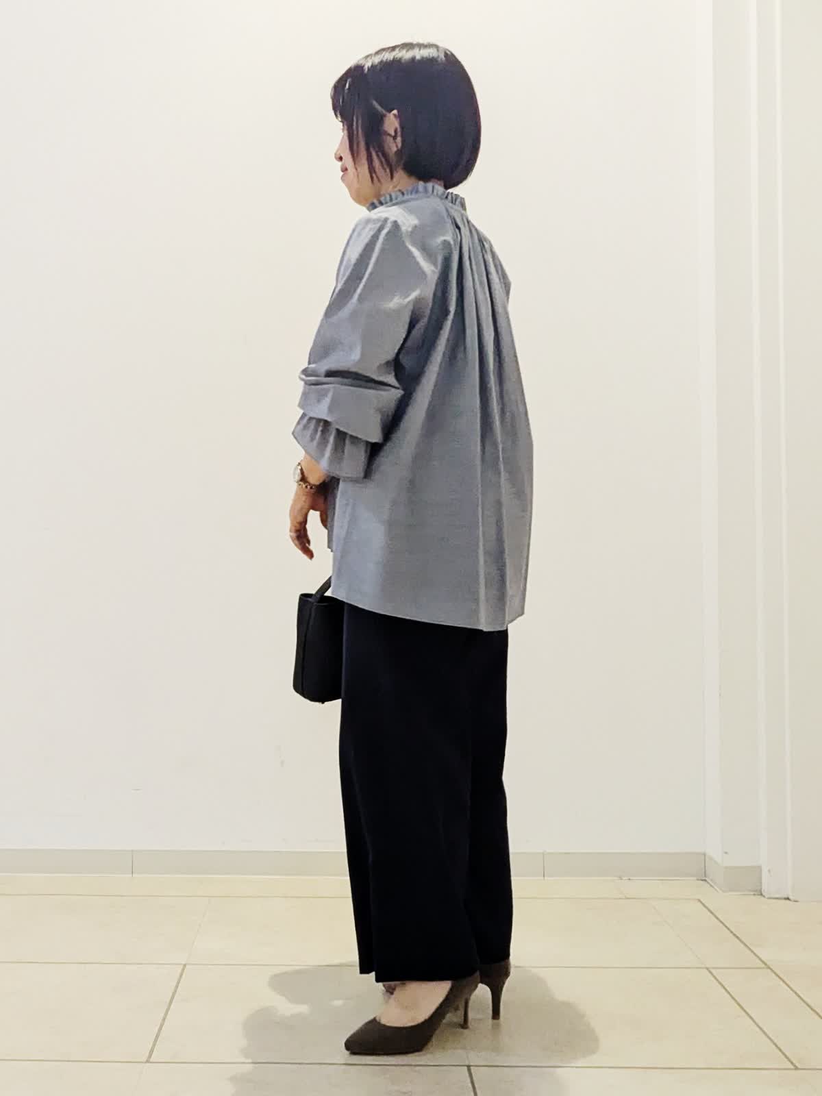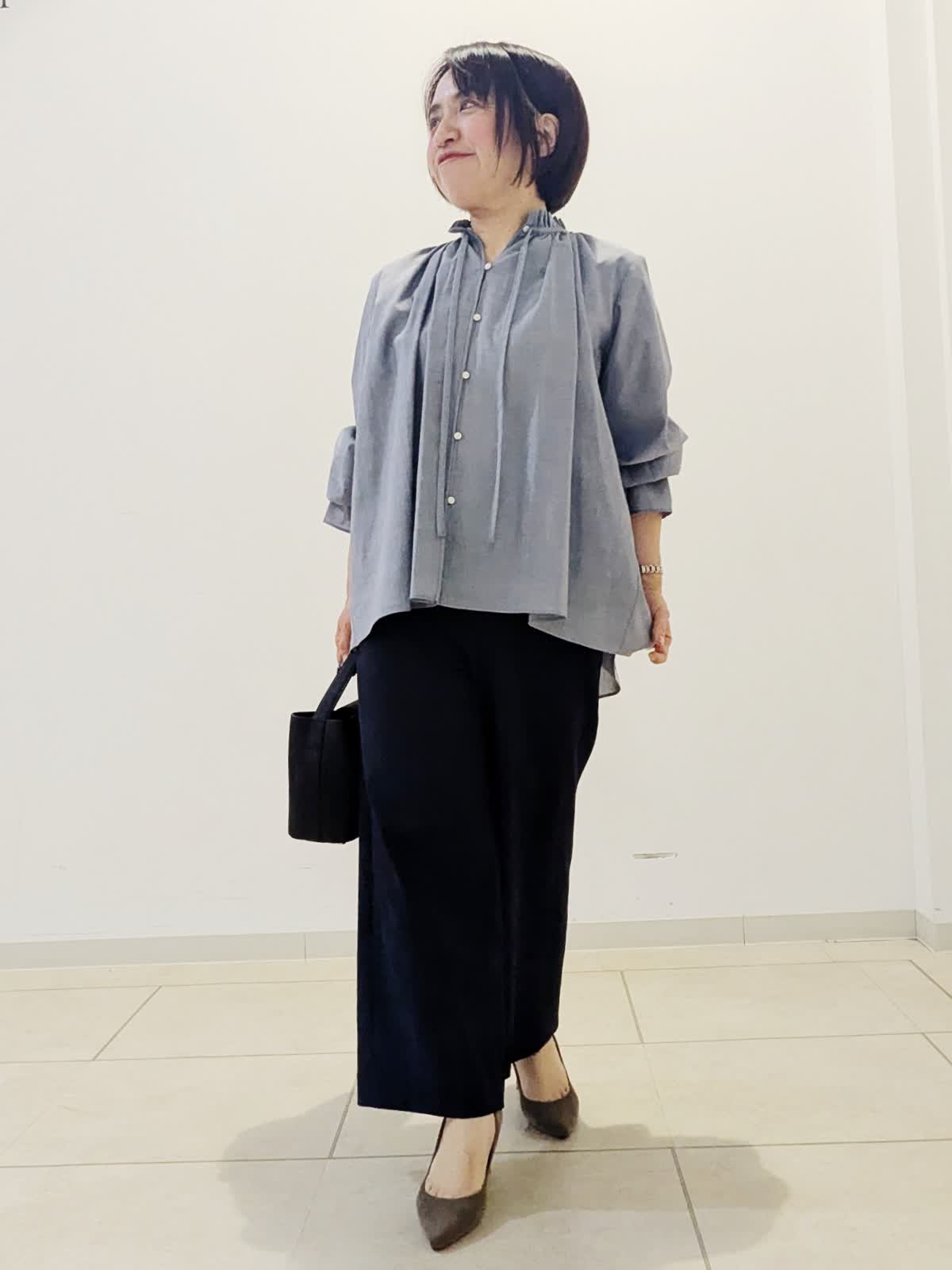 【着用サイズ】ブラウス:フリー パンツ:9号【着用カラー】ブラウス:グレー パンツ:ネイビー 春の通勤コーデです。 ブラウスは襟元フリルとフレアー袖がポイント。1枚で華やかな見え感です。パンツはセミワイドパンツ。私の身長でもお直しなし着用できます◎