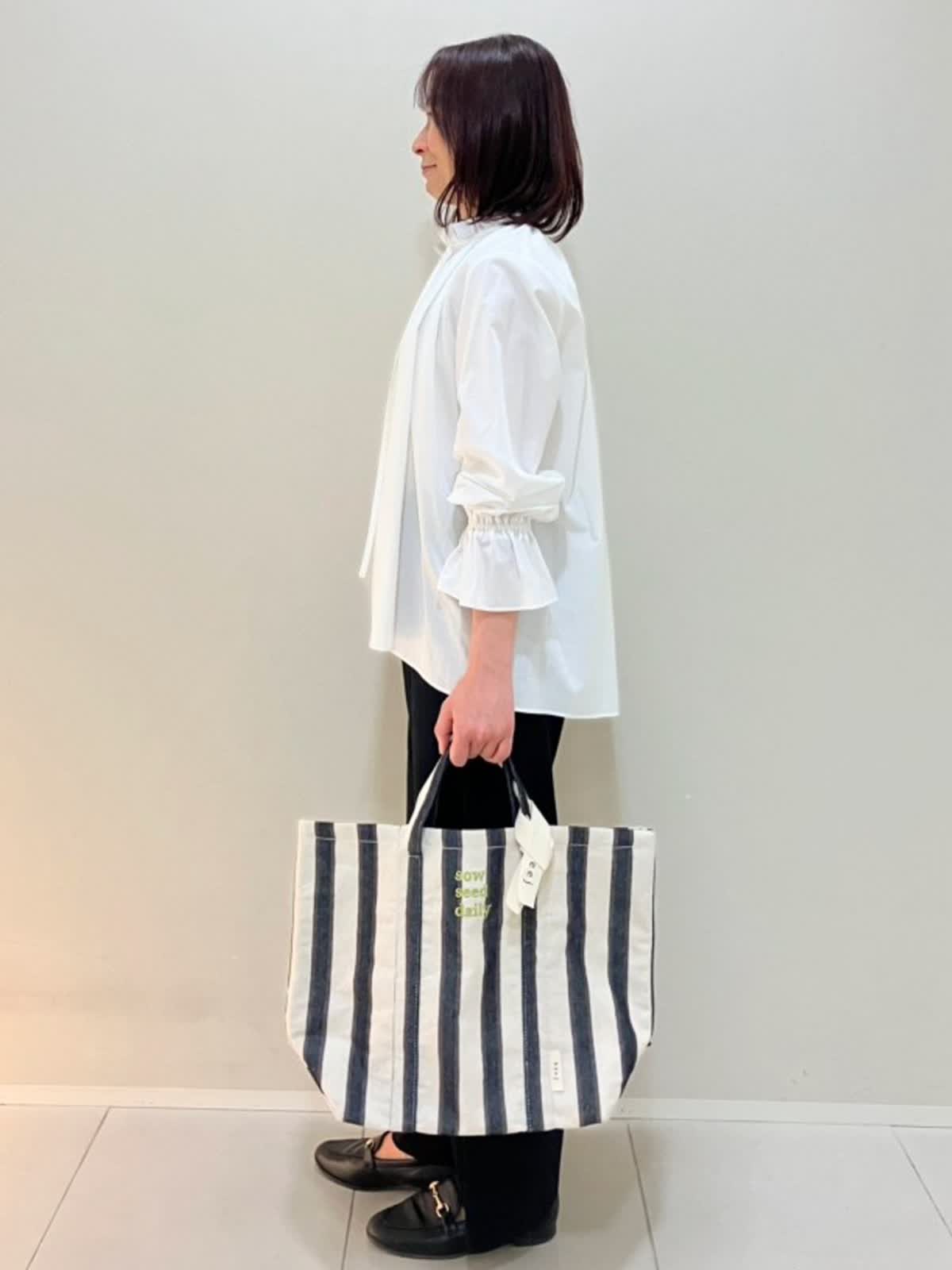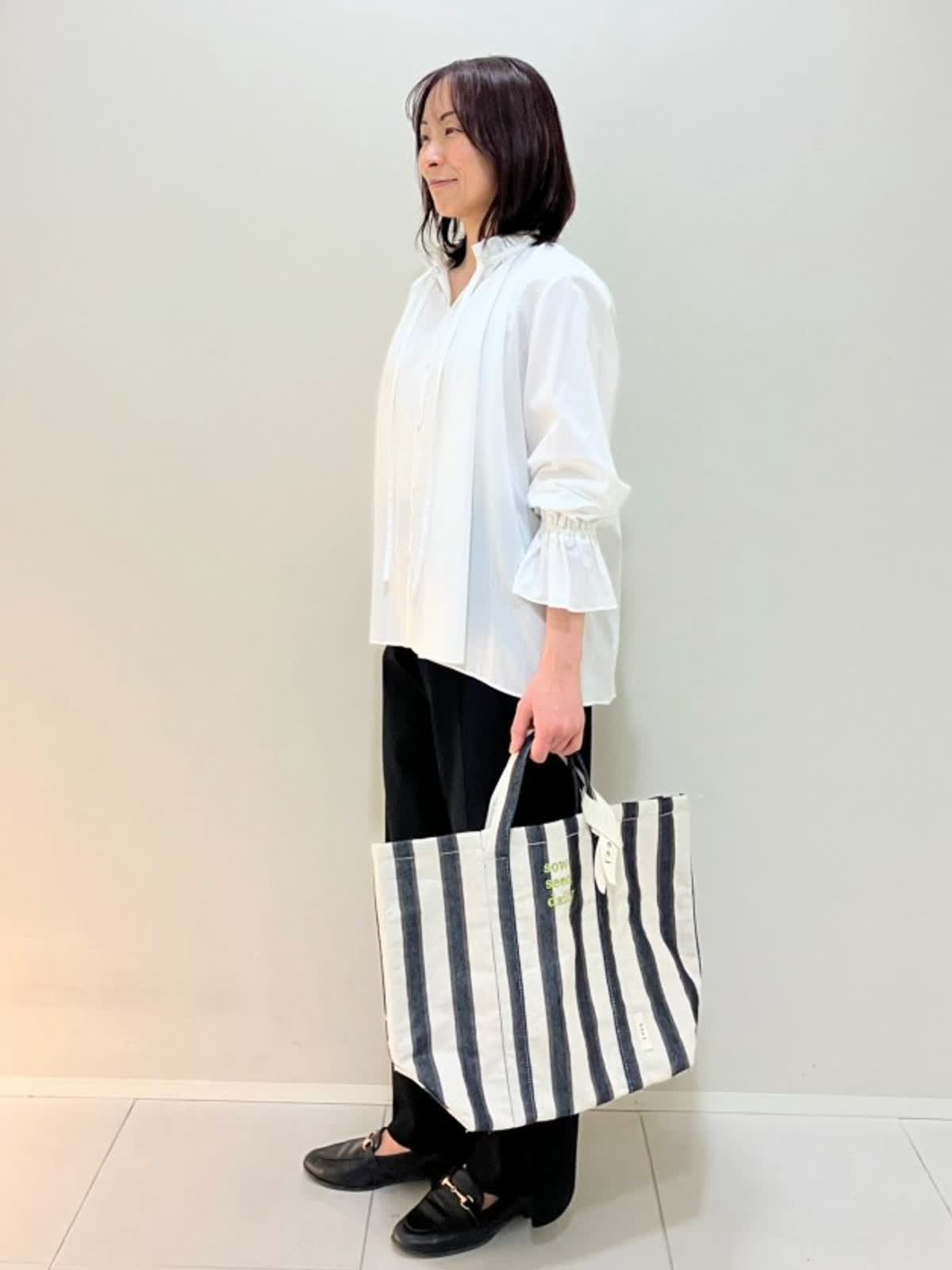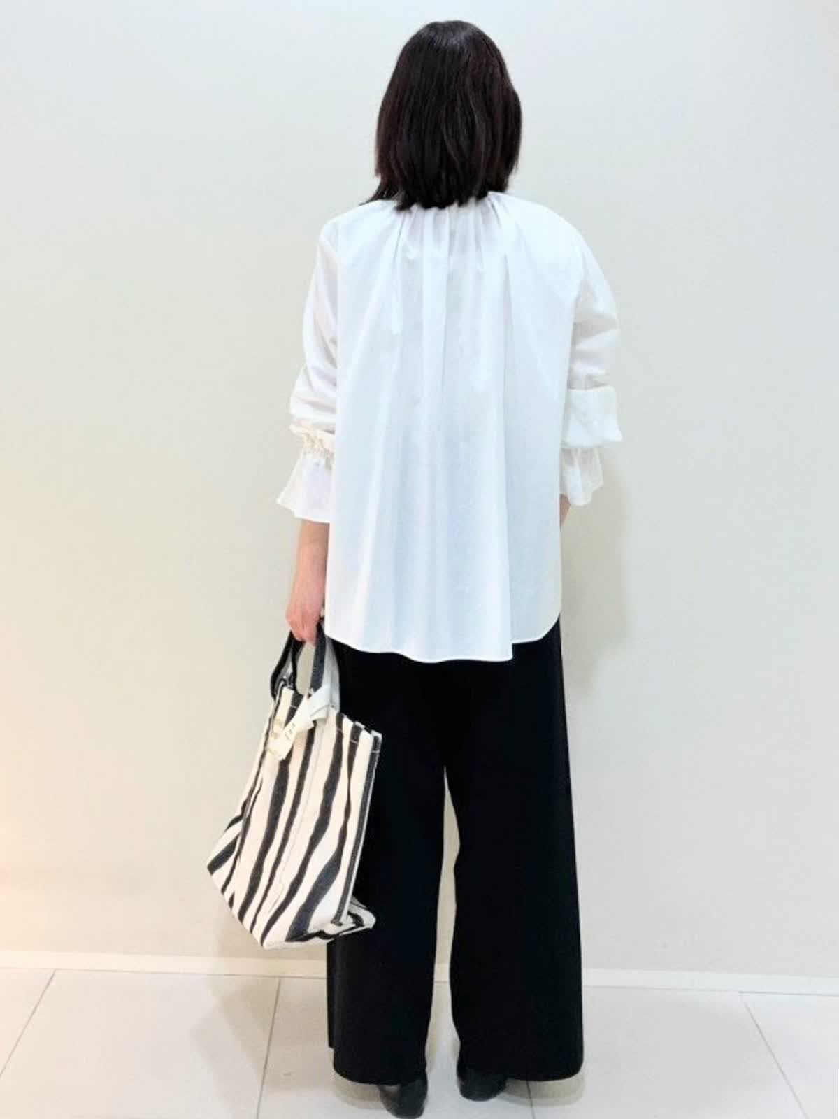 【着用サイズ】ブラウス:フリー パンツ:フリー【着用カラー】 ブラウス:オフホワイト パンツ:ブラック 春のお買い物スタイル 華やかさのあるブラウスは、綿100%で肌に優しくストレスフリー。ニットパンツは、ウエストゴム仕様で楽な履き心地。カジュアルすぎないアイテムなので、ブラウスとも相性が良いです。