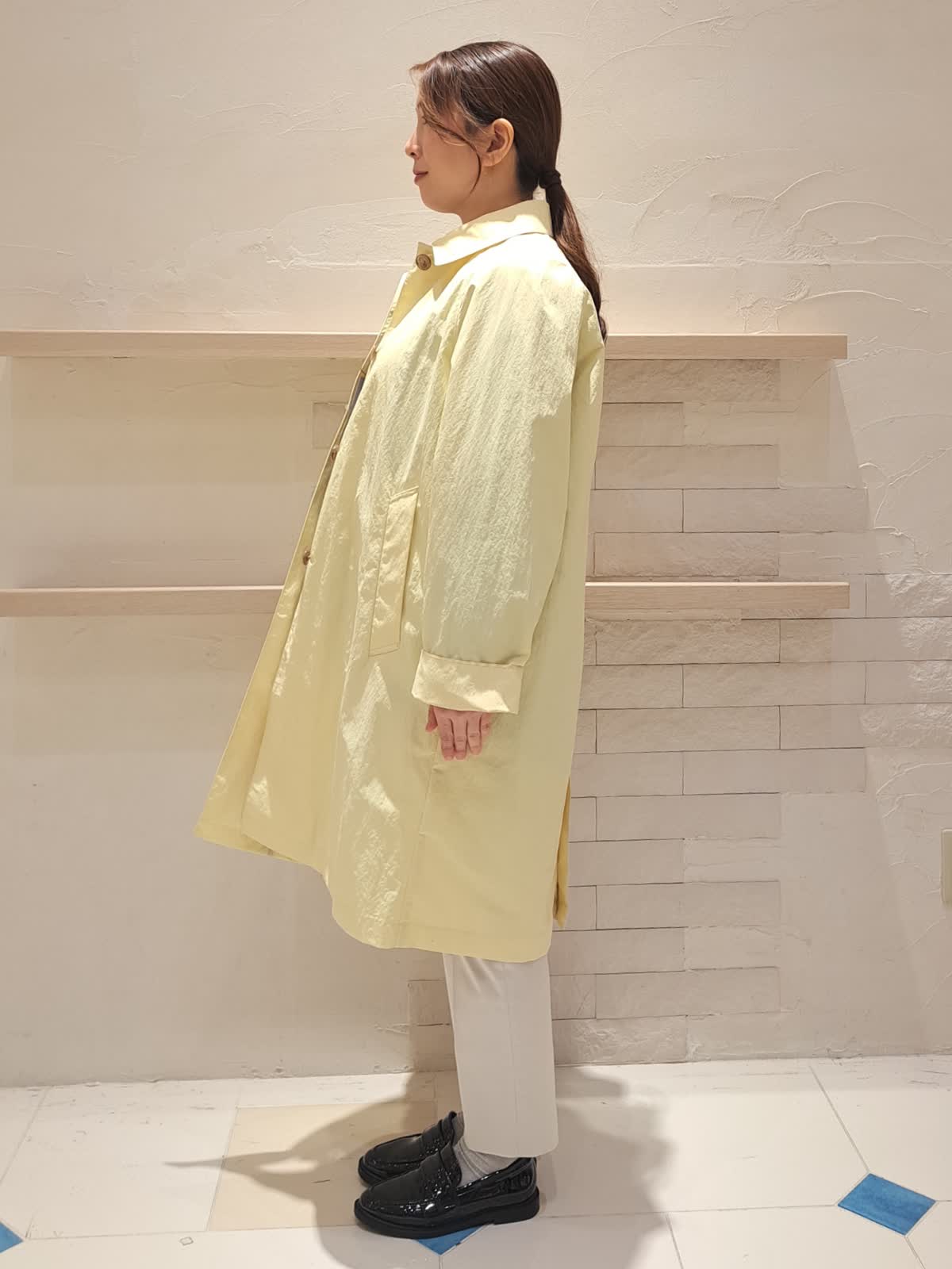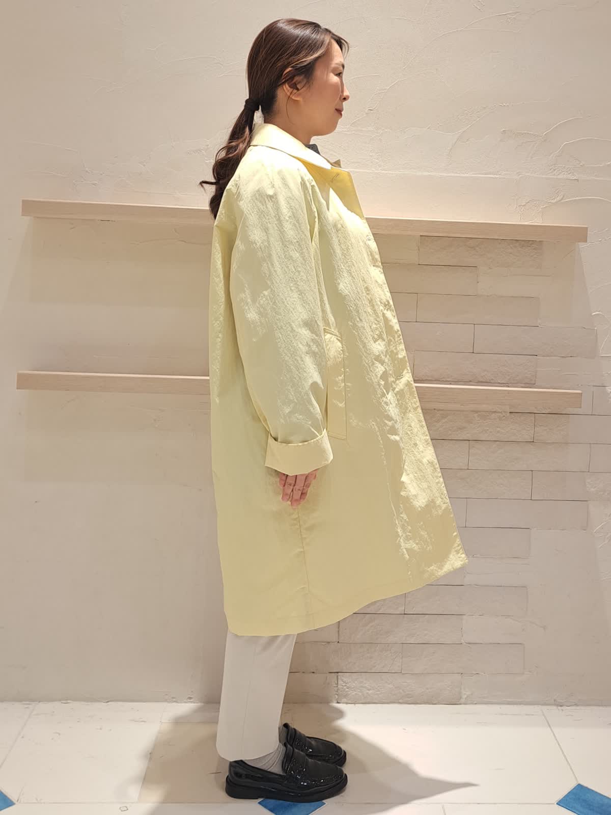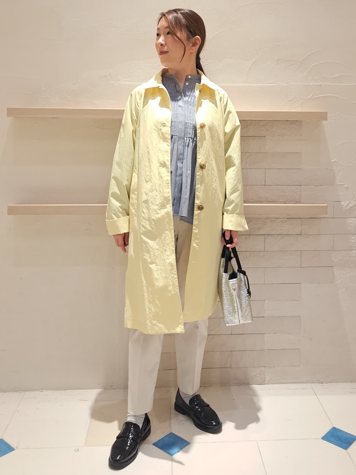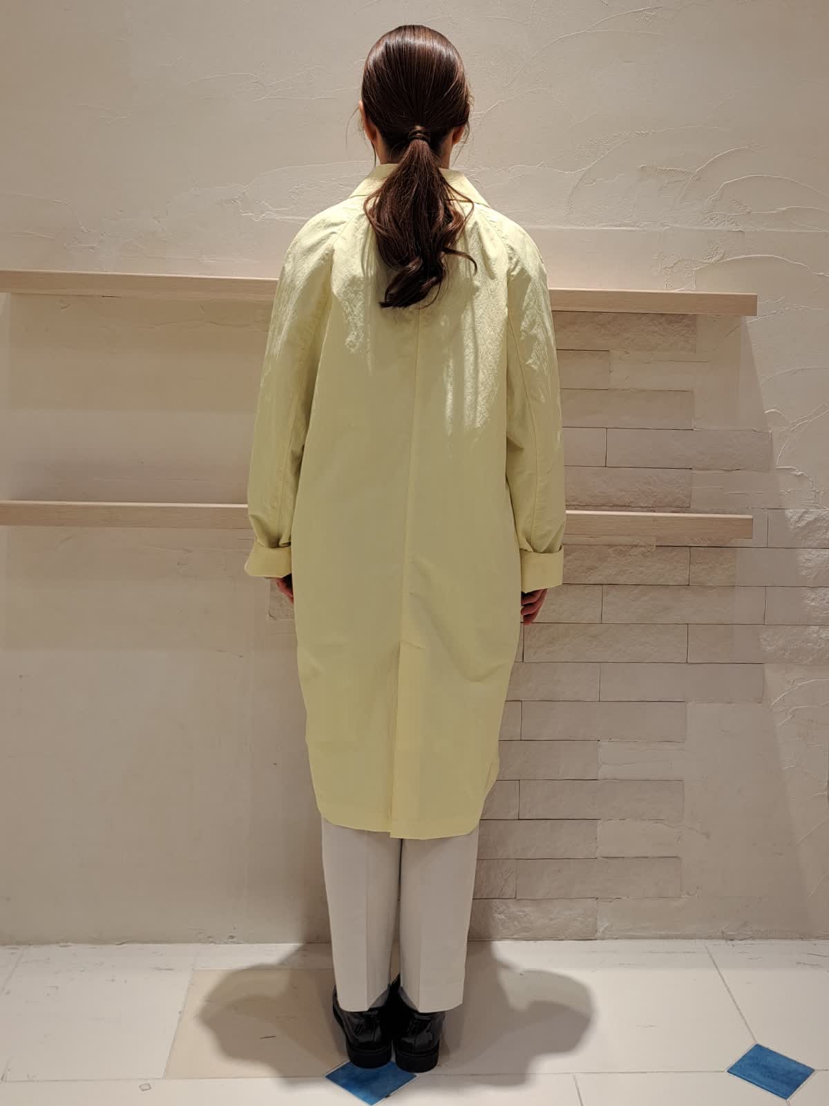 【着用サイズ】コート:9号 ブラウス:フリー パンツ:7号 【着用カラー】コート:イエロー ブラウス:グレー パンツ:ミディアムグレー 華やかカラーのコート。シワを気にせず着れるので、ご旅行やお出掛けにピッタリです。身長155センチですが丈も長すぎず、袖丈も折って着れるので、そのままで着用できます。