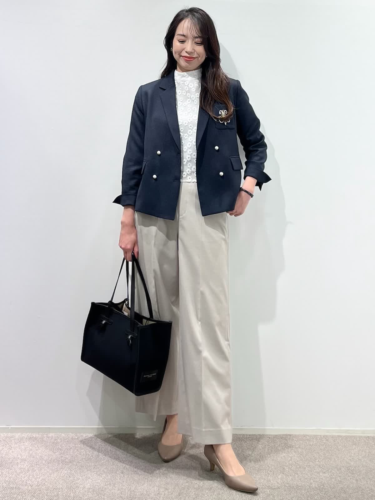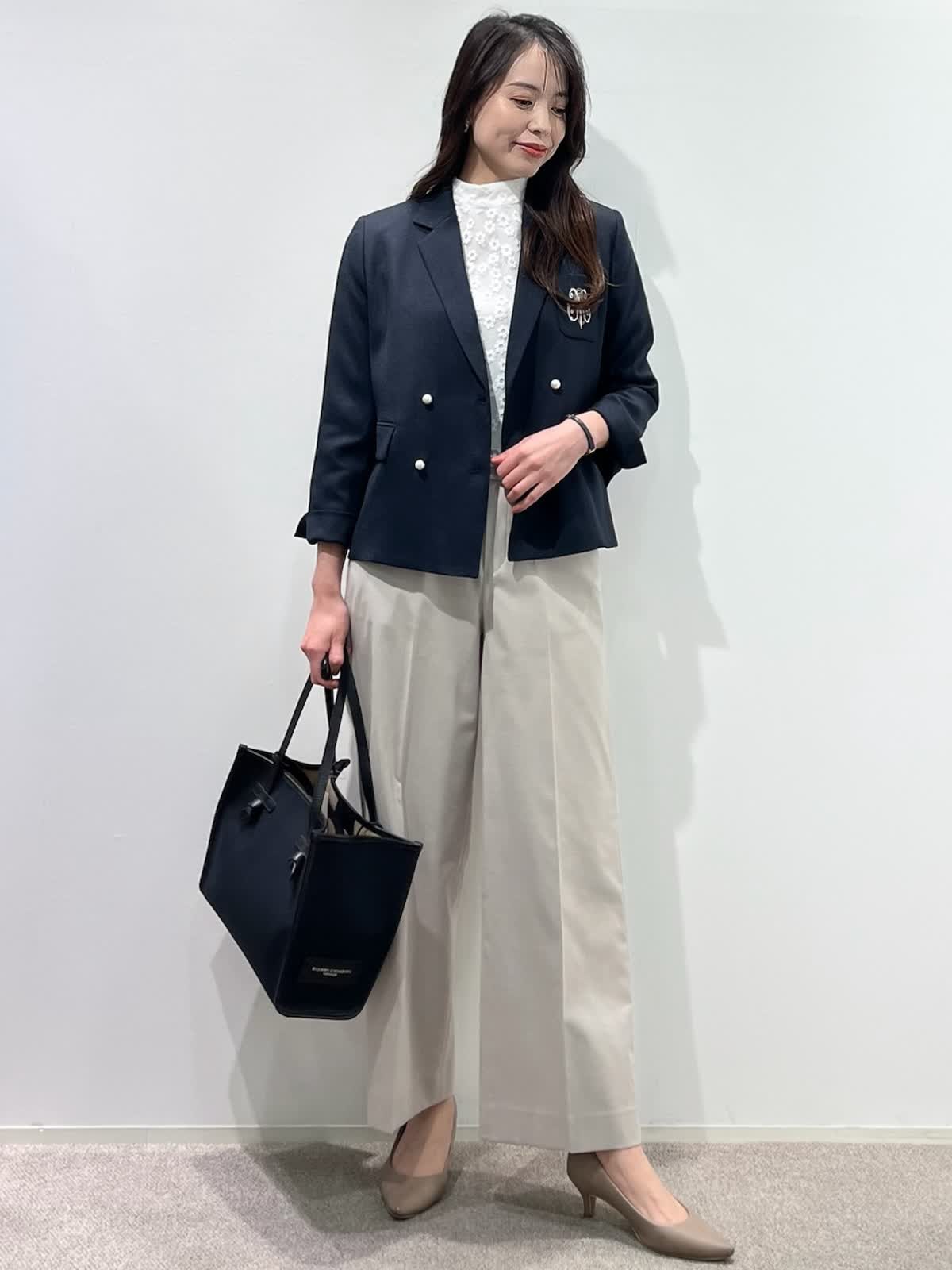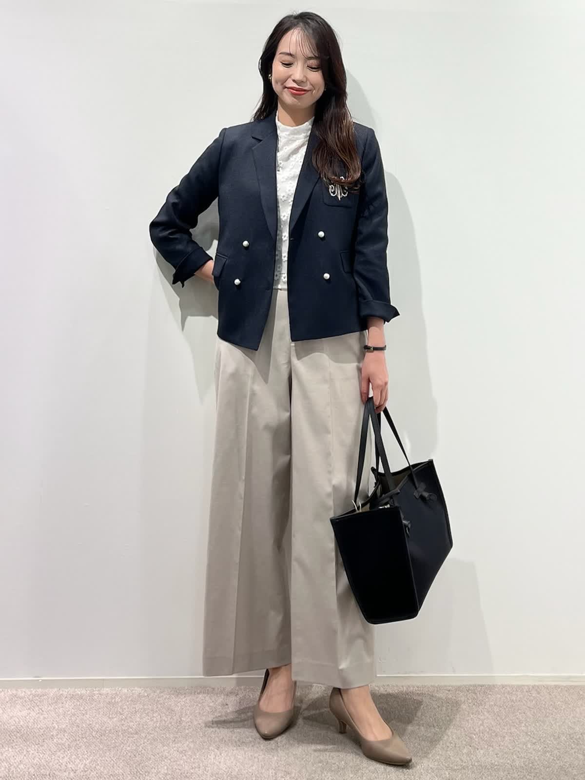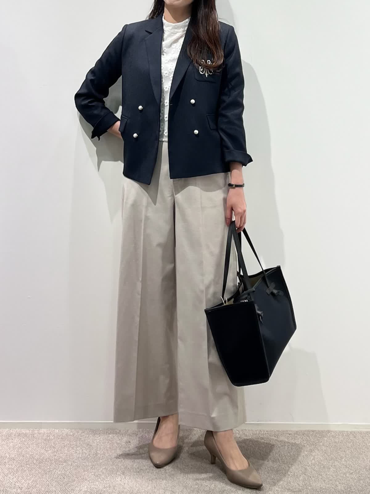 【着用サイズ】ジャケット:9号 ブラウス:9号 パンツ:11号 【着用カラー】ジャケット:ネイビー ブラウス:オフホワイト パンツ:ベージュ 「好印象きちんと見えオフィスコーデ」 羽織るだけでシャープな印象のネイビージャケット。パールボタンが華やかで、胸元のロゴがポイント。素材感は、麻調でシャリ感があり、さらりと軽く羽織れるので、春の寒暖差にも対応出来ます。インナーは、フラワー刺繍のオーガンジーブラウス。着映えするデザインなので、あたたかい日は一枚で着用しても華やかな印象。美脚シルエットのセミワイドパンツと合わせたお仕事にもおすすめな好印象コーデです。