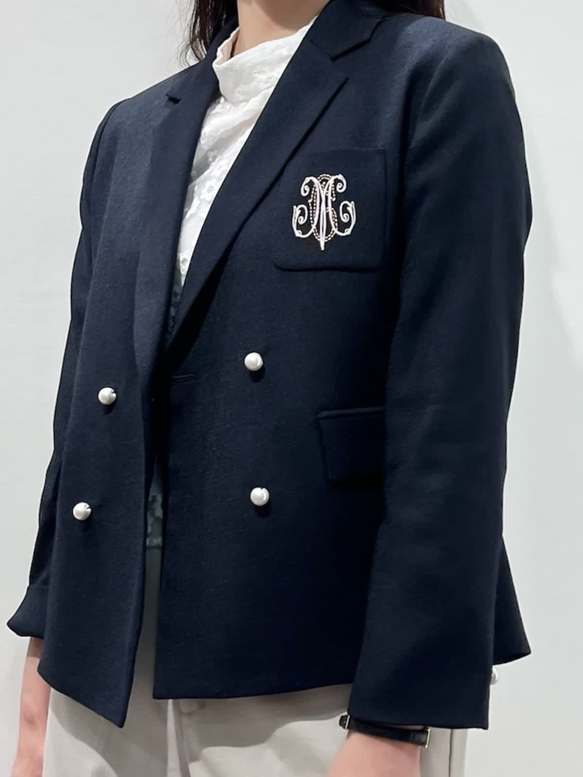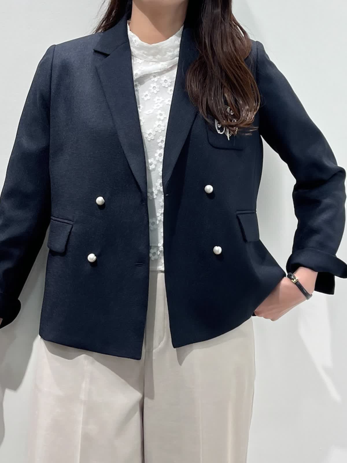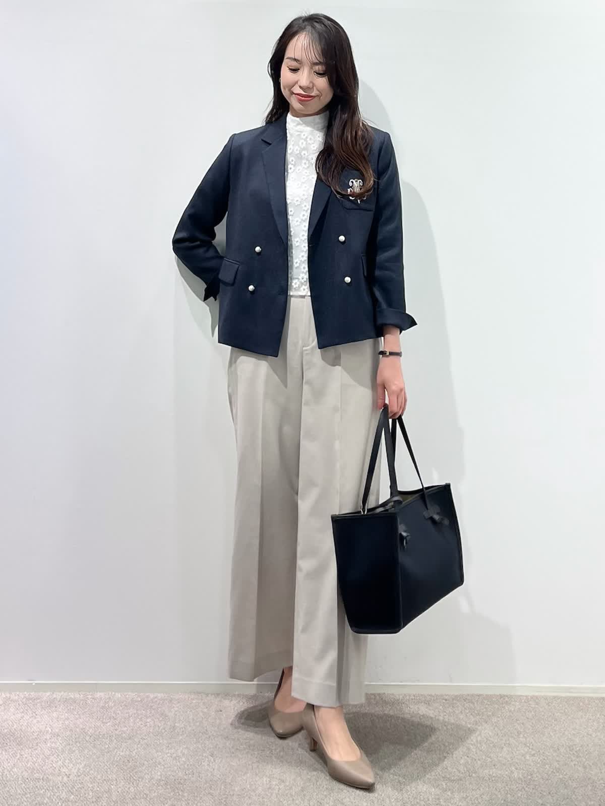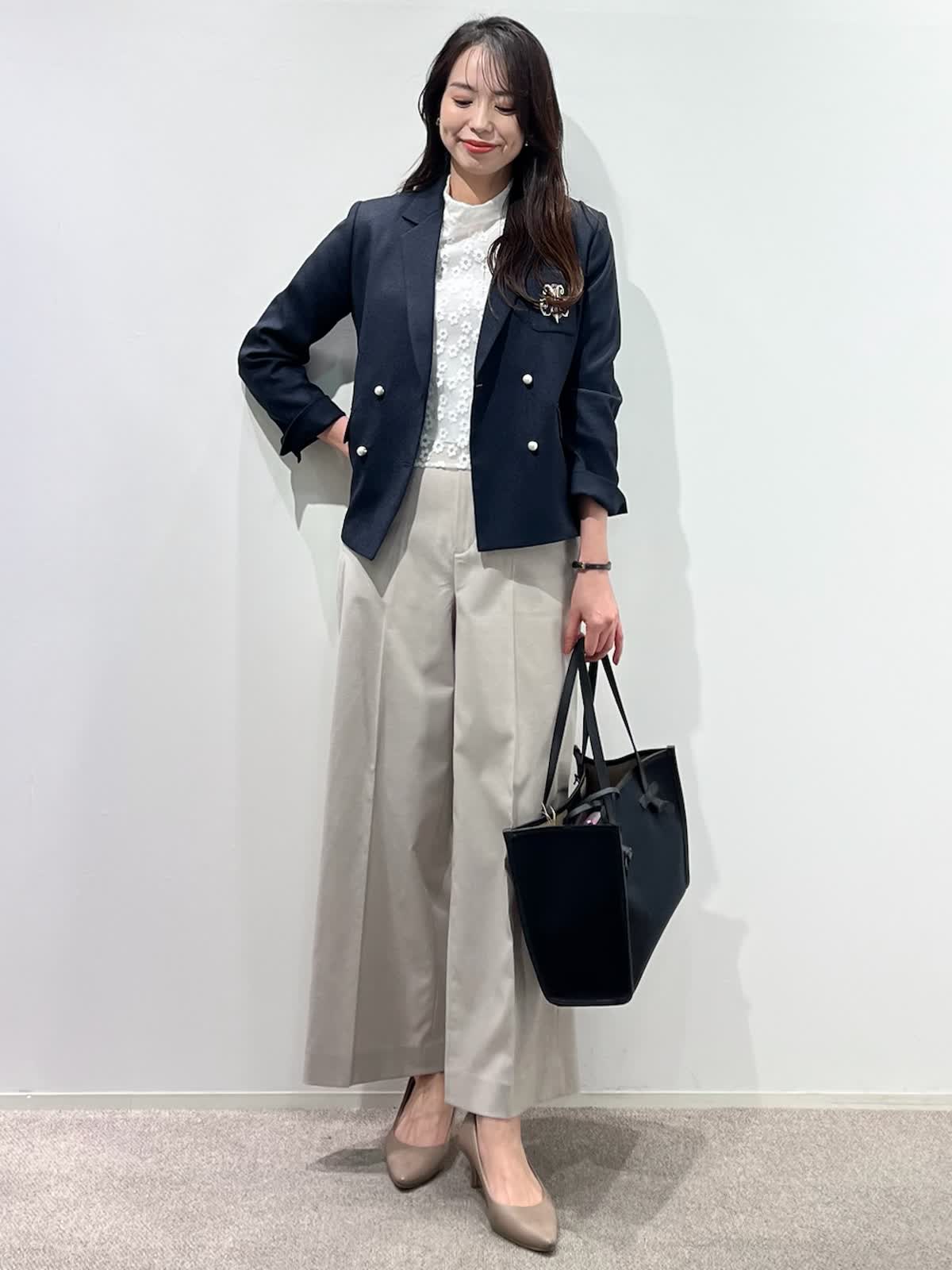 【着用サイズ】ジャケット:9号 ブラウス:9号 パンツ:11号 【着用カラー】ジャケット:ネイビー ブラウス:オフホワイト パンツ:ベージュ 「好印象きちんと見えオフィスコーデ」 羽織るだけでシャープな印象のネイビージャケット。パールボタンが華やかで、胸元のロゴがポイント。素材感は、麻調でシャリ感があり、さらりと軽く羽織れるので、春の寒暖差にも対応出来ます。インナーは、フラワー刺繍のオーガンジーブラウス。着映えするデザインなので、あたたかい日は一枚で着用しても華やかな印象。美脚シルエットのセミワイドパンツと合わせたお仕事にもおすすめな好印象コーデです。