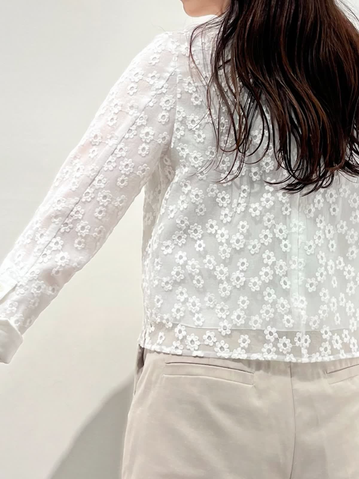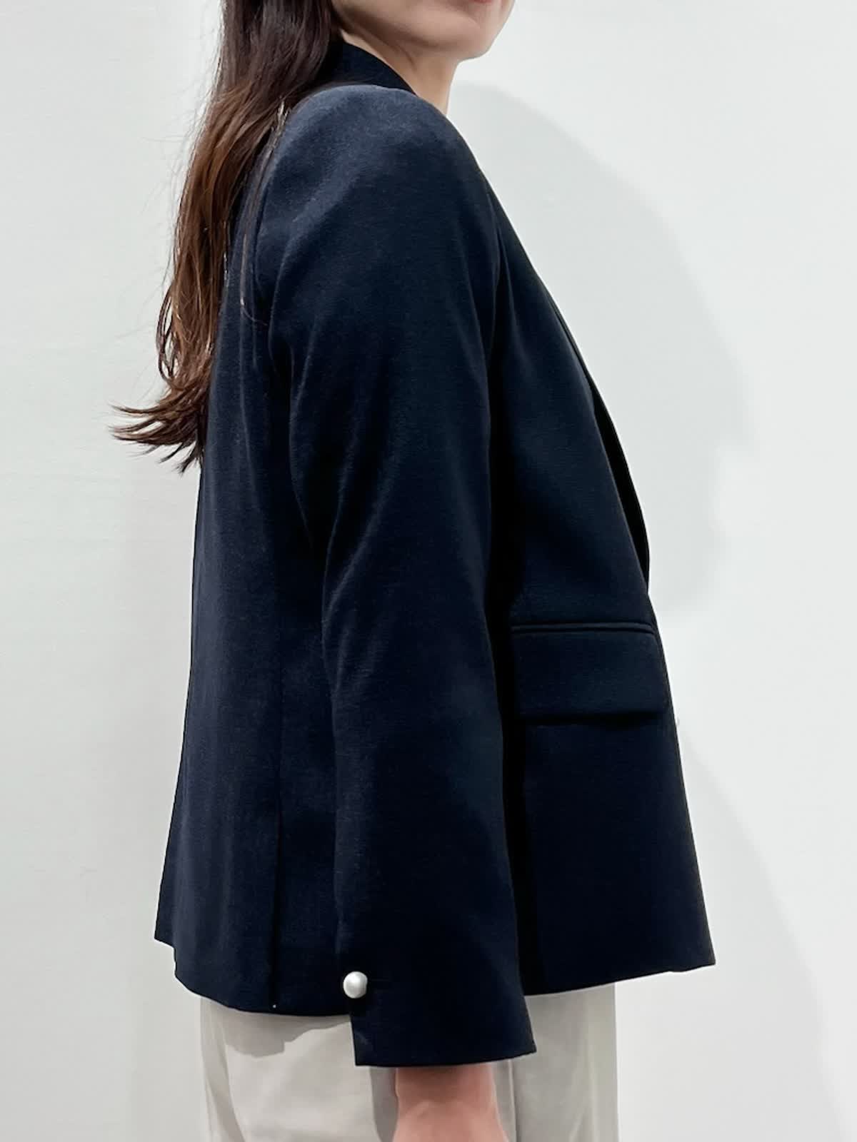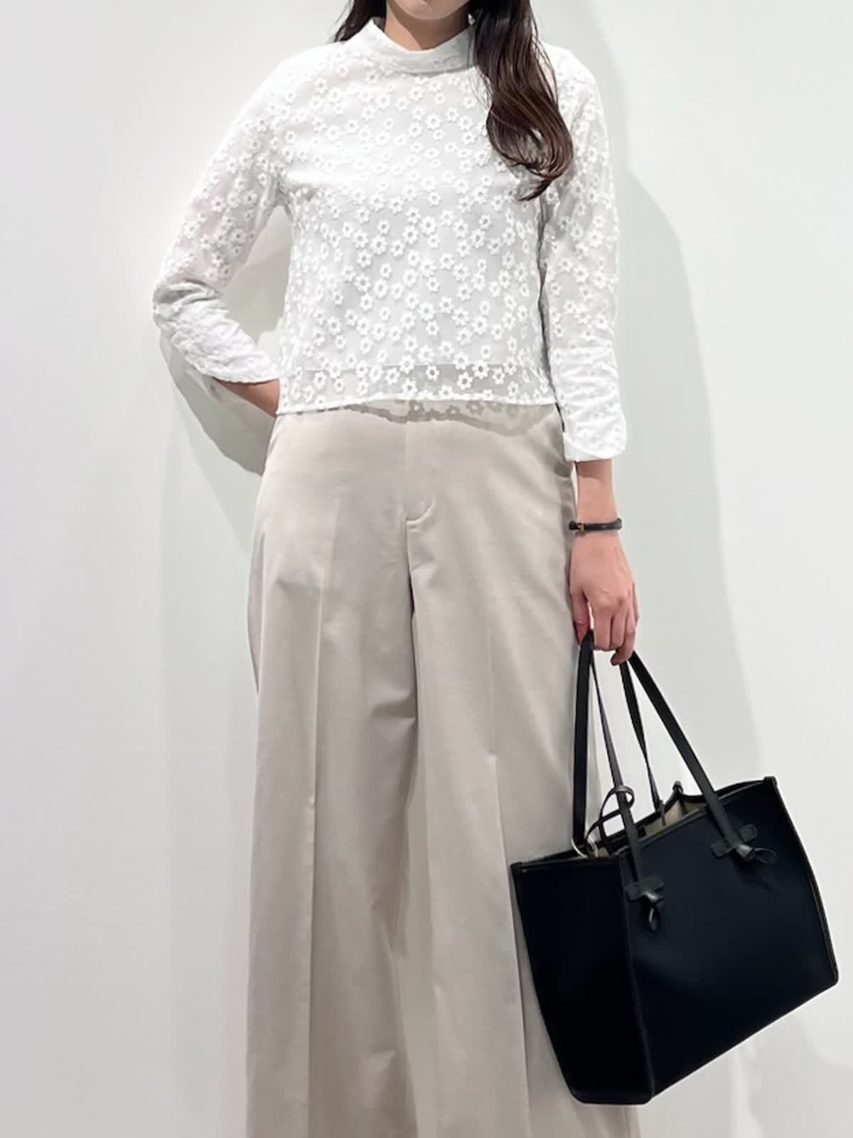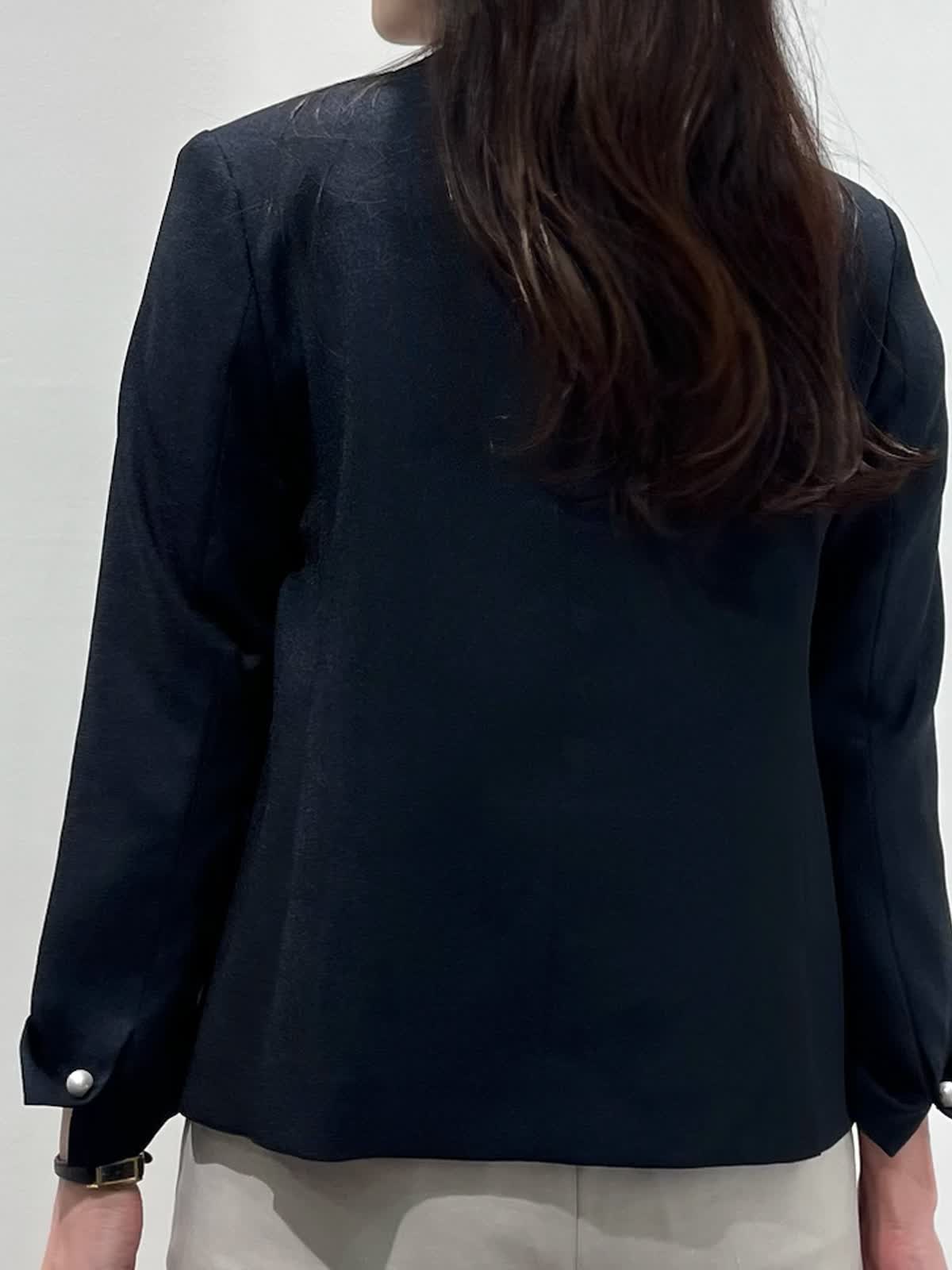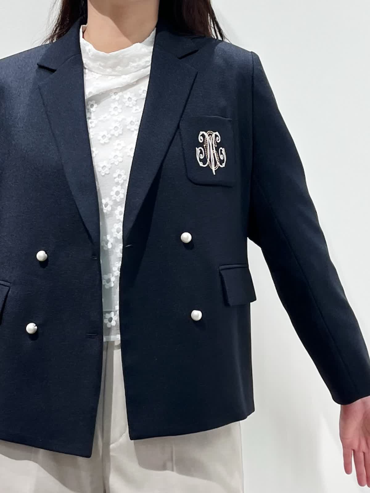 【着用サイズ】ジャケット:9号 ブラウス:9号 パンツ:11号 【着用カラー】ジャケット:ネイビー ブラウス:オフホワイト パンツ:ベージュ 「好印象きちんと見えオフィスコーデ」 羽織るだけでシャープな印象のネイビージャケット。パールボタンが華やかで、胸元のロゴがポイント。素材感は、麻調でシャリ感があり、さらりと軽く羽織れるので、春の寒暖差にも対応出来ます。インナーは、フラワー刺繍のオーガンジーブラウス。着映えするデザインなので、あたたかい日は一枚で着用しても華やかな印象。美脚シルエットのセミワイドパンツと合わせたお仕事にもおすすめな好印象コーデです。