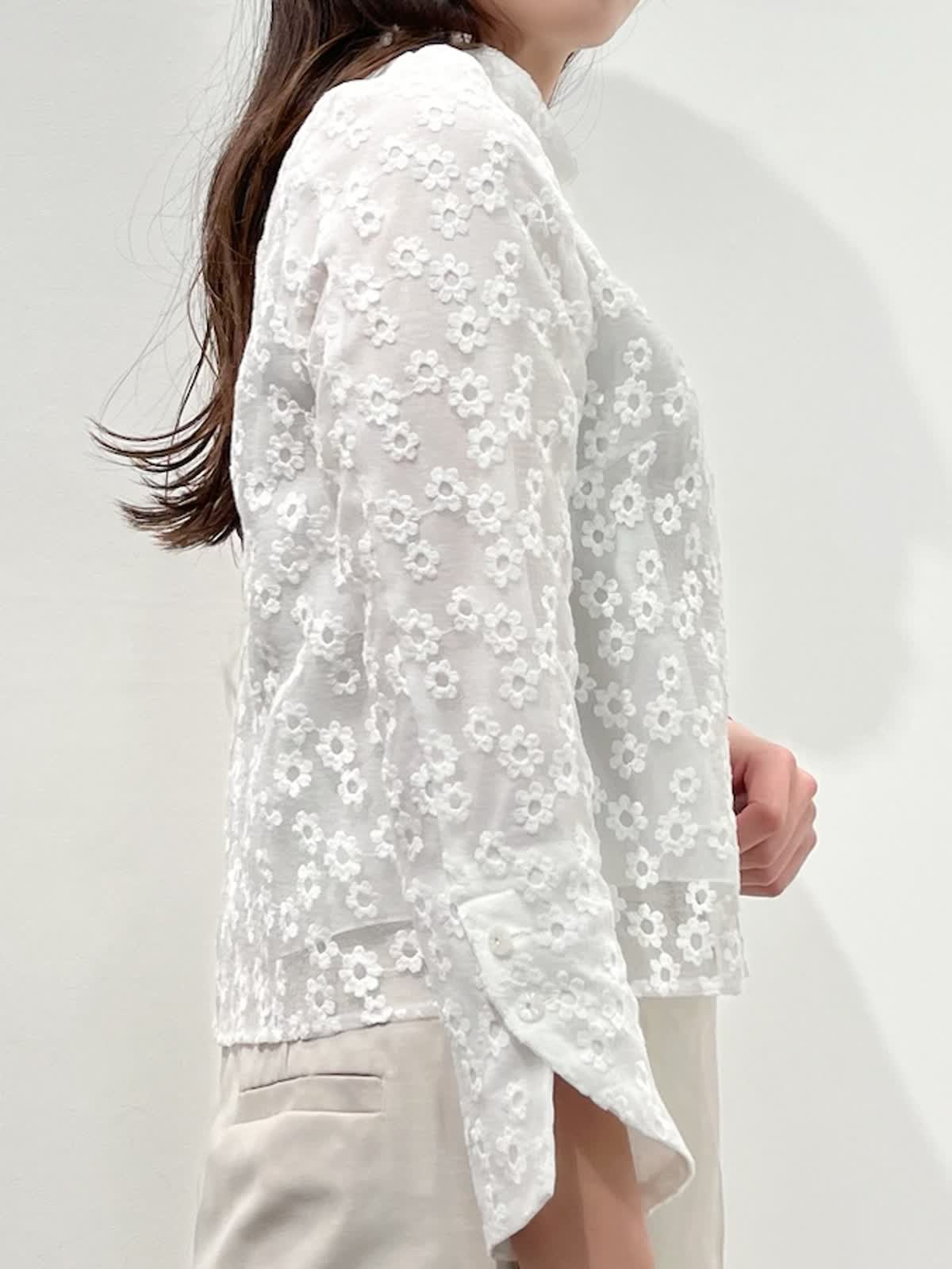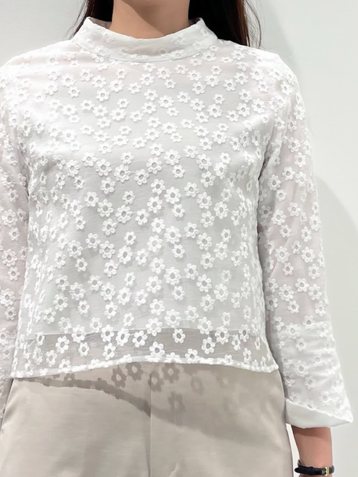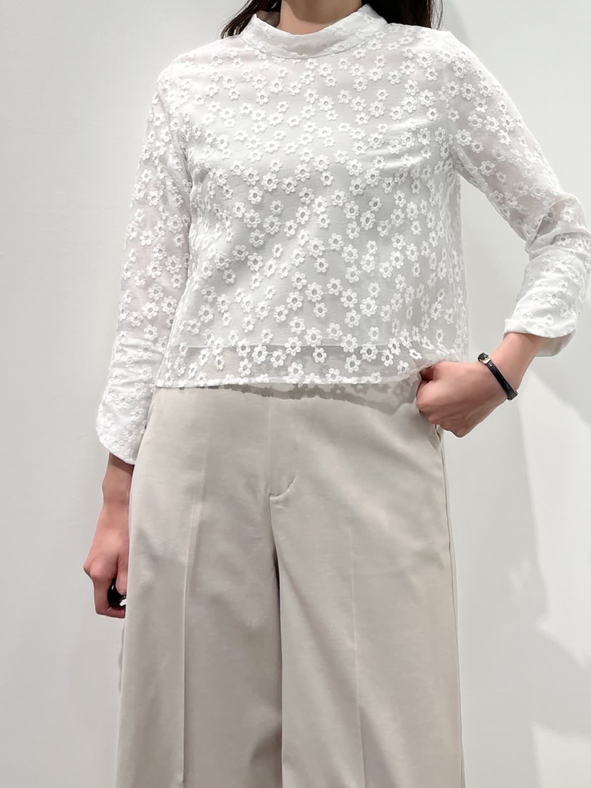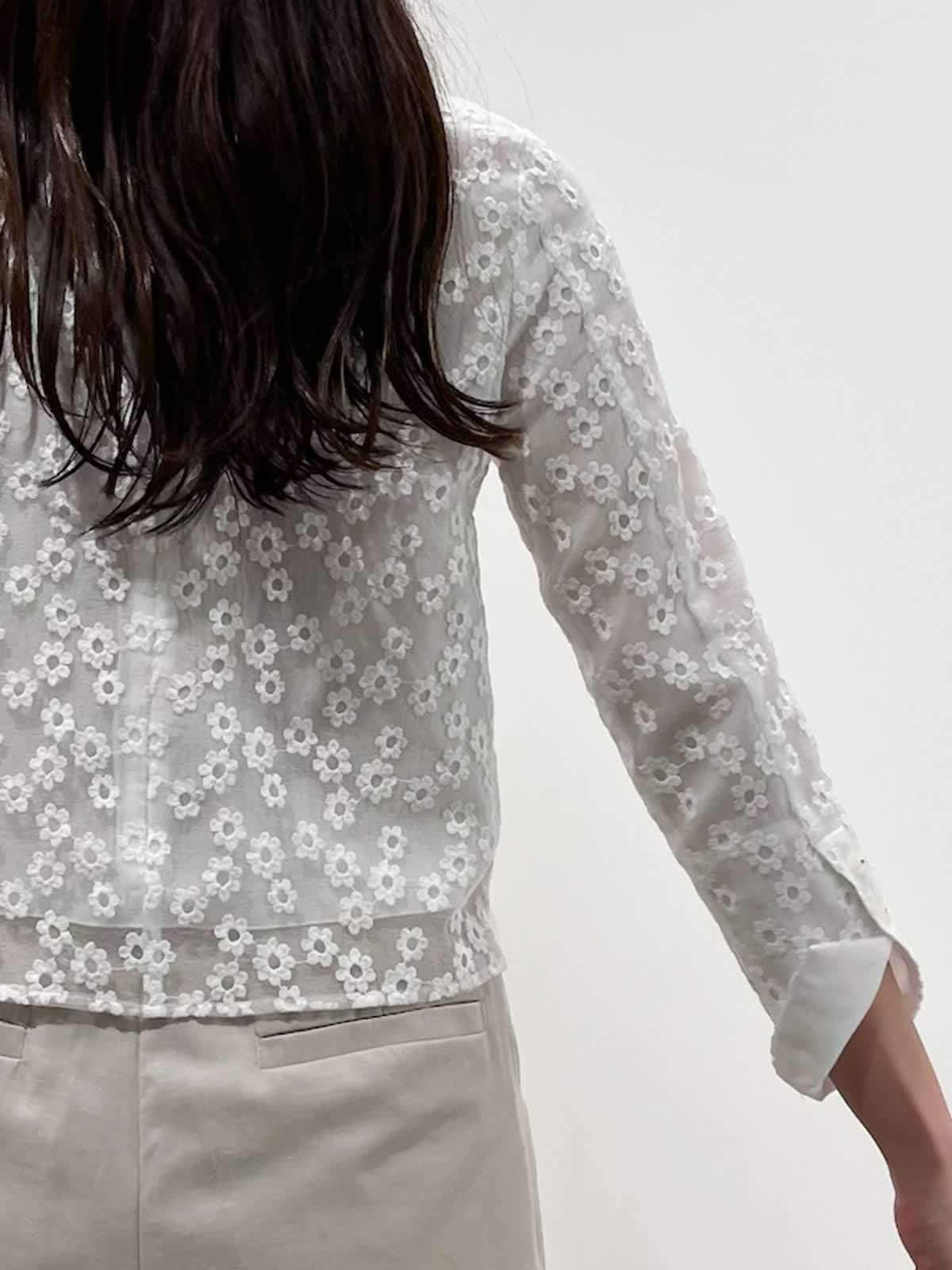 【着用サイズ】ジャケット:9号 ブラウス:9号 パンツ:11号 【着用カラー】ジャケット:ネイビー ブラウス:オフホワイト パンツ:ベージュ 「好印象きちんと見えオフィスコーデ」 羽織るだけでシャープな印象のネイビージャケット。パールボタンが華やかで、胸元のロゴがポイント。素材感は、麻調でシャリ感があり、さらりと軽く羽織れるので、春の寒暖差にも対応出来ます。インナーは、フラワー刺繍のオーガンジーブラウス。着映えするデザインなので、あたたかい日は一枚で着用しても華やかな印象。美脚シルエットのセミワイドパンツと合わせたお仕事にもおすすめな好印象コーデです。