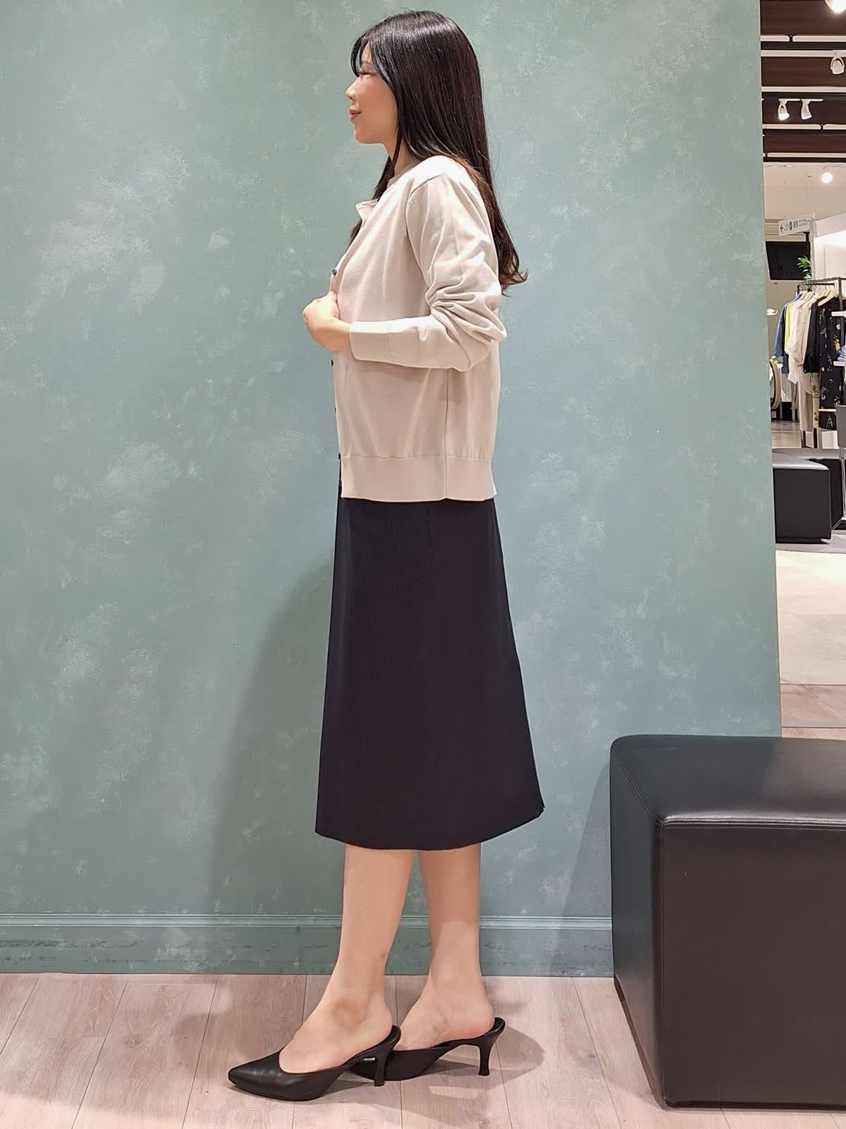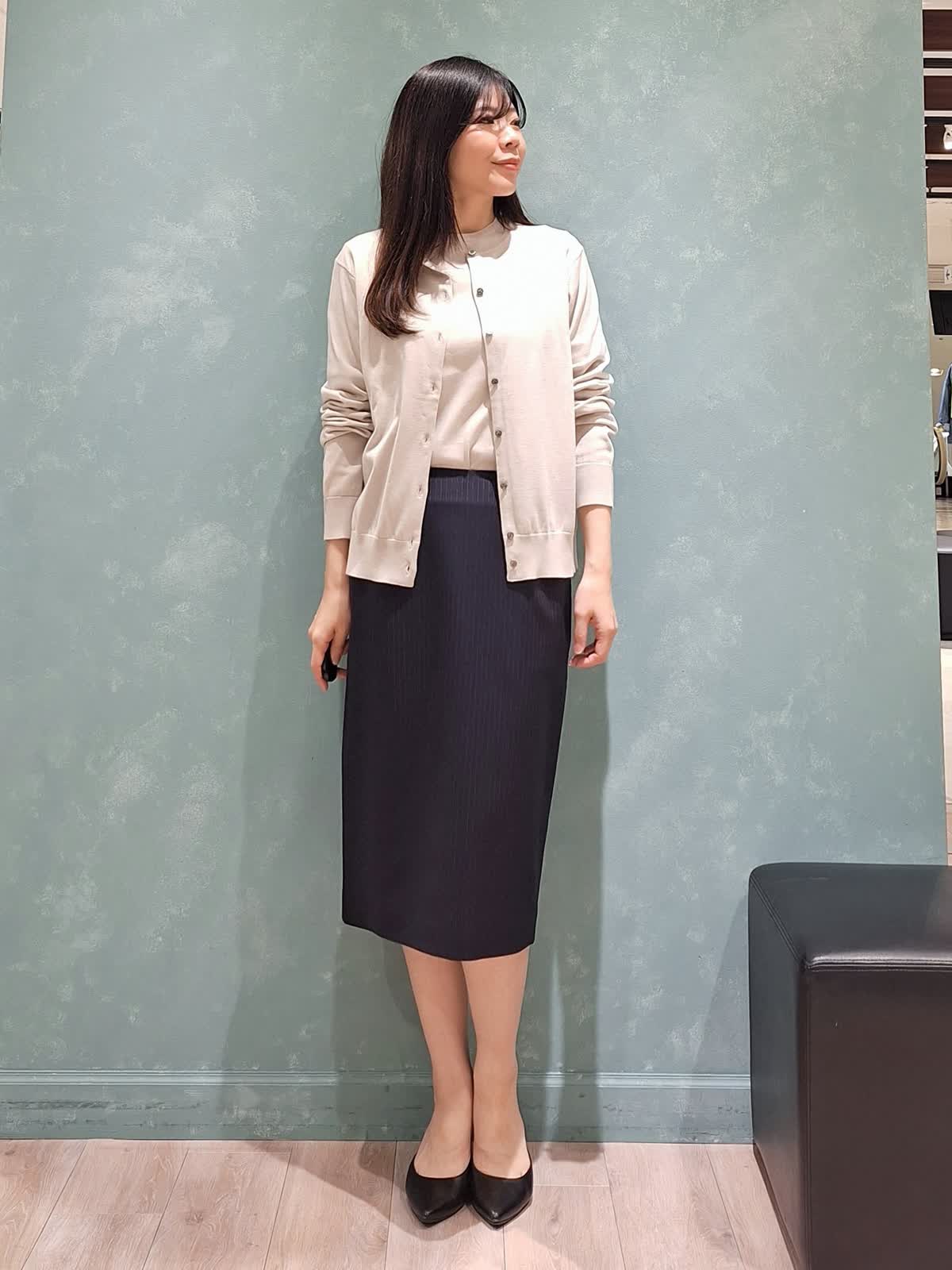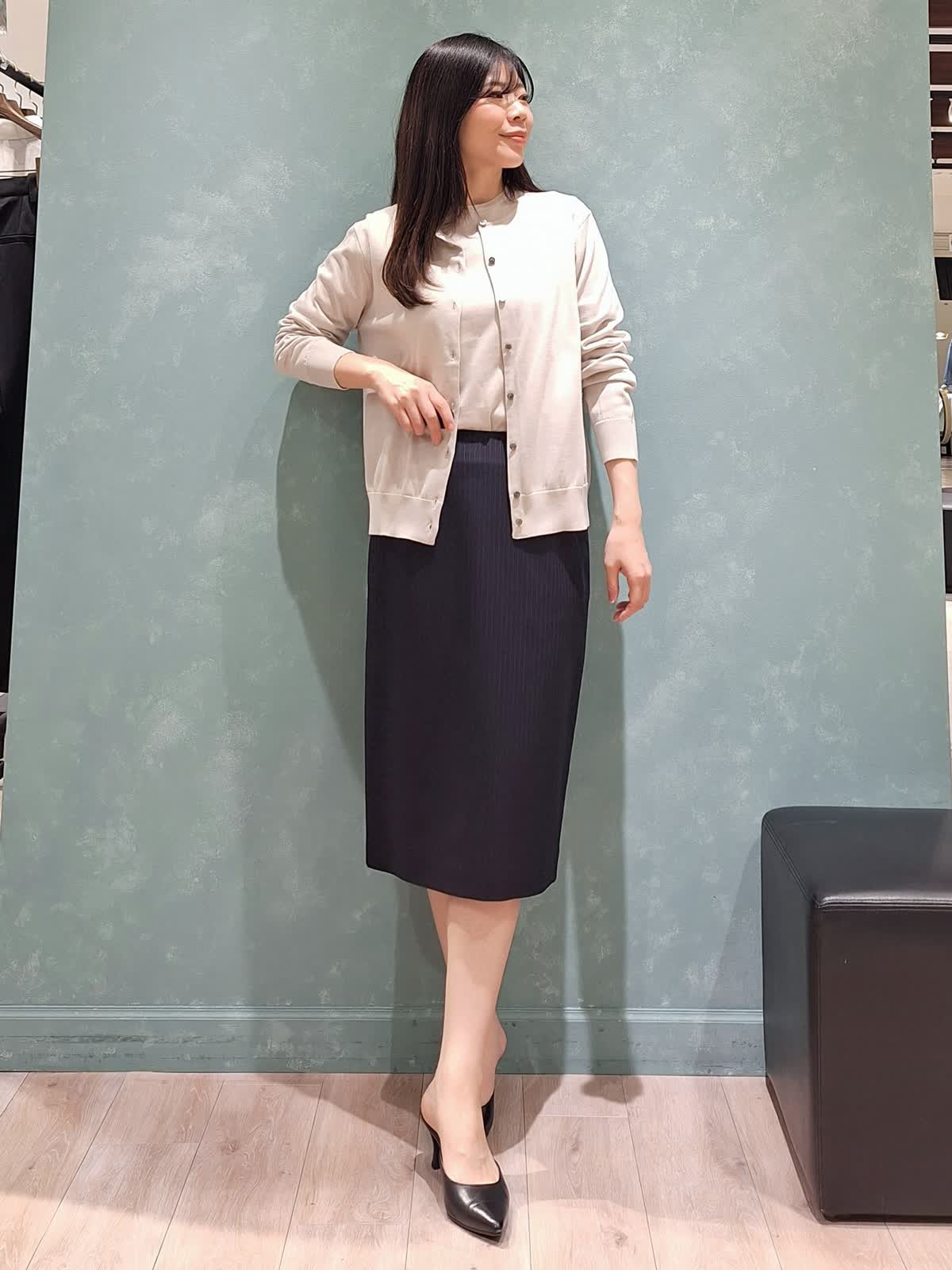 【着用サイズ、カラー】カーディガン、プルオーバー:9号、グレーベージュ スカート、ジャケット:7号、ネイビー 《オフィスSTYLE》秋冬大人気だったFF30ゲージニット、春夏は綿素材で登場!肌触りが抜群で至福の着心地です。カーディガンはなんにでも合わせやすいベーシックなデザイン。プルオーバーは五分袖でカーディガン無しでも安心です。どちらもゆったり着ていただけるサイズ感です。ボトムはシルクウールスーツのタイトスカート。ストライプ柄で軽やかさがあります。