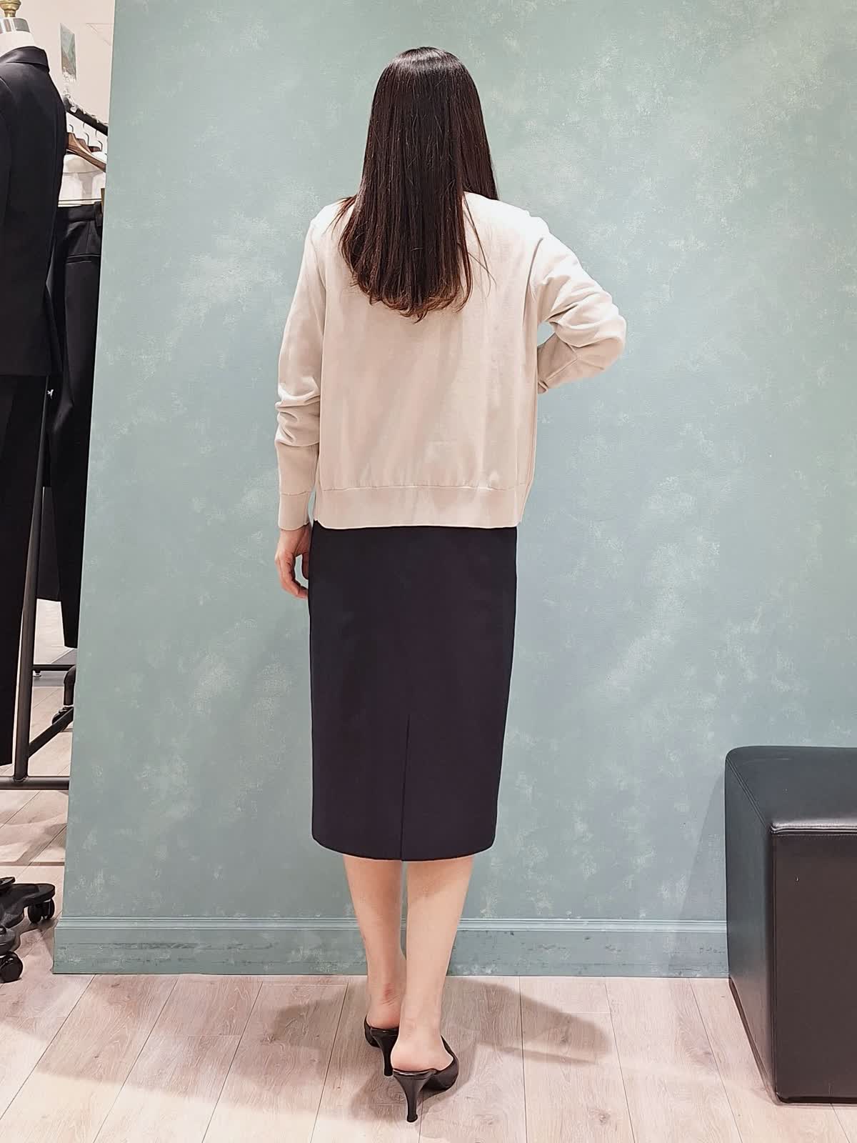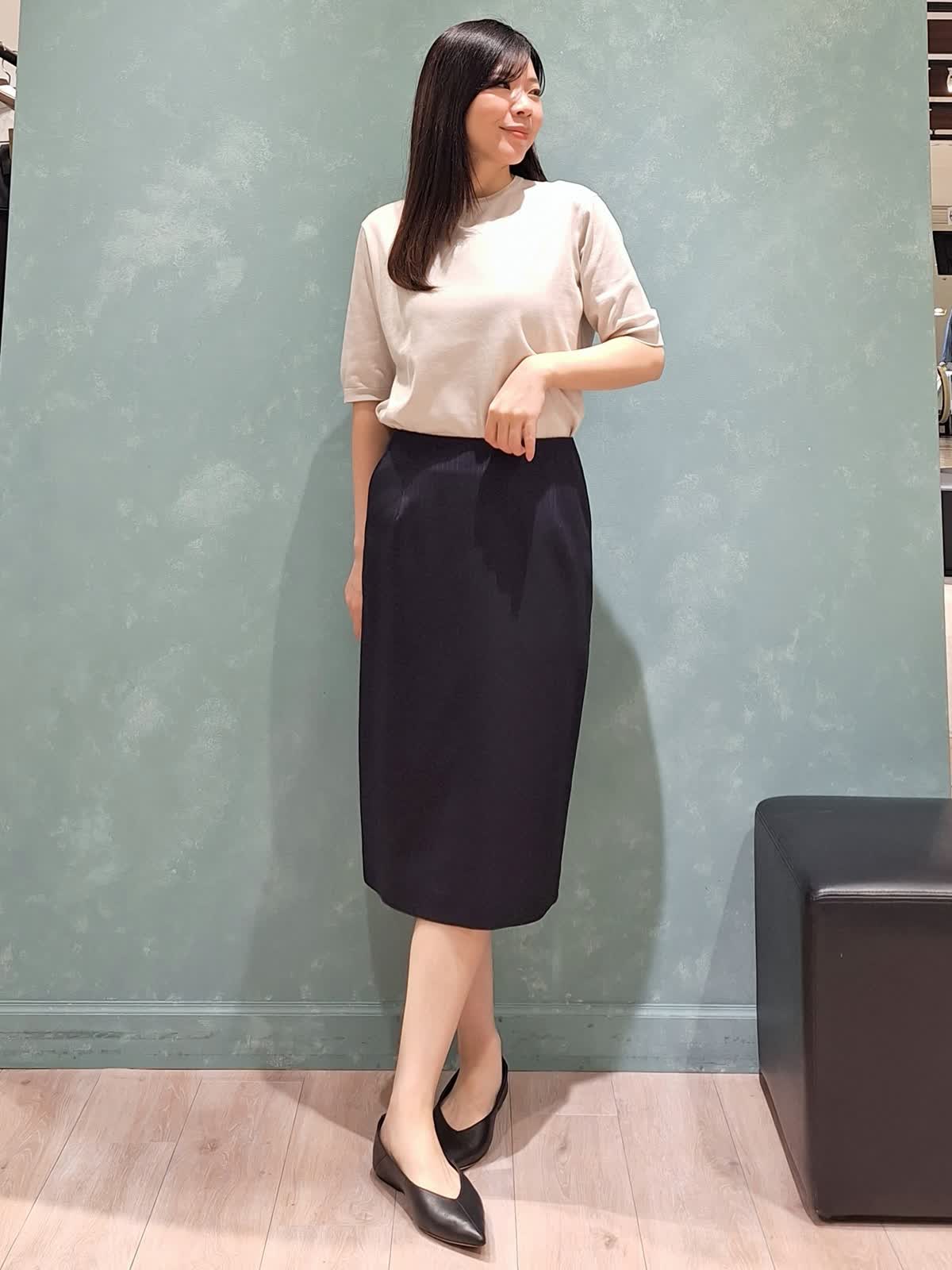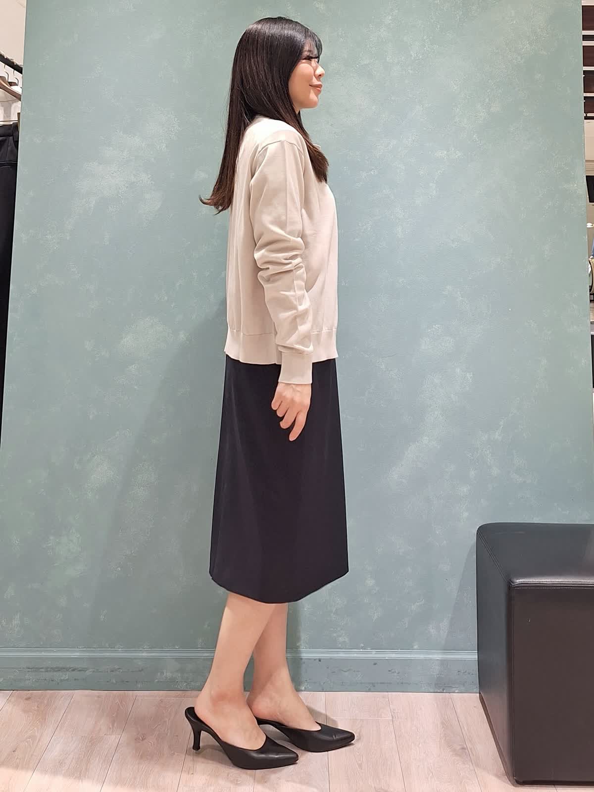 【着用サイズ、カラー】カーディガン、プルオーバー:9号、グレーベージュ スカート、ジャケット:7号、ネイビー 《オフィスSTYLE》秋冬大人気だったFF30ゲージニット、春夏は綿素材で登場!肌触りが抜群で至福の着心地です。カーディガンはなんにでも合わせやすいベーシックなデザイン。プルオーバーは五分袖でカーディガン無しでも安心です。どちらもゆったり着ていただけるサイズ感です。ボトムはシルクウールスーツのタイトスカート。ストライプ柄で軽やかさがあります。