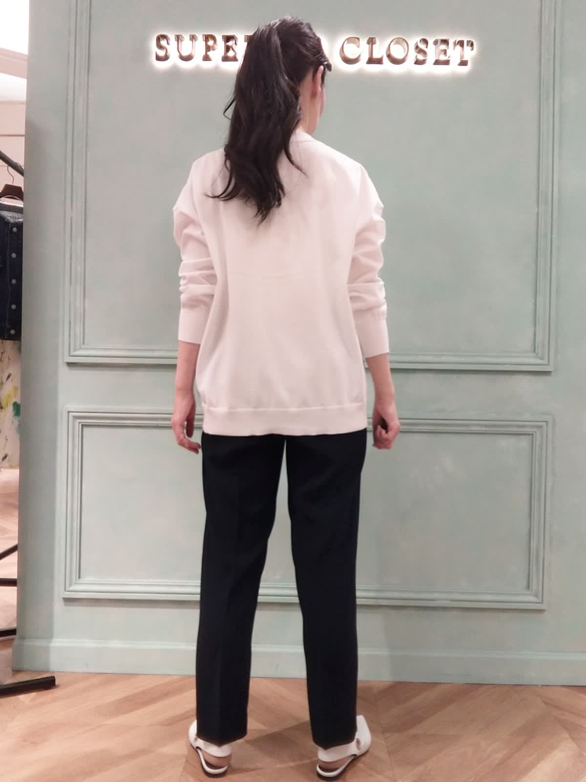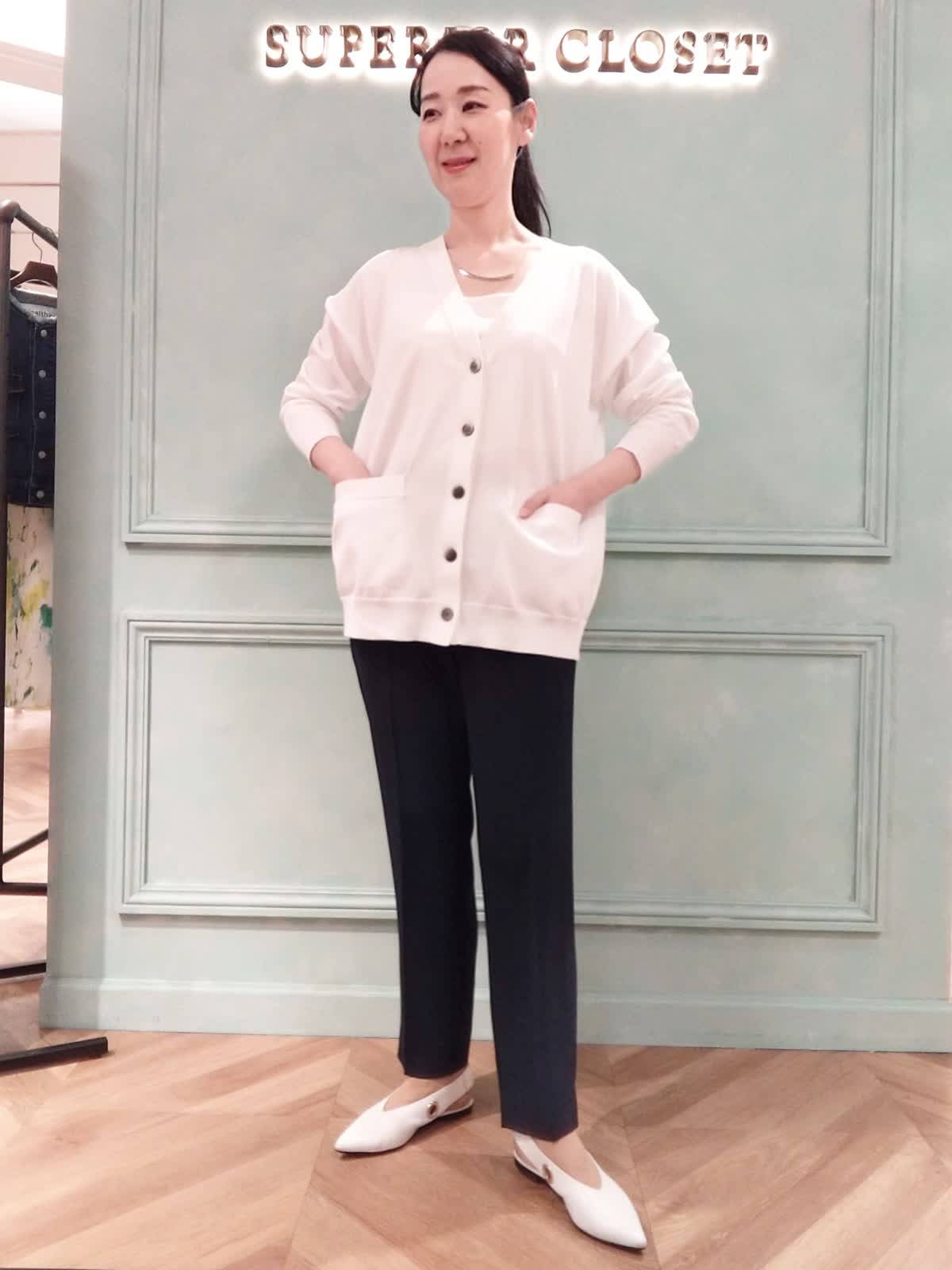 【着用サイズ】カーディガン:9号、キャミソール:9号、パンツ:9号 【着用カラー】カーディガン:オフホワイト、キャミソール:ホワイト、パンツ:ネイビー 通勤、オフィススタイル。清潔感よある白×ネイビーのコーディネート。カーディガンはキャミソール重ねで1枚着のニットとして着用。両方ポケットがあり、デザイン性と実用性を兼ね備えた1枚です。テーパードパンツは落ち感がある素材でスッキリシルエット!シワにならずにお家で洗えるイージーケアです。