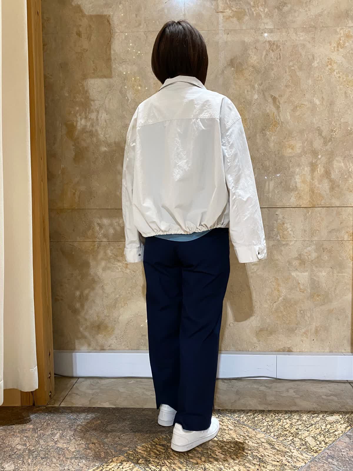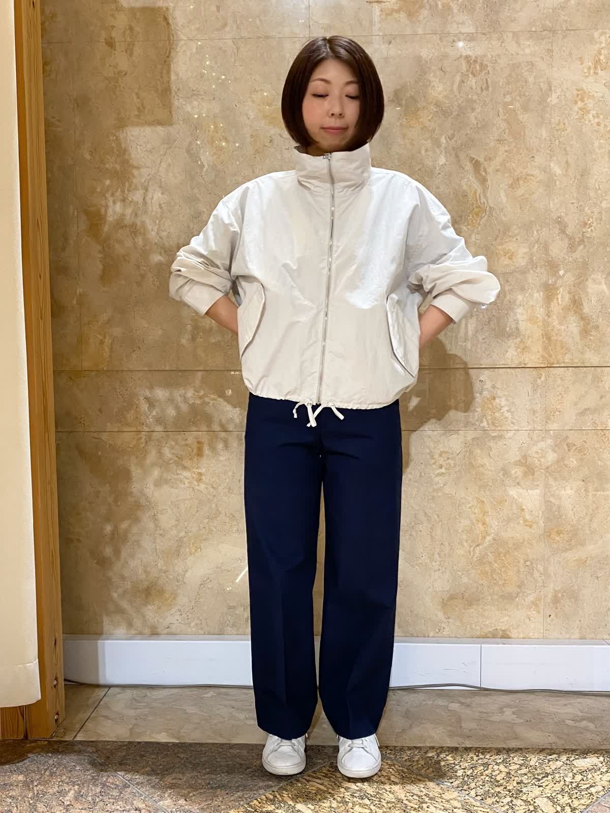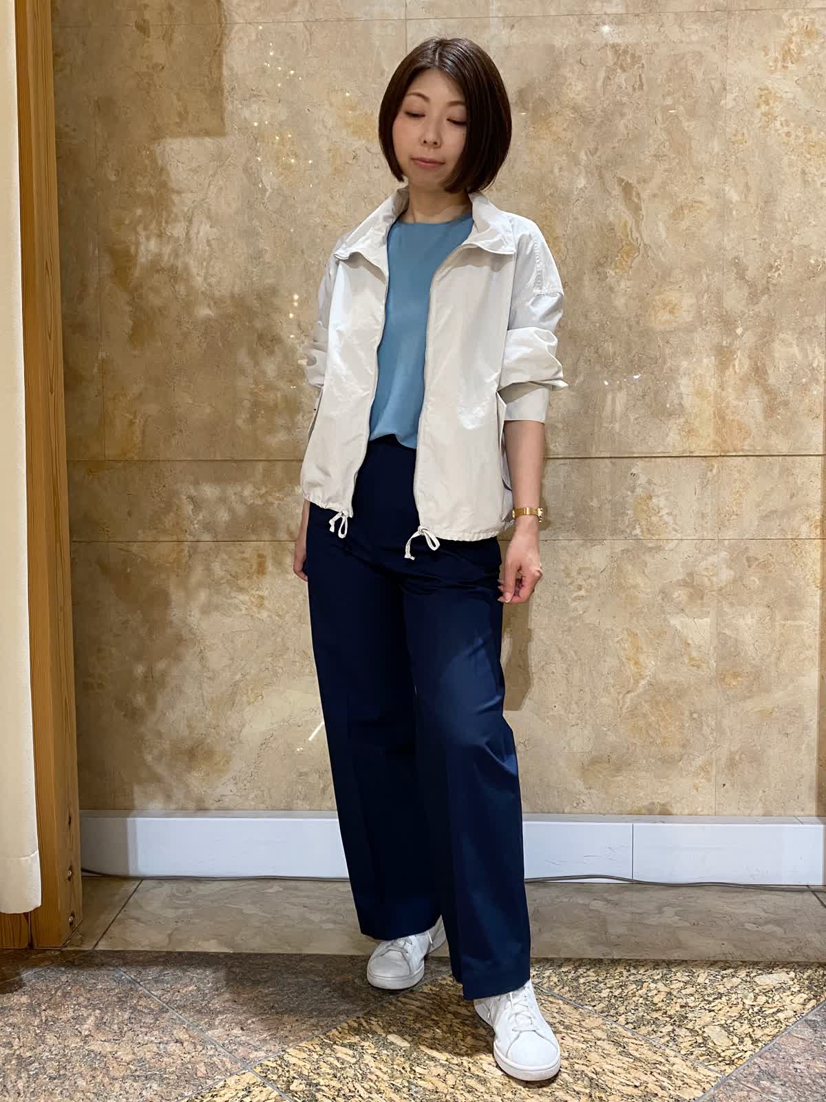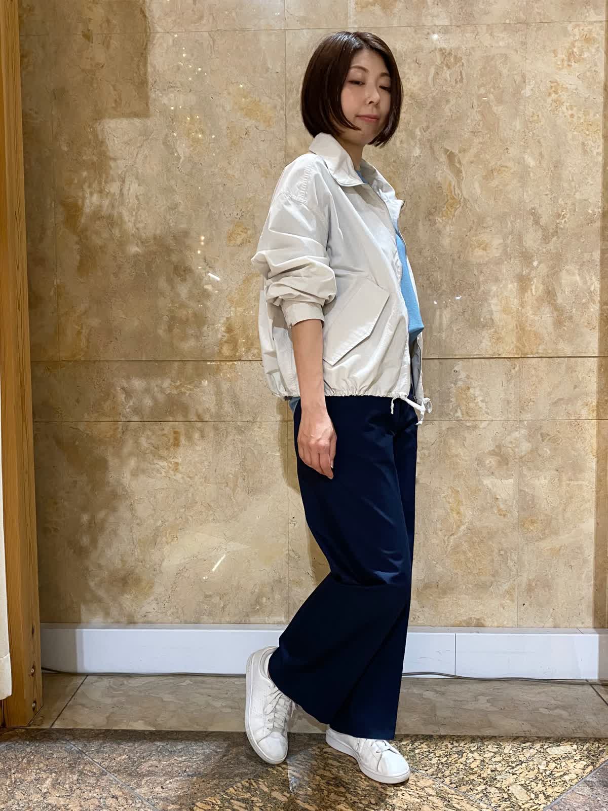 【着用サイズ/カラー】 ブルゾン:フリーサイズ/ グレーベージュ ニット:フリーサイズ/ブルーグレー パンツ:9号/ネイビー スポーティーカジュアルコーデ。シャツ感覚で着られる薄手で軽いブルゾンをさらっと羽織って、動きやすくて楽ちんなお出かけスタイル。