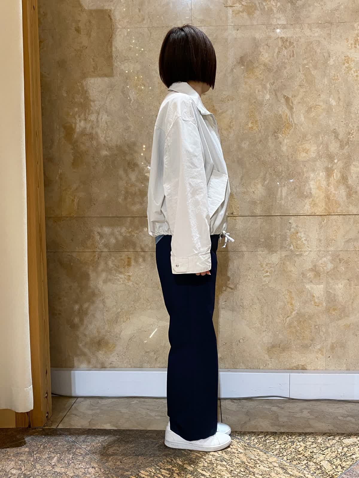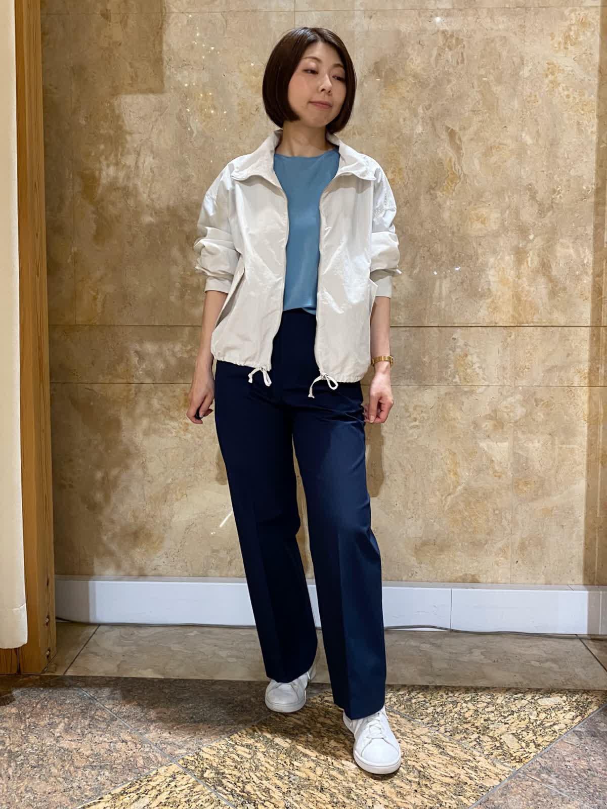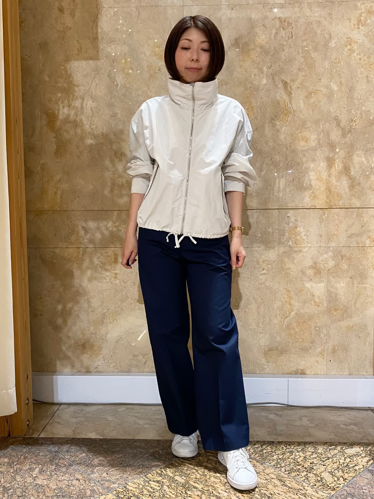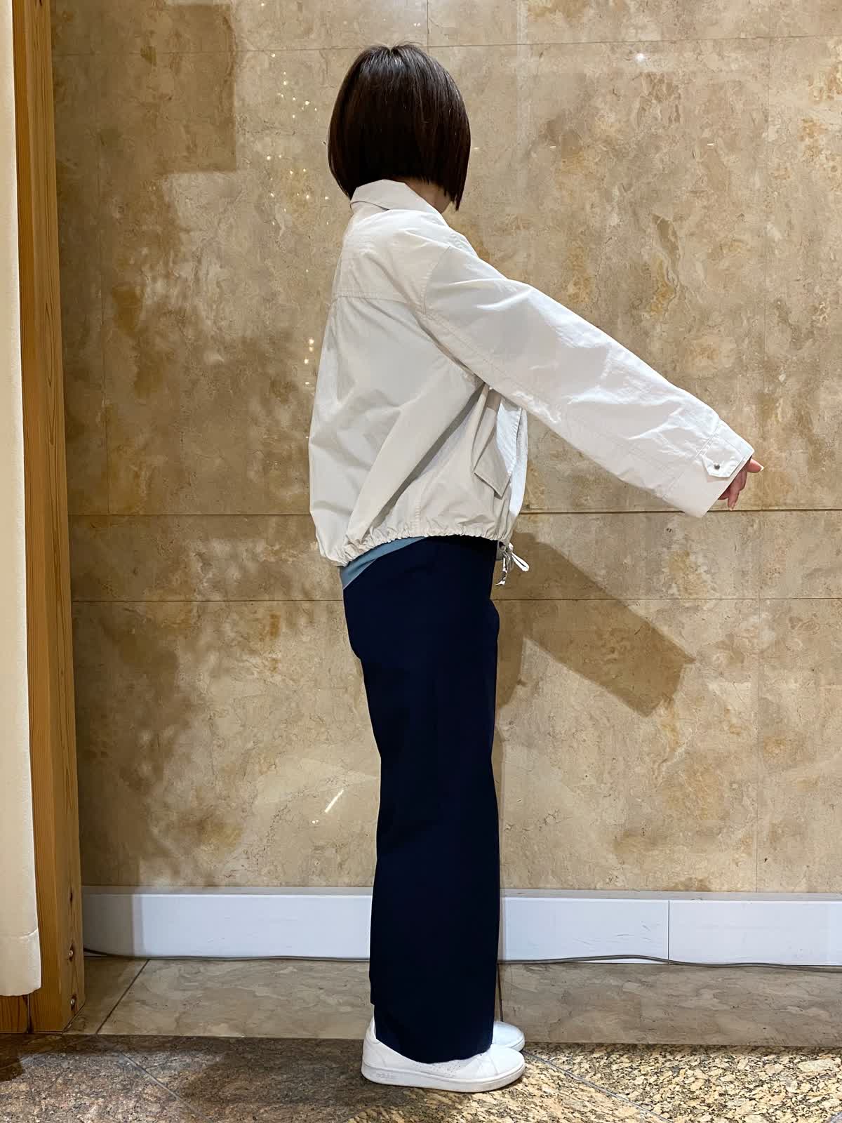 【着用サイズ/カラー】 ブルゾン:フリーサイズ/ グレーベージュ ニット:フリーサイズ/ブルーグレー パンツ:9号/ネイビー スポーティーカジュアルコーデ。シャツ感覚で着られる薄手で軽いブルゾンをさらっと羽織って、動きやすくて楽ちんなお出かけスタイル。