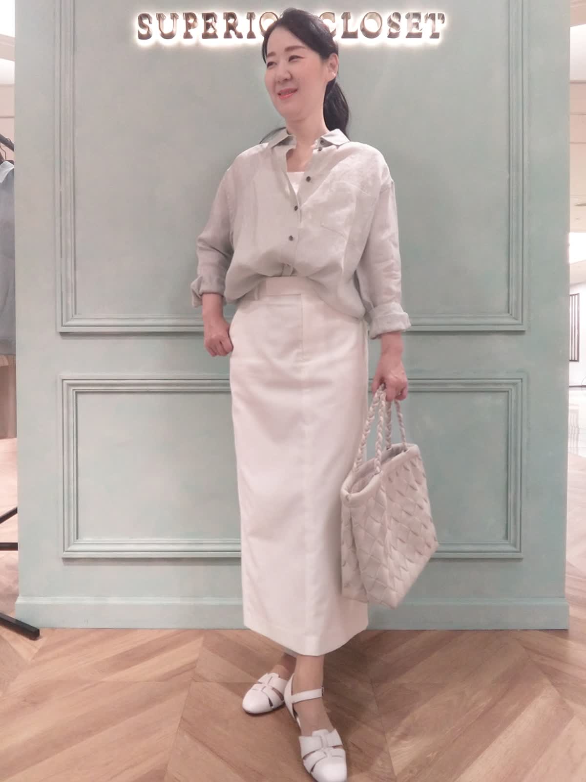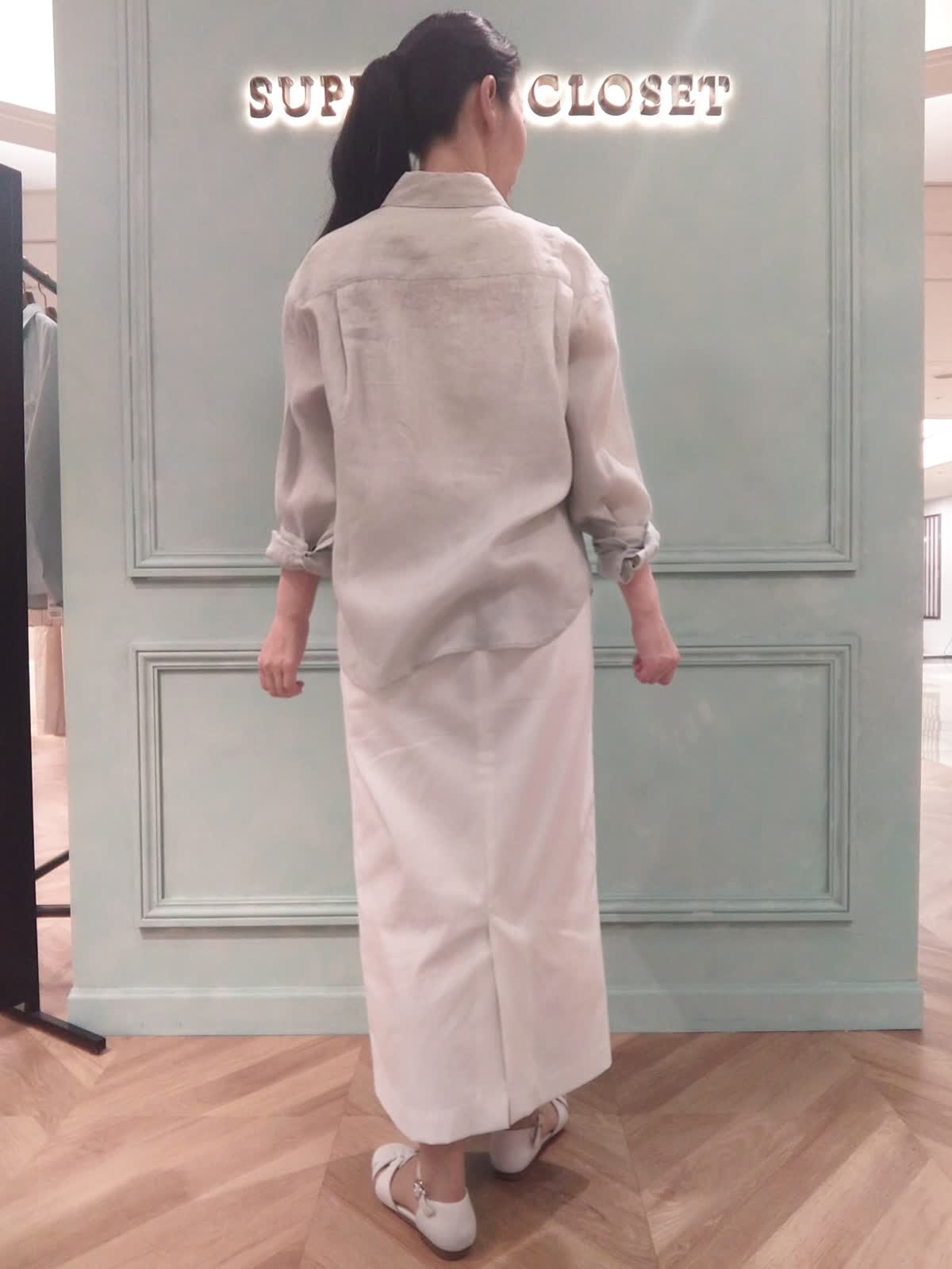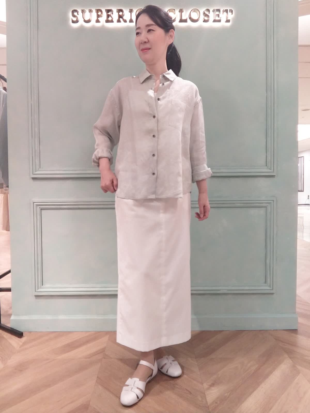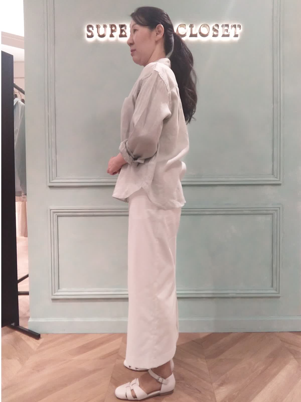 【着用サイズ】ブラウス:9号、キャミソール9号、スカート:9号 【着用カラー】ブラウス:ペールグリーン、キャミソール:ホワイト、スカート:オフホワイト さらっと着られるリネンシャツスタイル。少し汗ばむ季節にさらっと着られる長袖リネンシャツ。袖口を折り返して白のスカート合わせで少し抜け感のある着こなしに!ニュアンスのあるペールグリーンのカラーは優しく涼しげな印象になります。