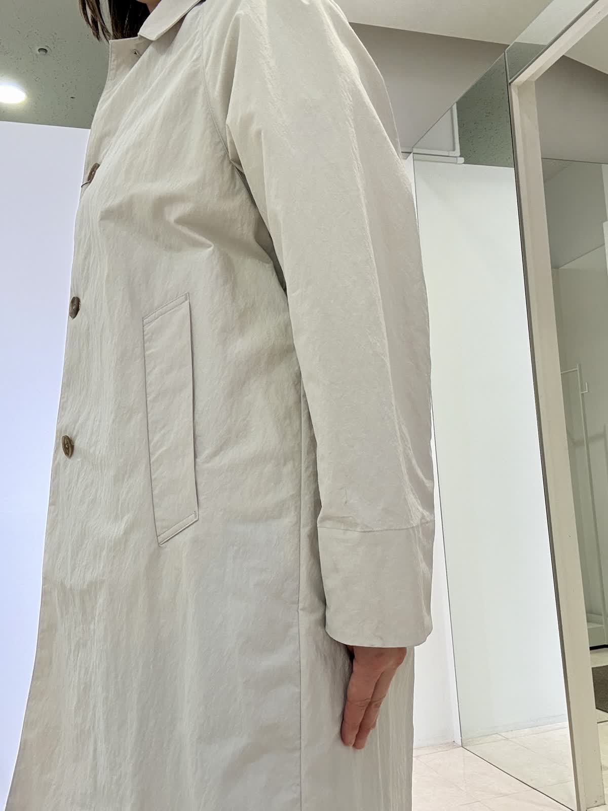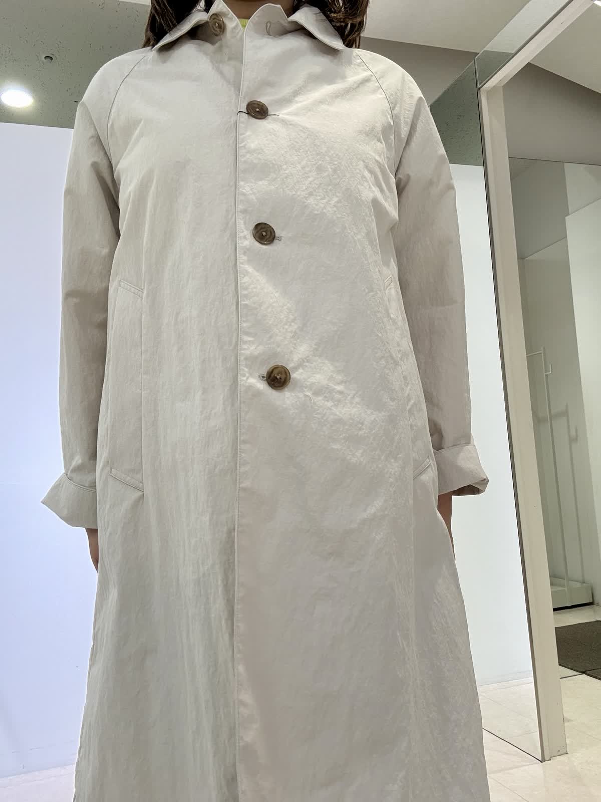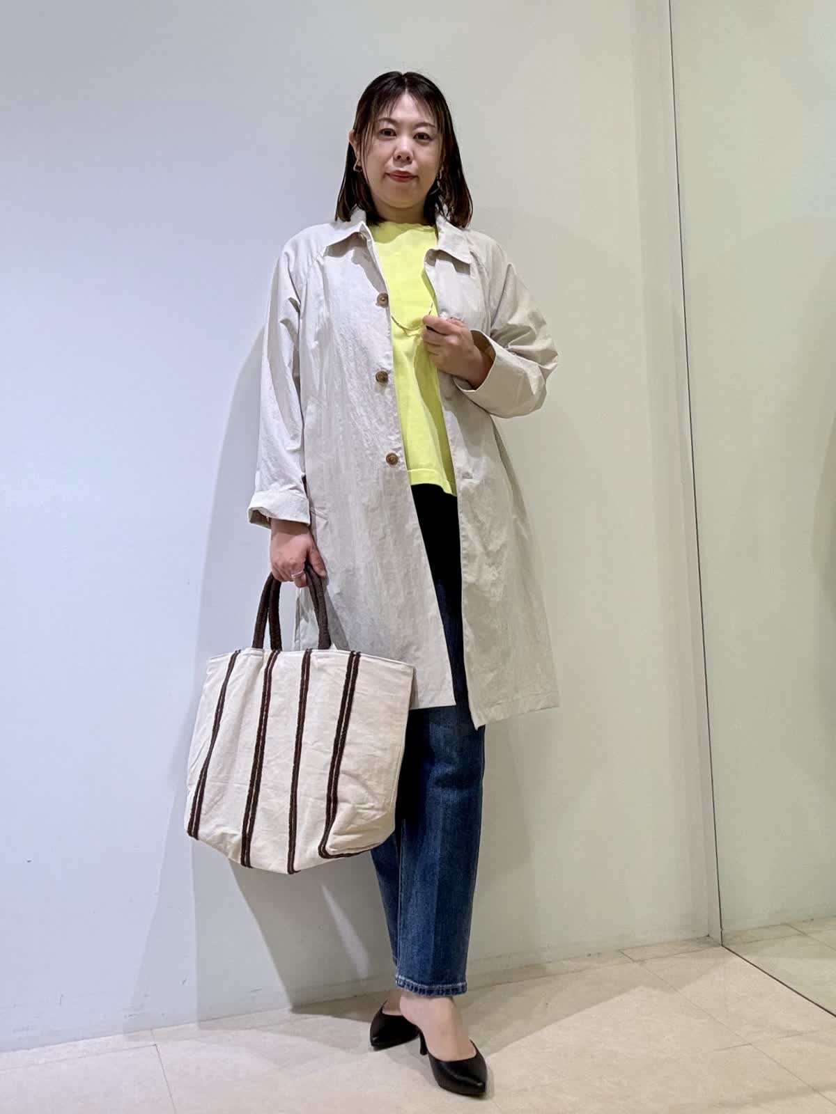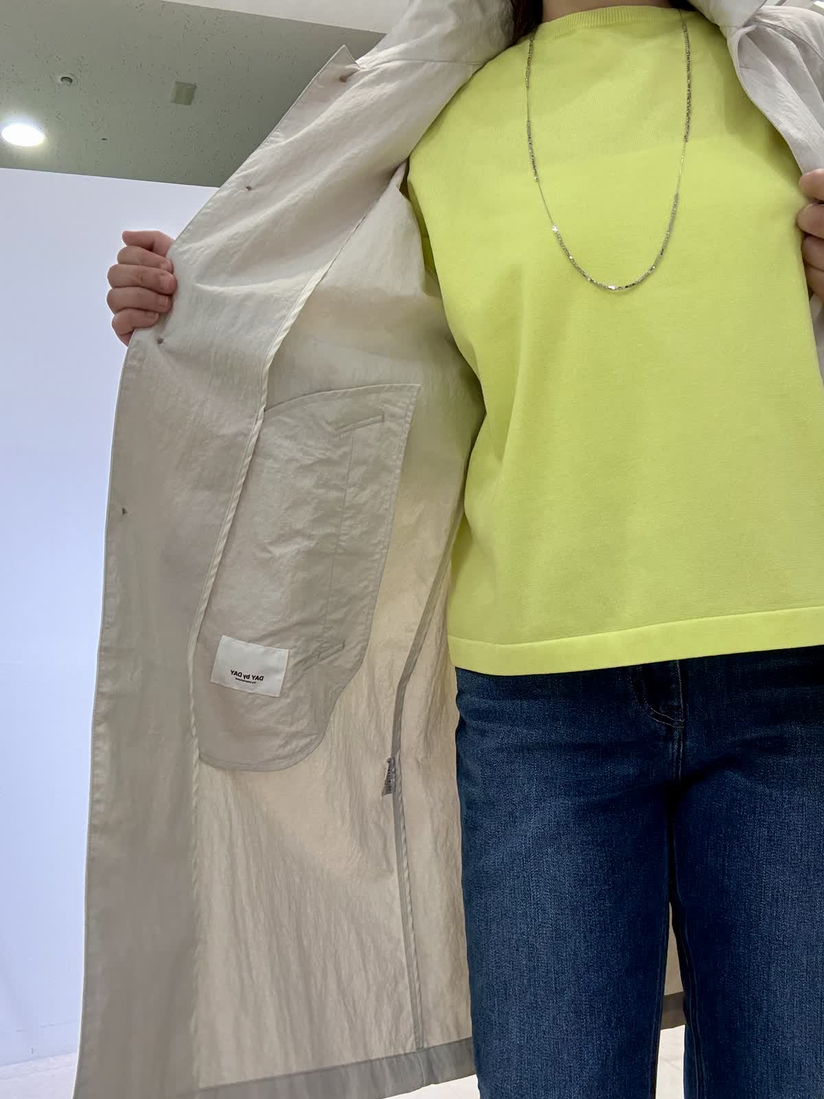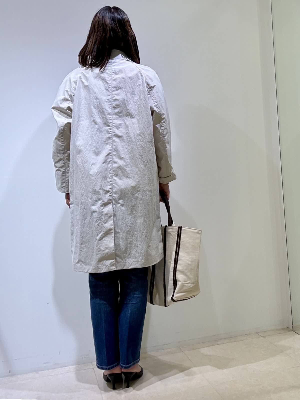 コート着用サイズ 11号 ナイロン仕様のステンカラーコートです。軽くて、何にでも合わせやすいコートです。お仕事や、フレッシャーズの方もジャケットの上に羽織っても窮屈になりません。ニット着用サイズ 9号 オーバーサイズで後ろと前の丈が違うのでヒップラインも隠れます。 デニム着用サイズ 11号 膝下からスリムになっているデニムです。スッキリとしたシルエットで、ストレッチが入っています。