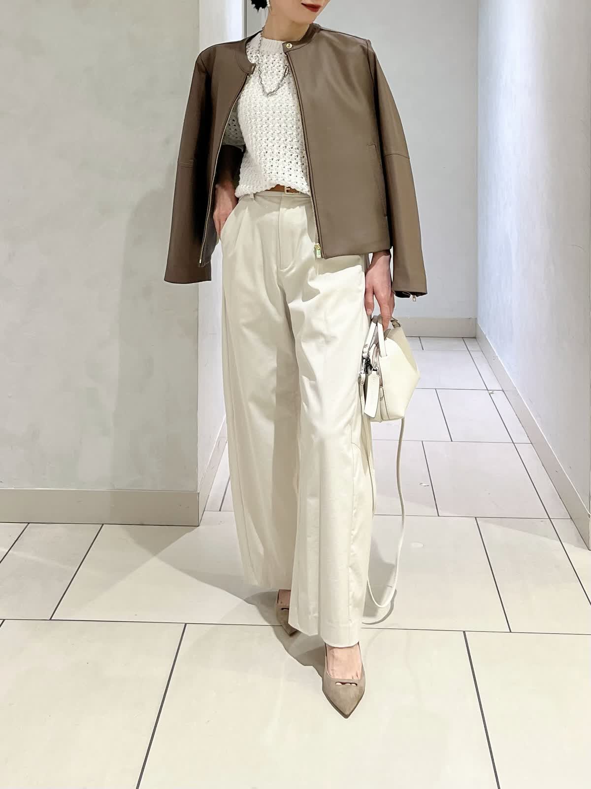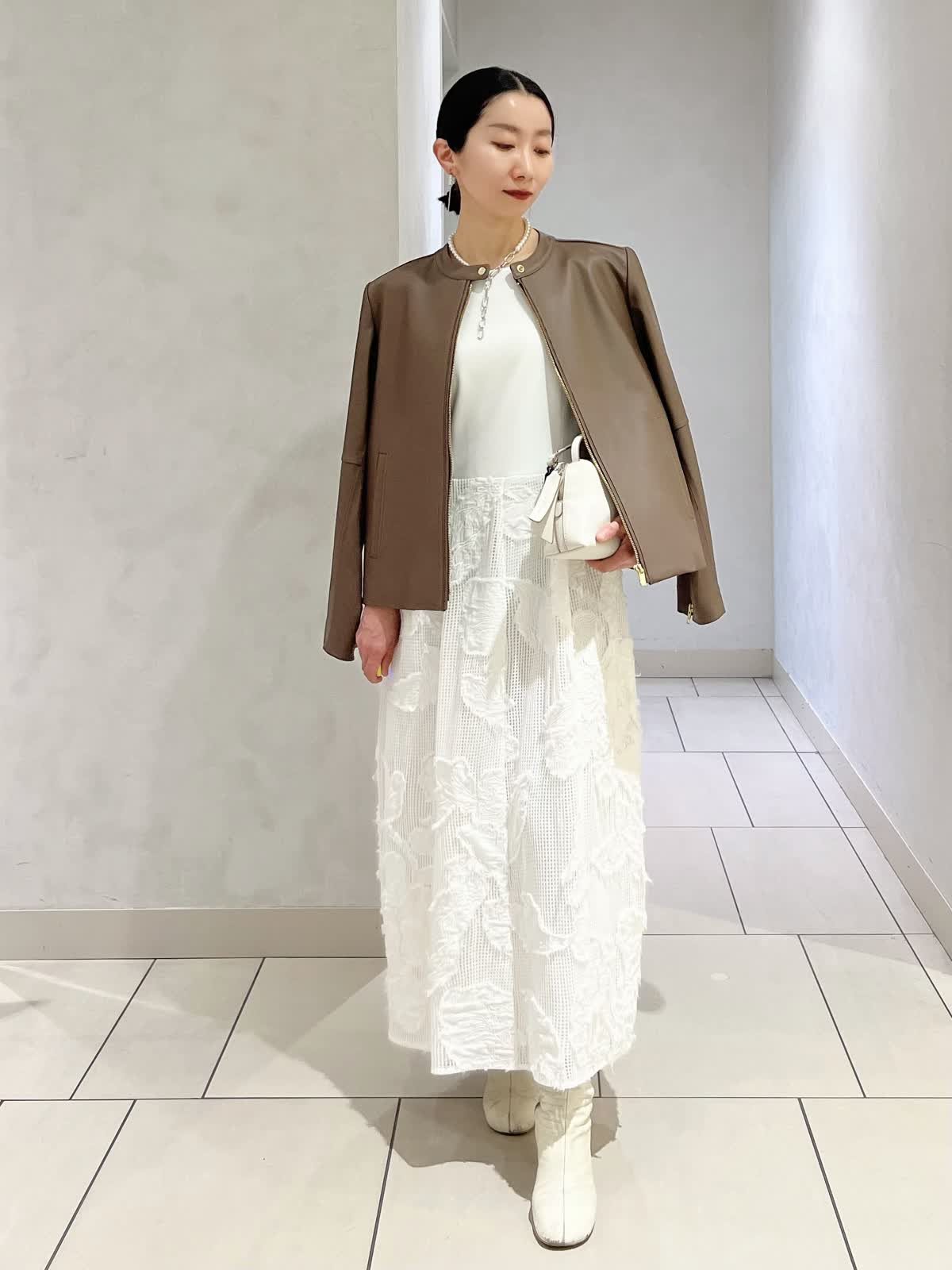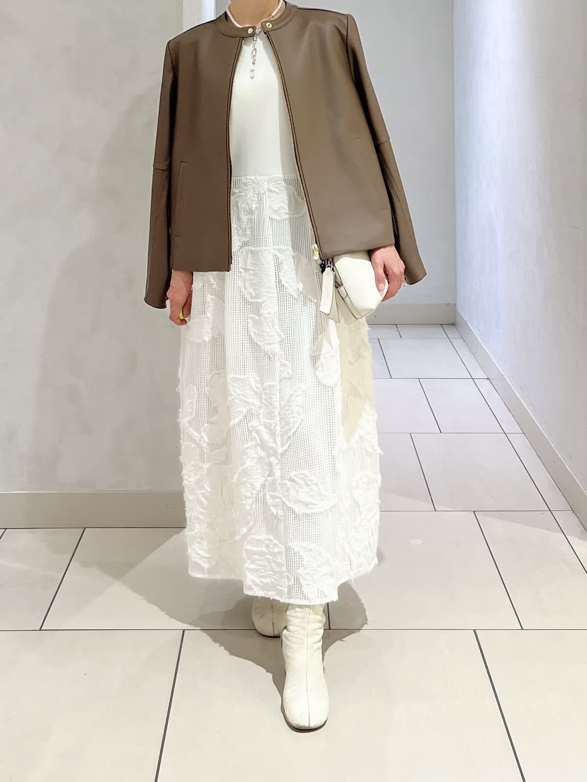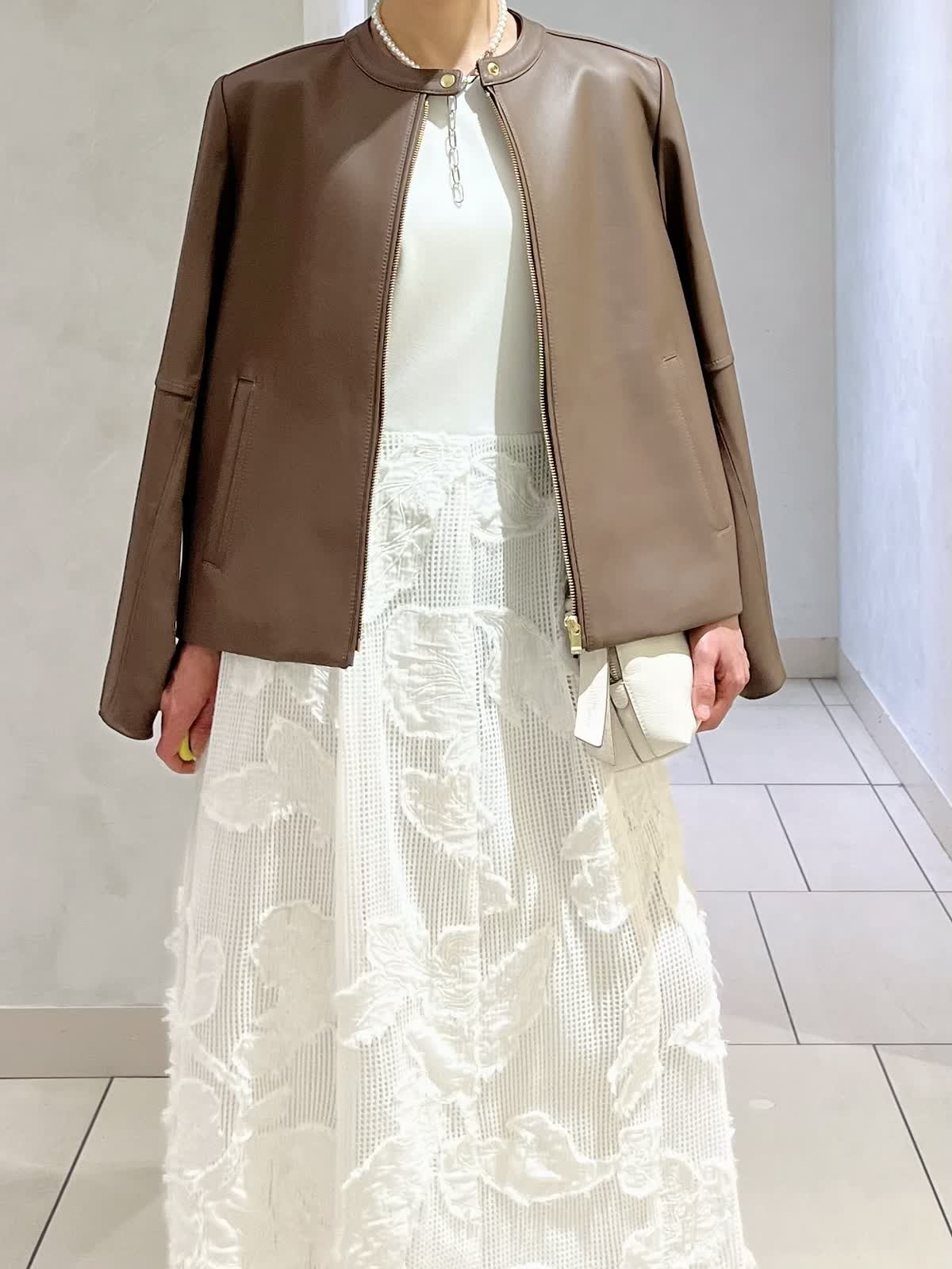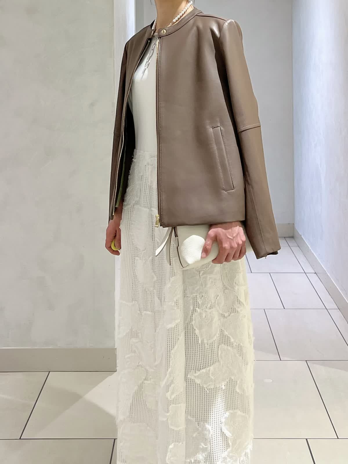 【カラー・サイズ】ブルゾン:ブラウン・9号 ワンピース:アイボリー・9号 ブラウンのレザージャケットは、コンパクトな丈感とすっきりとしたシルエットで、さらりと羽織るだけで洗練された印象に。ミニマルなフロントデザインが、落ち着きのある大人の雰囲気を引き立てます。