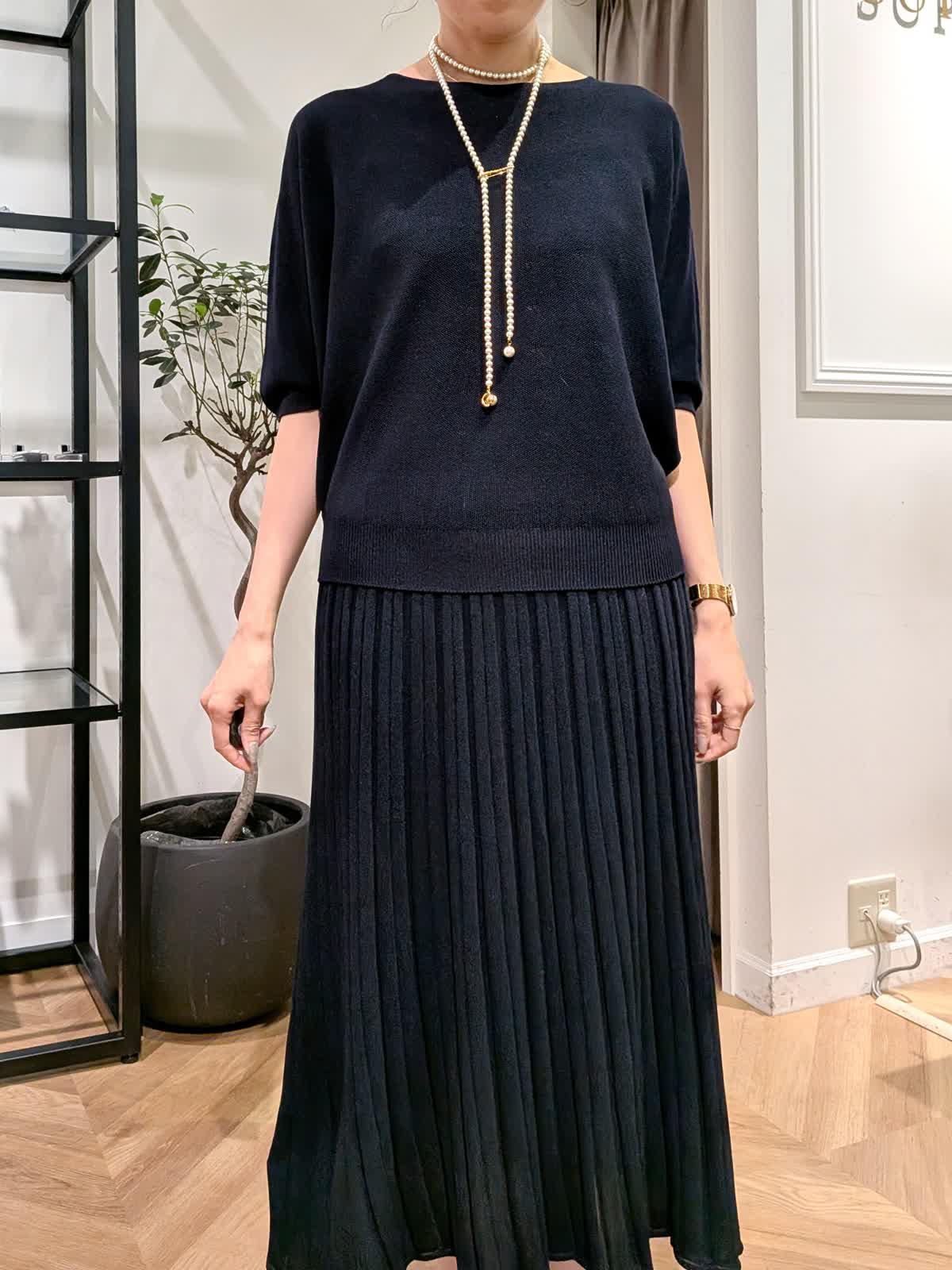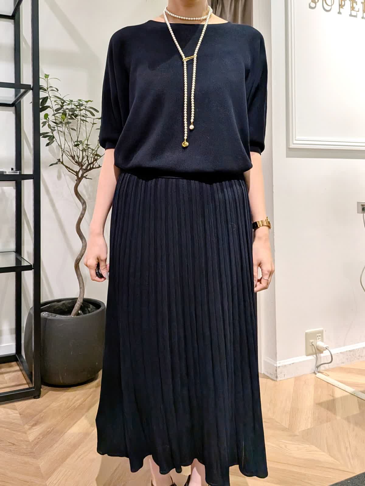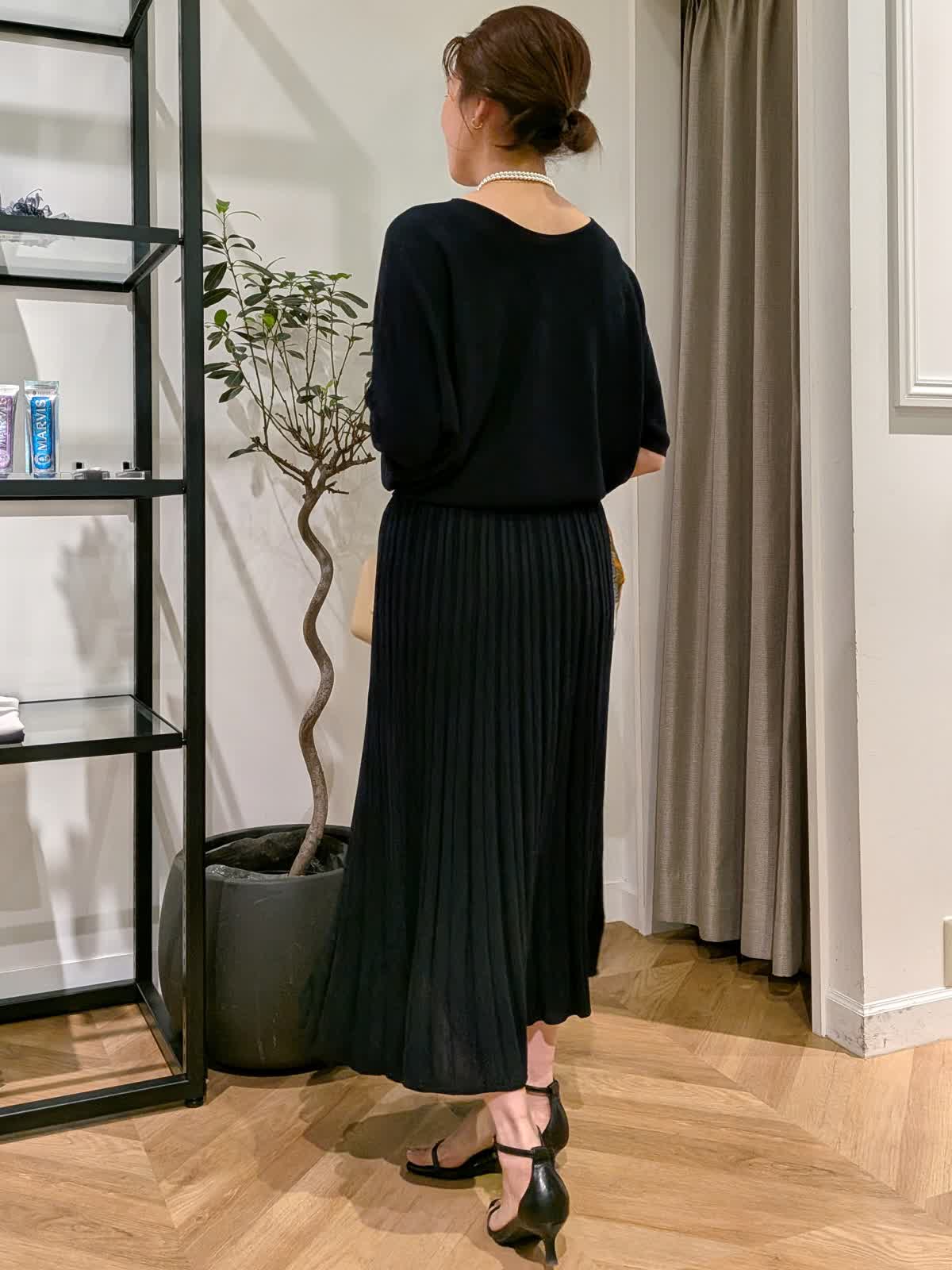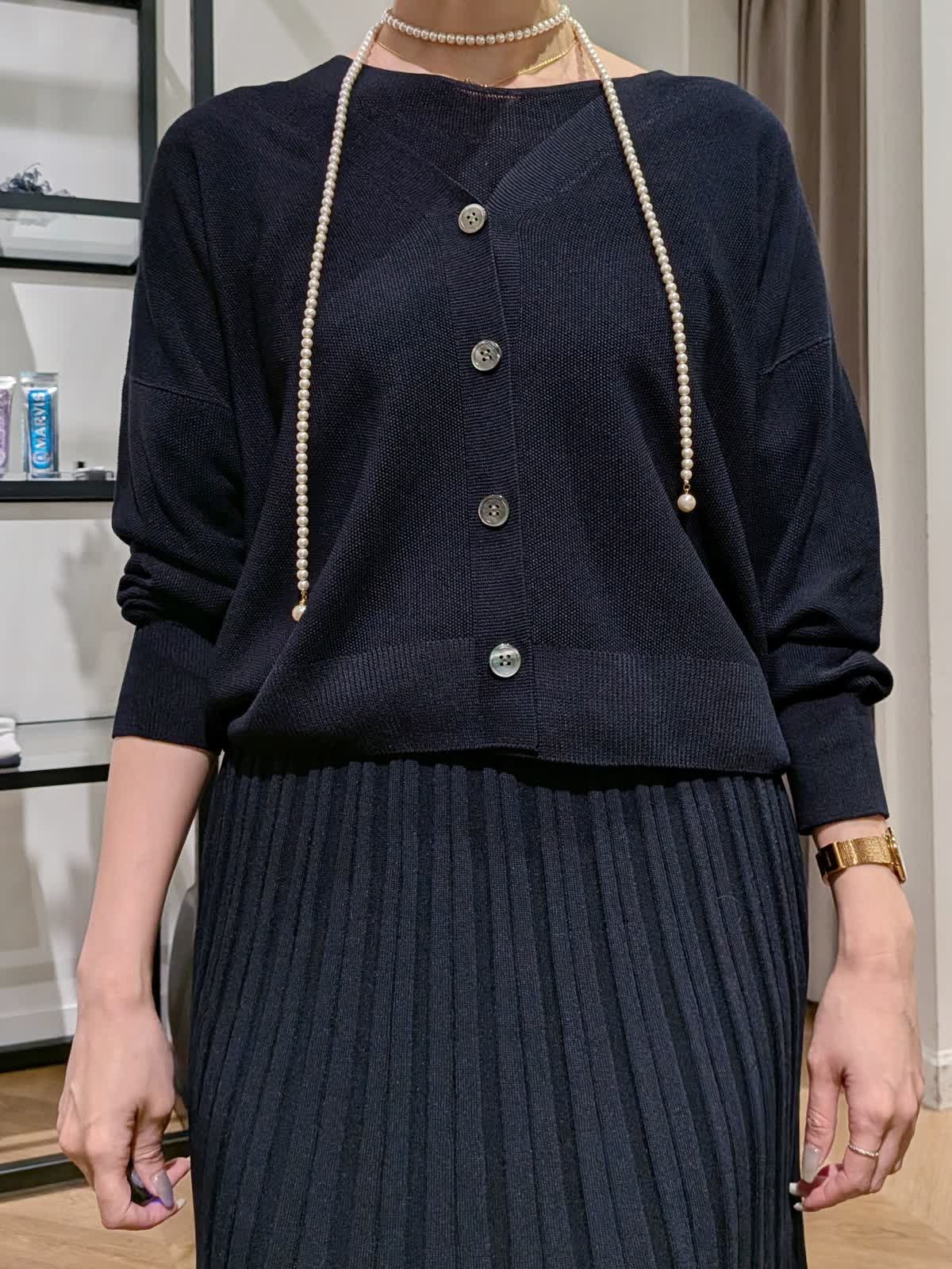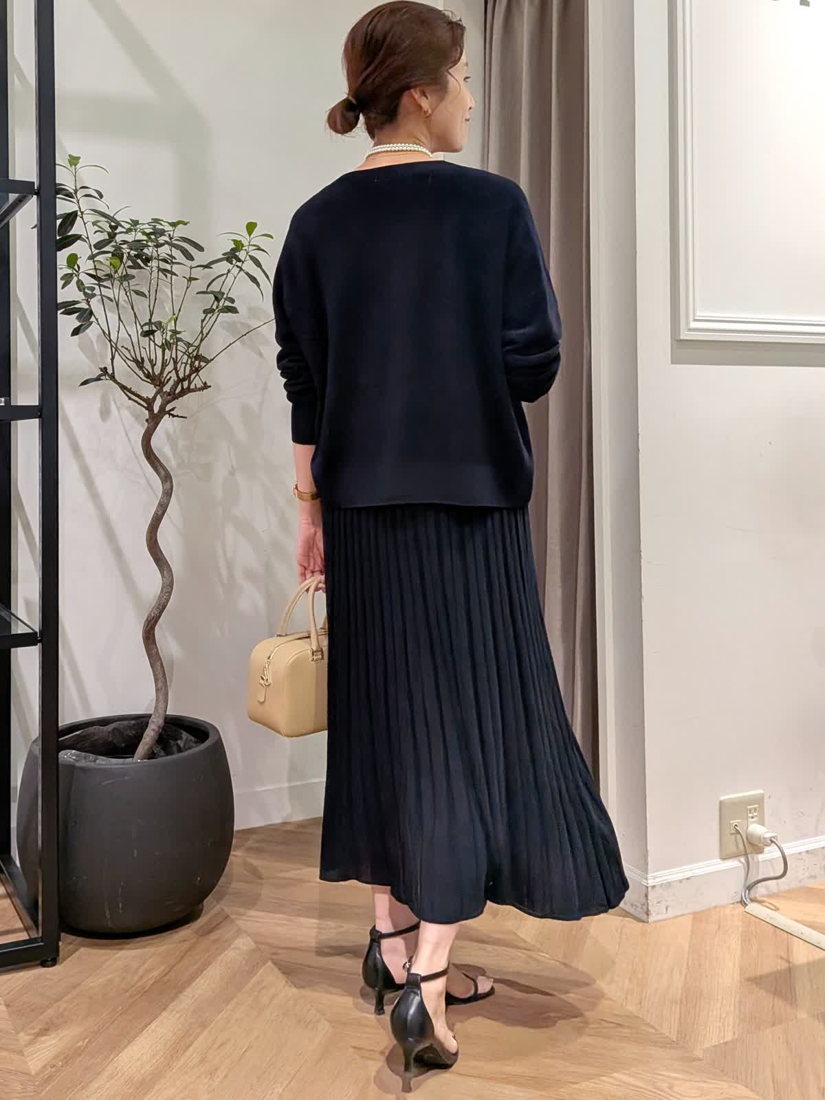 【着用サイズ】カーデガン?ダークネイビー?9号 ニット?ダークネイビー?9号 スカート?ダークネイビー?11号 大人気cuooシリーズ エレガントにもラフにも◎ 程よい落ち感が上品でニットは7分袖、カーデガンは長袖。春?秋までしっかりお使いいただけます。 首元も開きすぎずインしなくても好きな位置で止めていただけます。気になる所をカバーしてくれて細見えが叶うシリーズ是非おためしくださいませ。