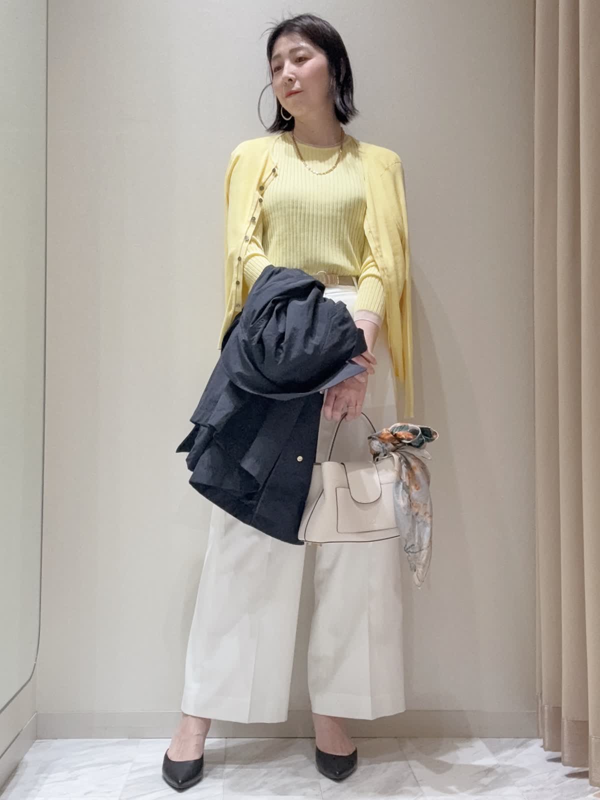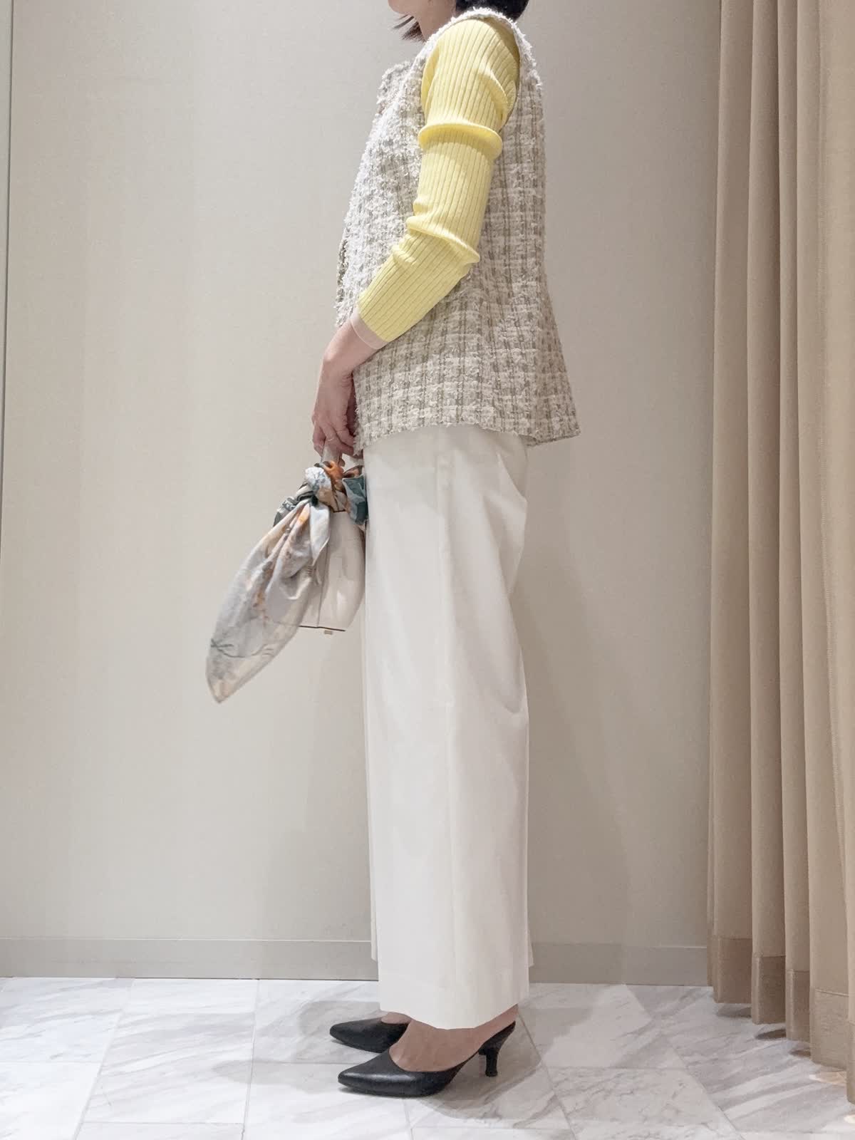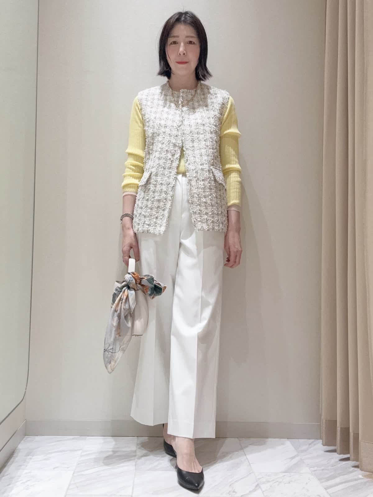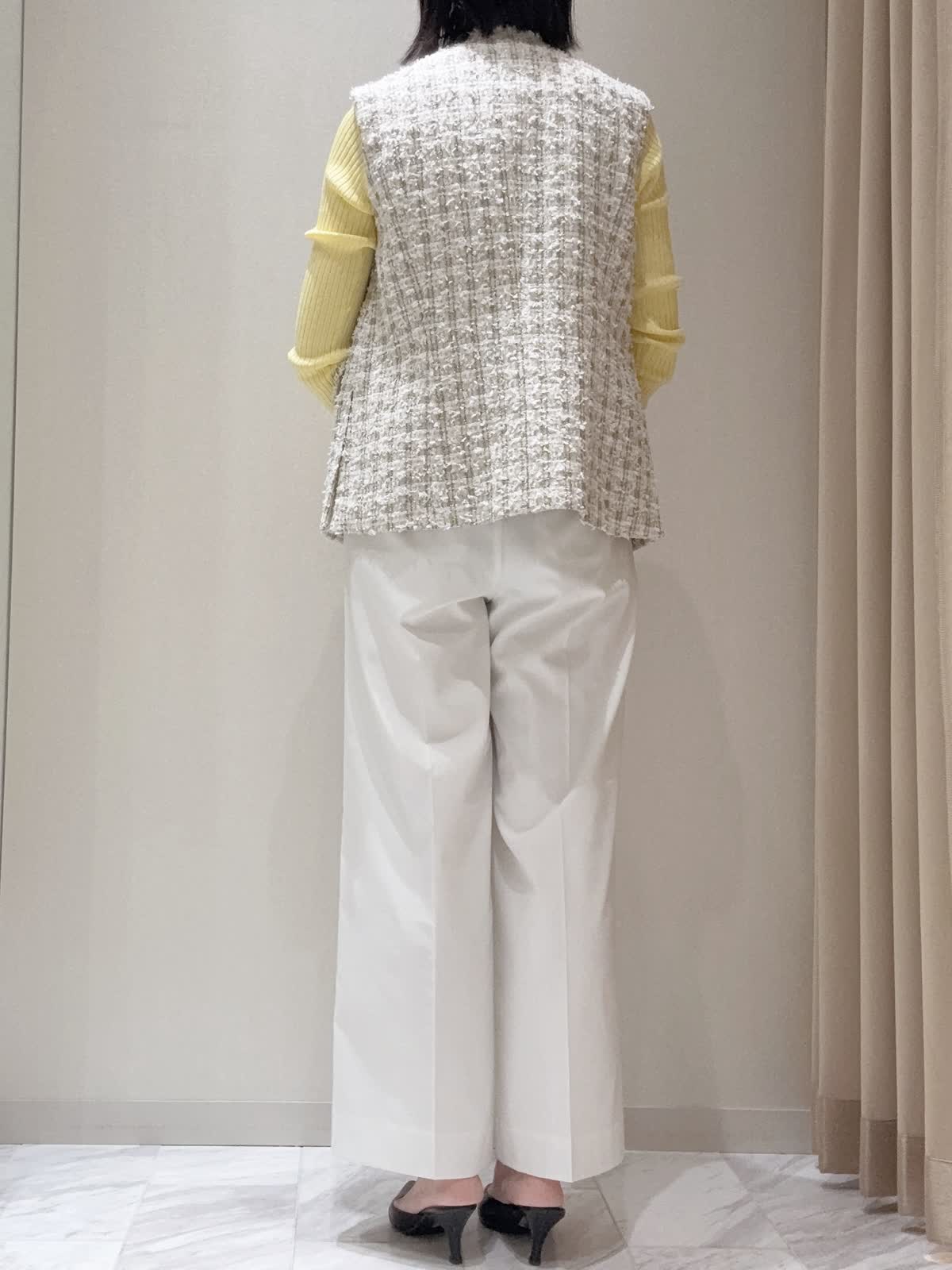 【着用サイズ】全て:9号 【着用カラー】ジレ:ベージュ カーディガン:イエロー ニット: イエロー パンツ: ホワイト バッグ: ホワイト ゆとりを持たせたボディとヒップにかかるミドル丈でリラックス感のあるジレ。シャツやカットソー、ワンピースなどさまざまなアイテムとのレイヤードをお楽しみいただけ、コーディネートに華やかさをもたらしてくれる上質なアイテムです。デイリーからオフィスシーンまで幅広いスタイリングで活躍してくれるアイテムです。